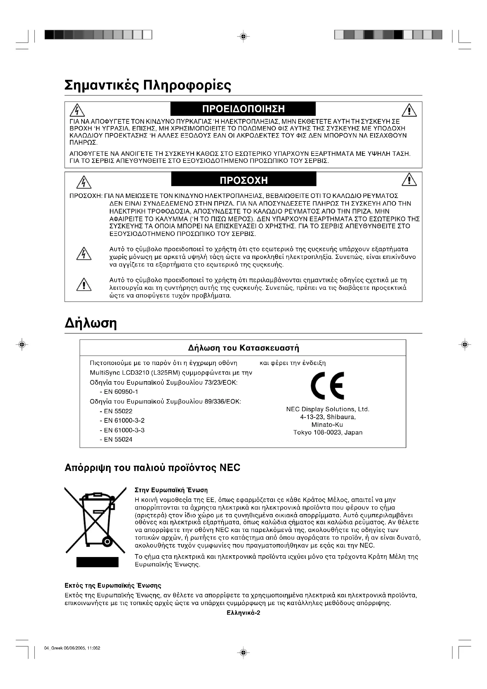∆ήλωση του Κατασκευαστή Πιστοποιούµε µε το παρν τι η έγχρωµη οθνη MultiSync LCD3210 (L325RM) συµµορφώνεται µε την Οδηγία του Ευρωπαϊκού Συµβουλίου 73/23/ΕΟΚ: - ΕN 60950-1 Οδηγία του Ευρωπαϊκού Συµβουλίου 89/336/ΕΟΚ: - ΕN 55022 - EN 61000-3-2 - EN 61000-3-3 - ΕN 55024 και φέρει την ένδειξη NEC Display Solutions, Ltd. 4-13-23, Shibaura, Minato-Ku Tokyo 108-0023, Japan Σηµαντικές Πληροφορίες ΓΙΑ ΝΑ ΑΠΟΦΥΓΕΤΕ ΤΟΝ ΚΙΝ∆ΥΝΟ ΠΥΡΚΑΓΙΑΣ ‘Η ΗΛΕΚΤΡΟΠΛΗΞΙΑΣ, ΜΗΝ ΕΚΘΕΤΕΤΕ ΑΥΤΗ ΤΗ ΣΥΣΚΕΥΗ ΣΕ ΒΡΟΧΗ ‘Η ΥΓΡΑΣΙΑ. ΕΠΙΣΗΣ, ΜΗ ΧΡΗΣΙΜΟΠΟΙΕΙΤΕ ΤΟ ΠΟΛΩΜΕΝΟ ΦΙΣ ΑΥΤΗΣ ΤΗΣ ΣΥΣΚΕΥΗΣ ΜΕ ΥΠΟ∆ΟΧΗ ΚΑΛΩ∆ΙΟΥ ΠΡΟΕΚΤΑΣΗΣ ‘Η ΑΛΛΕΣ ΕΞΟ∆ΟΥΣ ΕΑΝ ΟΙ ΑΚΡΟ∆ΕΚΤΕΣ ΤΟΥ ΦΙΣ ∆ΕΝ ΜΠΟΡΟΥΝ ΝΑ ΕΙΣΑΧΘΟΥΝ
