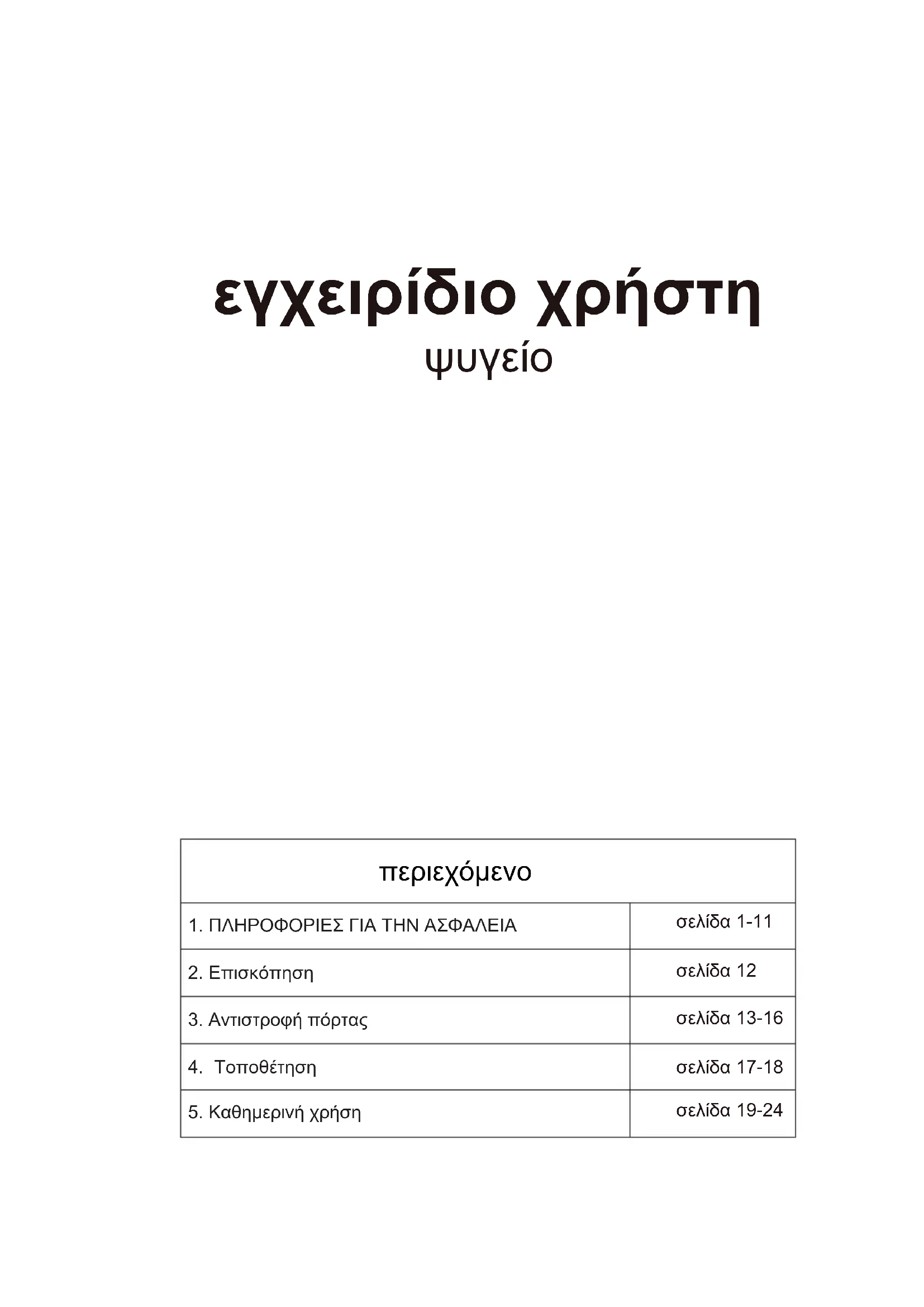 σελίδα 1-11 σελίδα 12 σελίδα 13-16 σελίδα 17-18 σελίδα 19-24Σας ευχαριστούμε για την αγορά αυτού του προϊόντος. Πριν χρησιμοποιήσετε το ψυγείο σας, σας παρακαλούμε να διαβάσετε προσεκτικά αυτό το εγχειρίδιο οδηγιών χρήσης έτσι ώστε να μεγιστοποιήσετε την απόδοση του. Φυλάξτε όλα τα έγγραφα για μελλοντική χρήση ή για άλλους ιδιοκτήτες. Αυτό το προϊόν προορίζεται αποκλειστικά για οικιακή χρήση ή παρόμοιες εφαρμογές όπως: - την περιοχή της κουζίνας για προσωπικό καταστημάτων, γραφείων και άλλα περιβάλλοντα εργασίας - σε φάρμες, από πελάτες σε ξενοδοχεία, πανδοχεία και άλλα περιβάλλοντα οικιακού