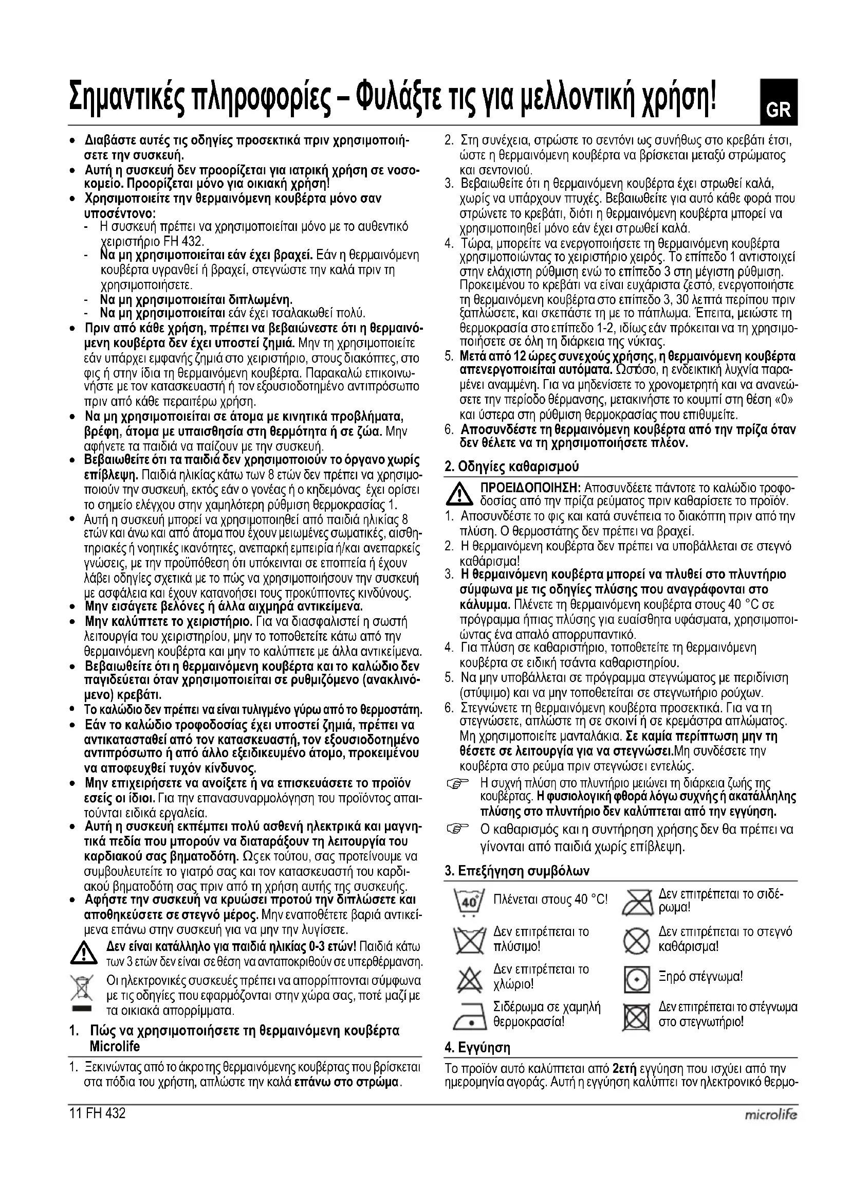 Πλένεται στους 40 °C! Δεν επιτρέπεται το σιδέ- Δεν επιτρέπεται το Δεν επιτρέπεται το στεγνό Δεν επιτρέπεται το χλώριο!Ξηρό στέγνωμα!Σιδέρωμα σε χαμηλή θερμοκρασία! Δεν επιτρέπεται το στέγνωμα στο στεγνωτήριο!12FH 432 στάτη, το καλώδιο και την ίδια τη θερμαινόμενη κουβέρτα. Η εγγύηση δεν καλύπτει περιπτώσεις λανθασμένης χρήσης, ατυχήματα ή ζημιά που έχουν προκληθεί λόγω της μη τήρησης των οδηγιών ή λόγω τροποποιήσεων στο προϊόν οι οποίες δεν διεξήχθησαν από τον κατα-