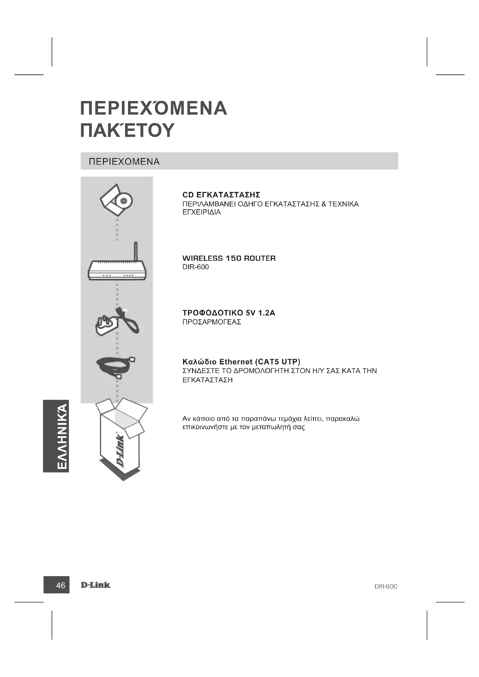 ΠΕΡΙΕΧΟΜΕΝΑ CD ΕΓΚΑΤΑΣΤΑΣΗΣ ΠΕΡΙΛΑΜΒΑΝΕΙ ΟΔΗΓΟ ΕΓΚΑΤΑΣΤΑΣΗΣ & ΤΕΧΝΙΚΑ ΕΓΧΕΙΡΙΔΙΑ WIRELESS 150 ROUTER DIR-600ΤΡΟΦΟΔΟΤΙΚΟ 5V 1.2AΠΡΟΣΑΡΜΟΓΕΑΣΚαλώδιο Ethernet (CAT5 UTP)ΣΥΝΔΕΣΤΕ ΤΟ ΔΡΟΜΟΛΟΓΗΤΗ ΣΤΟΝ Η/Υ ΣΑΣ ΚΑΤΑ ΤΗΝ ΕΓΚΑΤΑΣΤΑΣΗΑν κάποιο από τα παραπάνω τεμάχια λείπει, παρακαλώ επικοινωνήστε με τον μεταπωλητή σαςDIR-600
