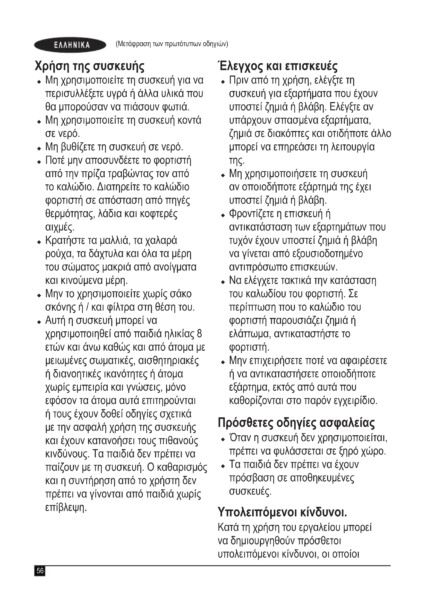 u Κρατήστε τα μαλλιά, τα χαλαρά ρούχα, τα δάχτυλα και όλα τα μέρη του σώματος μακριά από ανοίγματα και κινούμενα μέρη. u Μην το χρησιμοποιείτε χωρίς σάκο σκόνης ή / και φίλτρα στη θέση του. u Αυτή η συσκευή μπορεί να χρησιμοποιηθεί από παιδιά ηλικίας 8 ετών και άνω καθώς και από άτομα με μειωμένες σωματικές, αισθητηριακές ή διανοητικές ικανότητες ή άτομα χωρίς εμπειρία και γνώσεις, μόνο εφόσον τα άτομα αυτά επιτηρούνται ή τους έχουν δοθεί οδηγίες σχετικά με την ασφαλή χρήση της συσκευής και έχουν κατανοήσει τους πιθανούς κινδύνους. Τα παιδιά δεν πρέπει να παίζουν με τη συσκευή. Ο καθαρισμός και η συντήρηση από το χρήστη δεν πρέπει να γίνονται από παιδιά χωρίς