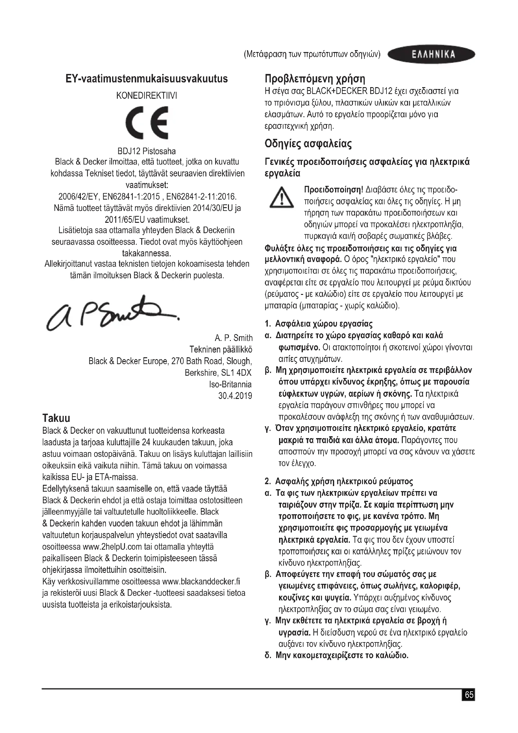 Δήλωση συμμόρφωσης EK ΟΔΗΓΙΑ ΠΕΡΙ ΜΗΧΑΝΗΜΑΤΩΝ BDJ12 Σέγα Η Black & Decker δηλώνει ότι τα προϊόντα αυτά που περιγράφονται στα "τεχνικά χαρακτηριστικά" συμμορφώνονται με τα ακόλουθα: 2006/42/ΕΚ, EN62841-1:2015, EN62841-2-11:2016. Αυτά τα προϊόντα συμμορφώνονται και με την Οδηγία 2014/30/ΕΕ και 2011/65/ΕΕ. Για περισσότερες πληροφορίες, επικοινωνήστε με την Black & Decker στην παρακάτω διεύθυνση ή ανατρέξτε στο πίσω μέρος του εγχειριδίου. Ο κάτωθι υπογεγραμμένος είναι υπεύθυνος για την κατάρτιση του τεχνικού φακέλου και δηλώνει τα παρόντα εκ μέρους της Black & Decker. A. P. Smith Τεχνικός Διευθυντής Black & Decker Europe, 270 Bath Road, Slough, Berkshire, SL1 4DX United Kingdom 30/04/2019
