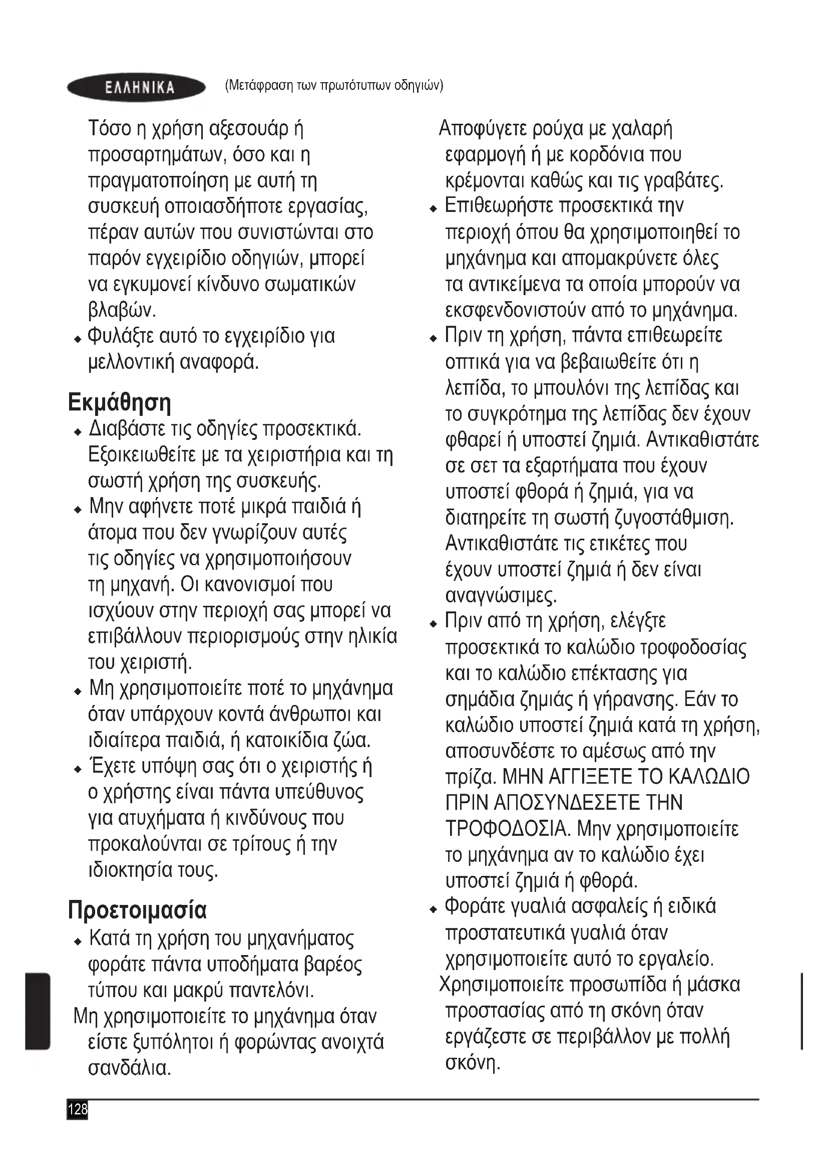 u Διαβάστε τις οδηγίες προσεκτικά. Εξοικειωθείτε με τα χειριστήρια και τη σωστή χρήση της συσκευής. u Μην αφήνετε ποτέ μικρά παιδιά ή άτομα που δεν γνωρίζουν αυτές τις οδηγίες να χρησιμοποιήσουν τη μηχανή. Οι κανονισμοί που ισχύουν στην περιοχή σας μπορεί να επιβάλλουν περιορισμούς στην ηλικία του χειριστή. u Μη χρησιμοποιείτε ποτέ το μηχάνημα όταν υπάρχουν κοντά άνθρωποι και ιδιαίτερα παιδιά, ή κατοικίδια ζώα. u Έχετε υπόψη σας ότι ο χειριστής ή ο χρήστης είναι πάντα υπεύθυνος για ατυχήματα ή κινδύνους που προκαλούνται σε τρίτους ή την ιδιοκτησία τους. Προετοιμασία u Κατά τη χρήση του μηχανήματος φοράτε πάντα υποδήματα βαρέος τύπου και μακρύ παντελόνι. Μη χρησιμοποιείτε το μηχάνημα όταν είστε ξυπόλητοι ή φορώντας ανοιχτά