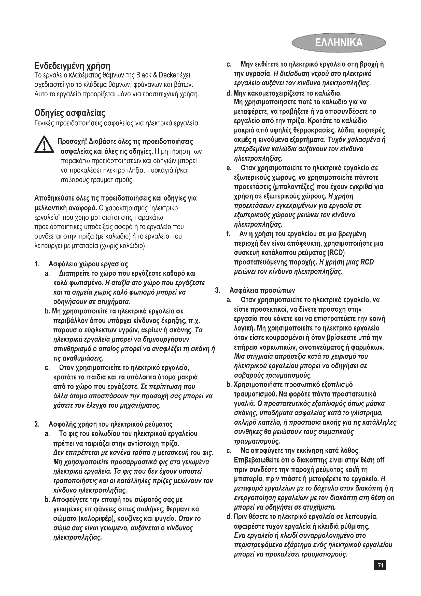 Ενδεδειγμένηχρήση Το εργαλείο κλαδέματος θάμνων της Black & Decker έχει σχεδιαστεί για το κλάδεμα θάμνων, φρύγανων και βάτων. Αυτο το εργαλείο προορίζεται μόνο για ερασιτεχνική χρήση. Οδηγίεςασφαλείας Γενικές προειδοποιήσεις ασφαλείας για ηλεκτρικά εργαλεία