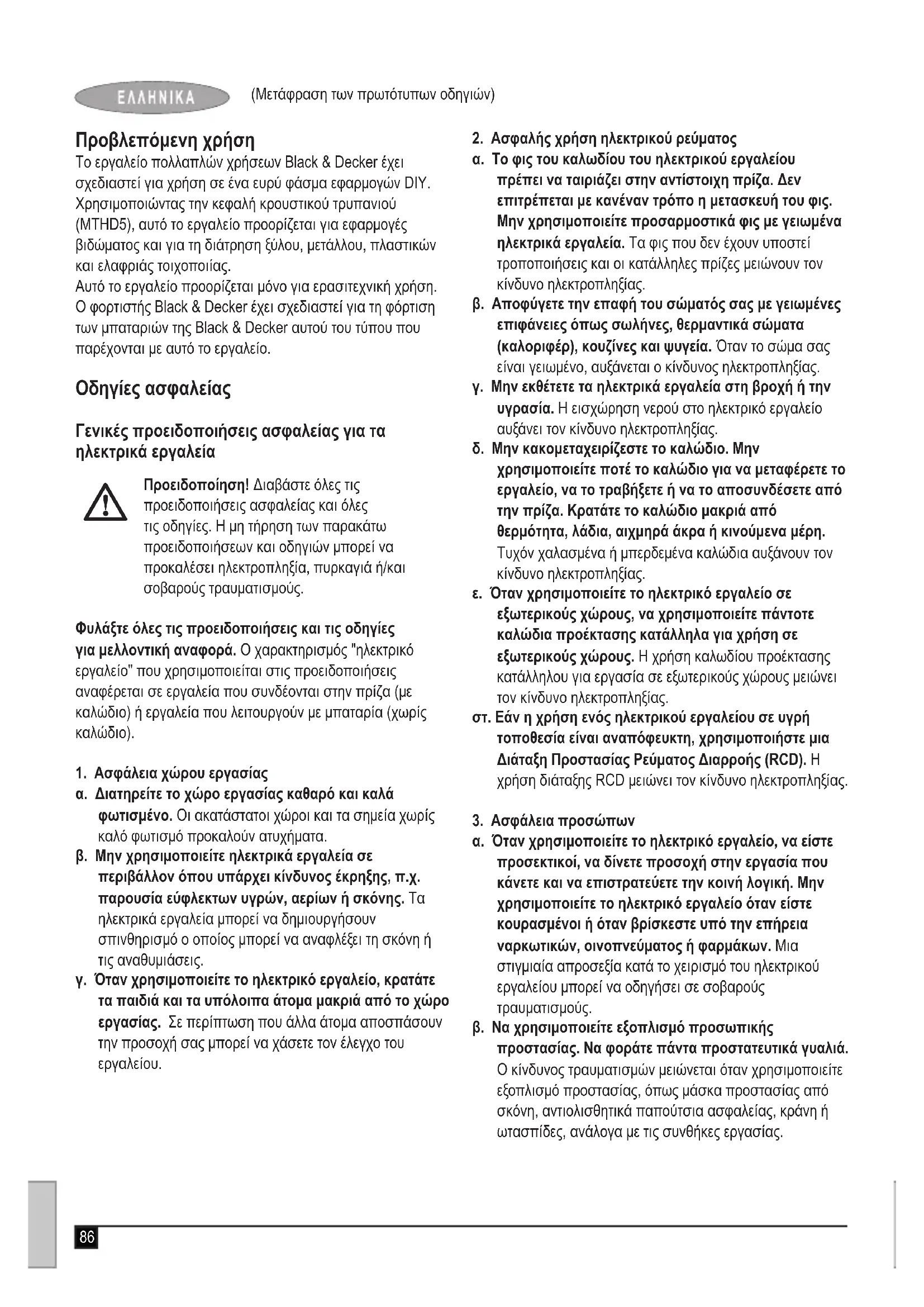 Προειδοποίηση! Για να μειωθεί ο κίνδυνος τραυματισμού, ο χρήστης πρέπει να διαβάσει το εγχειρίδιο οδηγιών. Ασφαλής χρήση ηλεκτρικού ρεύματος Συμπληρωματικές οδηγίες ασφαλείας για τις μπαταρίες και τους φορτιστές