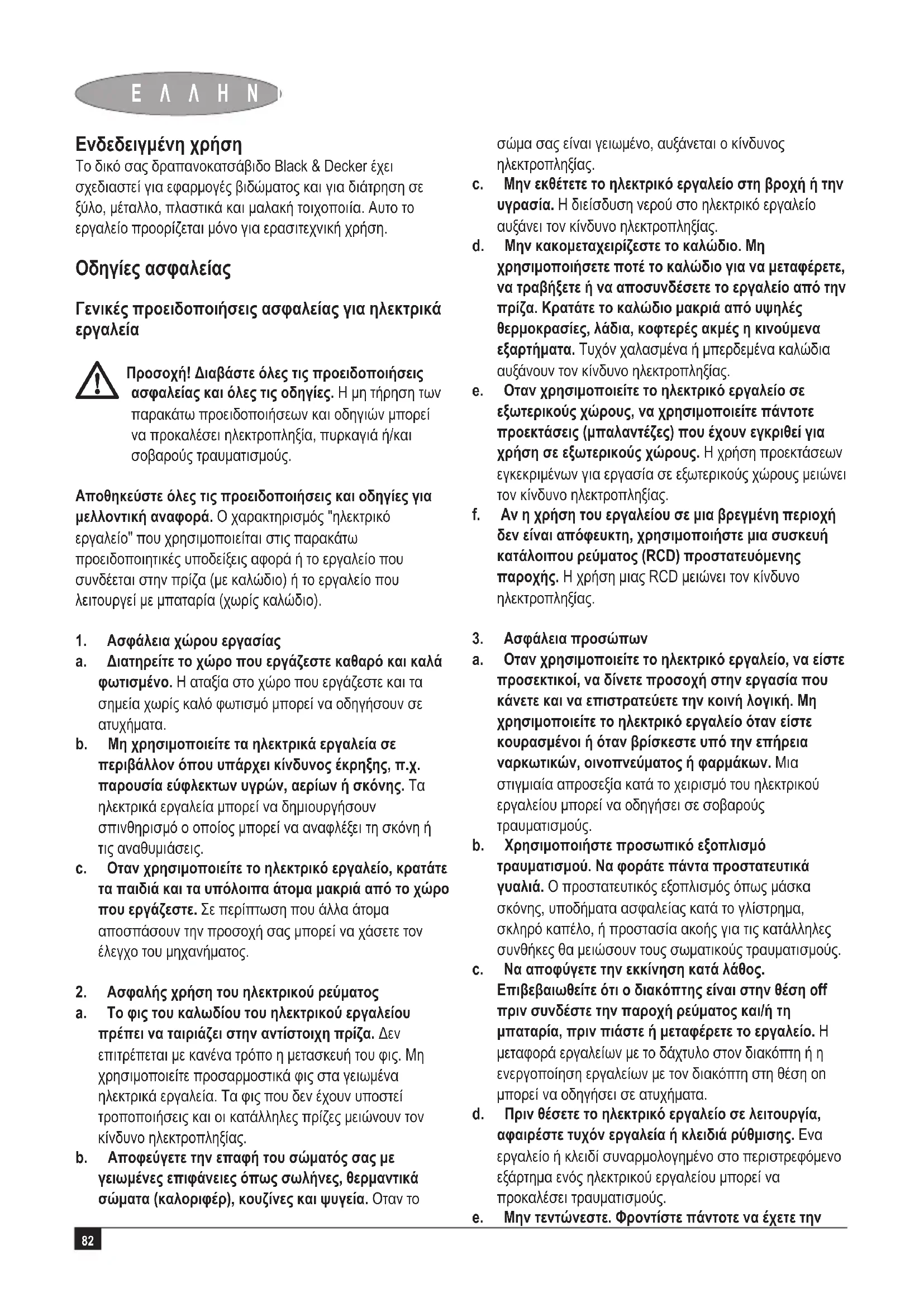 Προσοχή!Διαβάστεόλεςτιςπροειδοποιήσεις ασφαλείαςκαιόλεςτιςοδηγίες. Η μη τήρηση των παρακάτω προειδοποιήσεων και οδηγιών μπορεί να προκαλέσει ηλεκτροπληξία, πυρκαγιά ή/και σοβαρούς τραυματισμούς. Αποθηκεύστεόλεςτιςπροειδοποιήσειςκαιοδηγίεςγια μελλοντικήαναφορά. Ο χαρακτηρισμός "ηλεκτρικό εργαλείο" που χρησιμοποιείται στις παρακάτω προειδοποιητικές υποδείξεις αφορά ή το εργαλείο που συνδέεται στην πρίζα (με καλώδιο) ή το εργαλείο που λειτουργεί με μπαταρία (χωρίς καλώδιο).