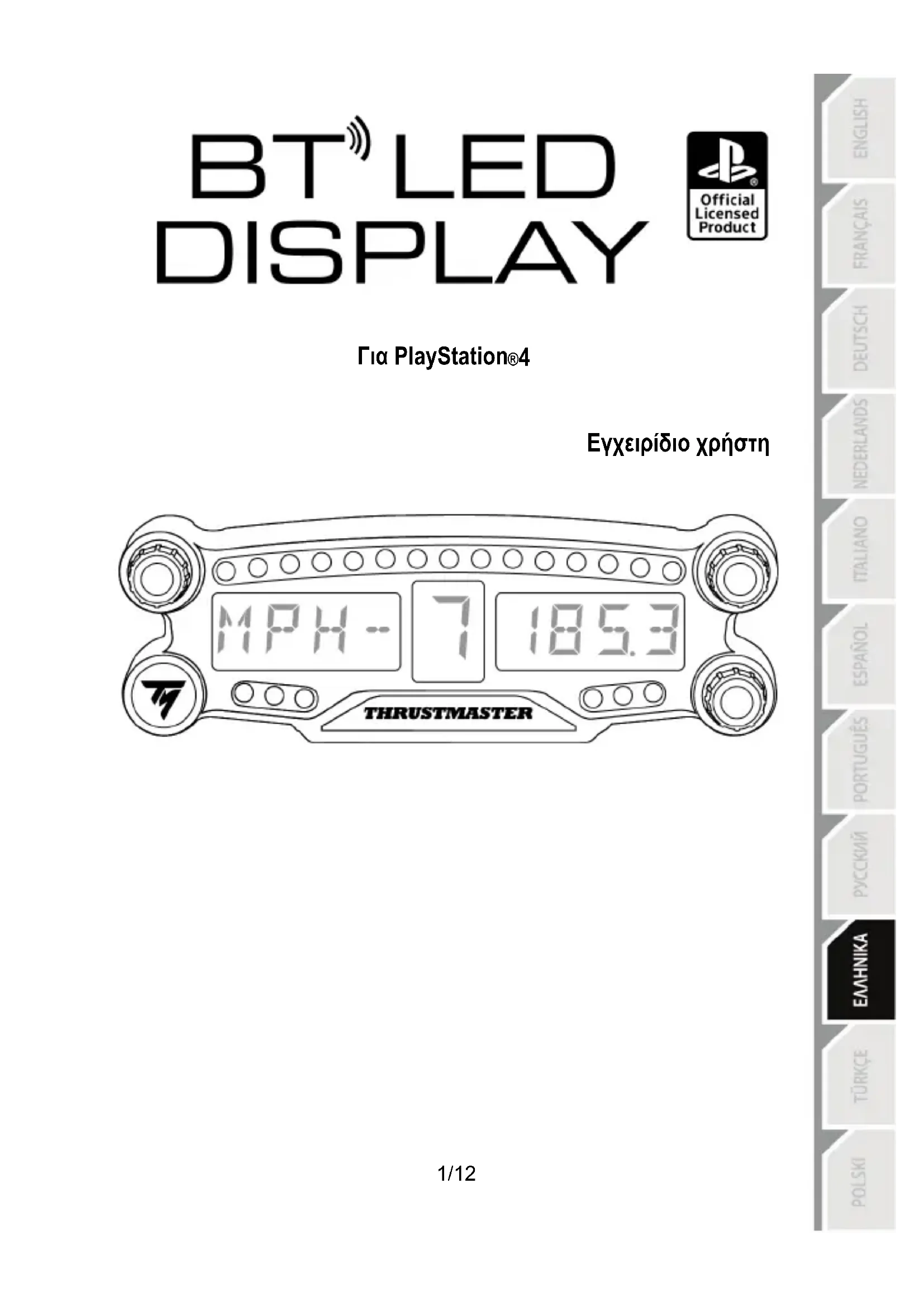 - Πωλείται χωριστά Για περισσότερες πληροφορίες σχετικά με αυτό, μεταβείτε στο http://support.thrustmaster.com. Επιλέξτε Αγωνιστικά τιμόνια / BT LED DISPLAY, στη συνέχεια Εγχειρίδιο χρήστη ή Συχνές ερωτήσεις.9/12