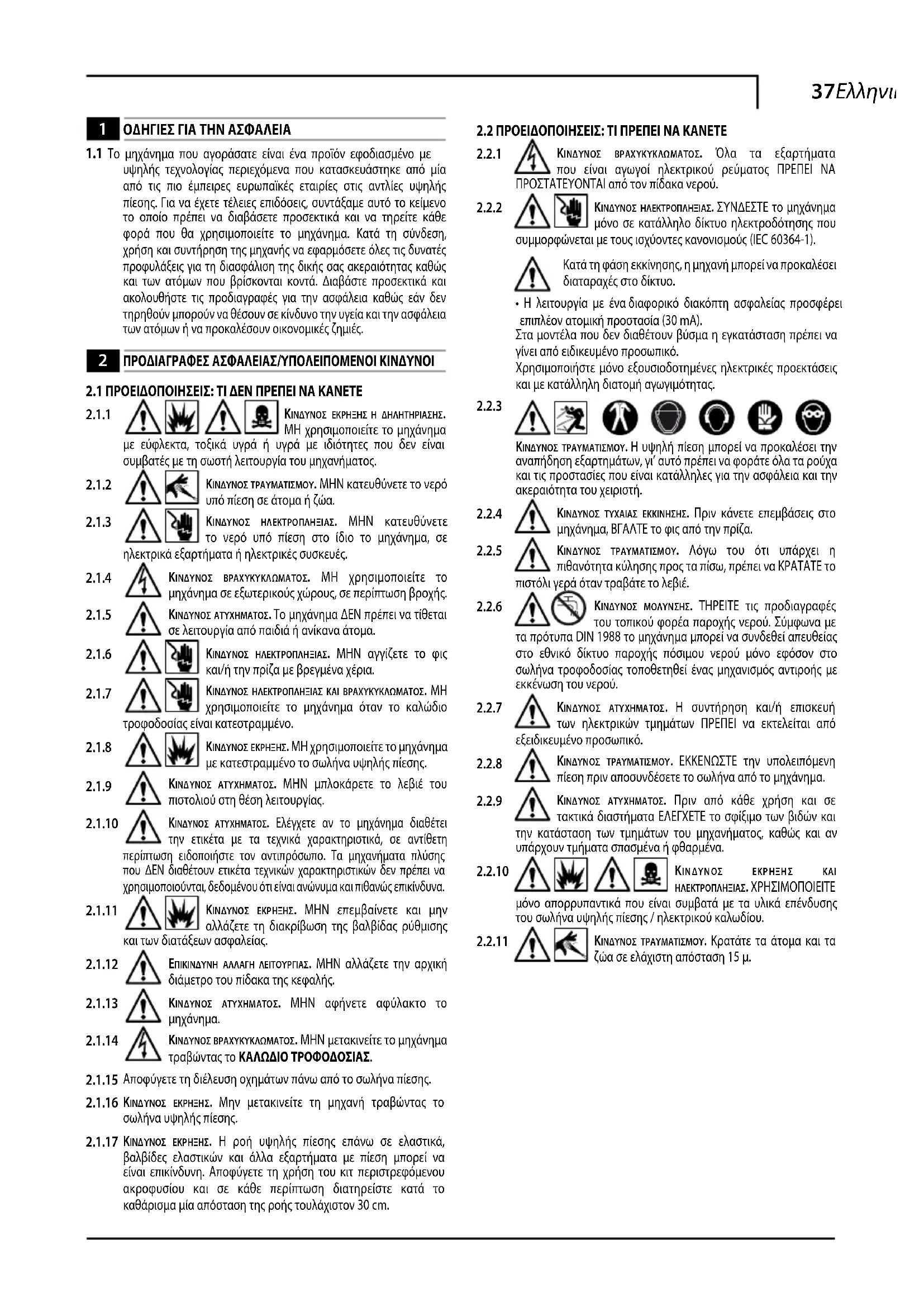 Κινδυνοσ ηλεΚτροπληξιασ. ΣΥΝ∆ΕΣΤΕ το ηχάνηα όνο σε κατάλληλο δίκτυο ηλεκτροδότηση που συορφώνεται ε του ισχύοντε κανονισού (IEC 60364-1). Κατά τη φάση εκκίνηση, η ηχανή πορεί να προκαλέσει διαταραχέ στο δίκτυο.• Η λειτουργία με ένα διαφορικό διακόπτη ασφαλείας προσφέρει επιπλέον ατοική προστασία (30 mA).Στα οντέλα που δεν διαθέτουν βύσα η εγκατάσταση πρέπει να γίνει από ειδικευένο προσωπικό.Χρησιοποιήστε όνο εξουσιοδοτηένε ηλεκτρικέ προεκτάσει και ε κατάλληλη διατοή αγωγιότητα.