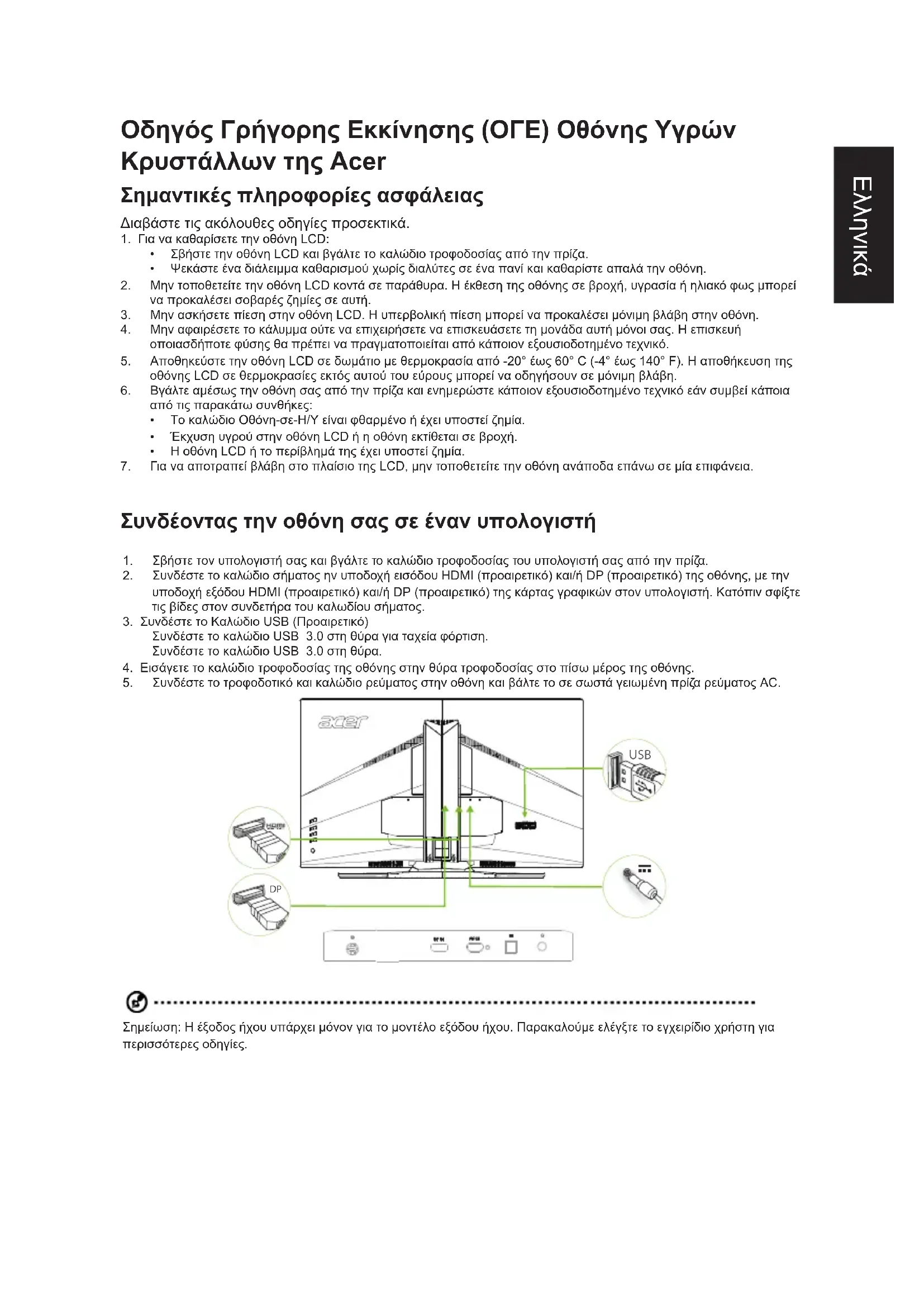 Φωςπεριβάλλοντος Ανάθεσησεπλήκτροσυντόμευσης Ευρείαλειτουργία ΛειτουργίαDeepSleep Λειτουργίαγρήγορηςέναρξης ΑπενεργοποίησηΦόρτισηUSB Λειτουργίαπαιχνιδών *Όλεςοιτεχνικέςπροδιαγραφέςυπόκεινταισεαλλαγέςχωρίςπροειδοποίηση. ΒρείτεεγχειρίδιακαιάλλαέγγραφαγιατοπροϊόνAcerσαςστονεπίσημοιστότοπουποστήριξηςτηςAcer. *Ηετήσιακατανάλωσηενέργειαςυπολογίζεταιχρησιμοποιώνταςτησυνήθηκατανάλωσηενέργειαςτων4ωρώντηνημέρα,365 ημερώντονχρόνο.Magyar Acer LCD-monitor gyors üzembe helyezési útmutatója Fontos biztonsági utasítások Olvassaelgyelmesenazalábbiutasításokat.