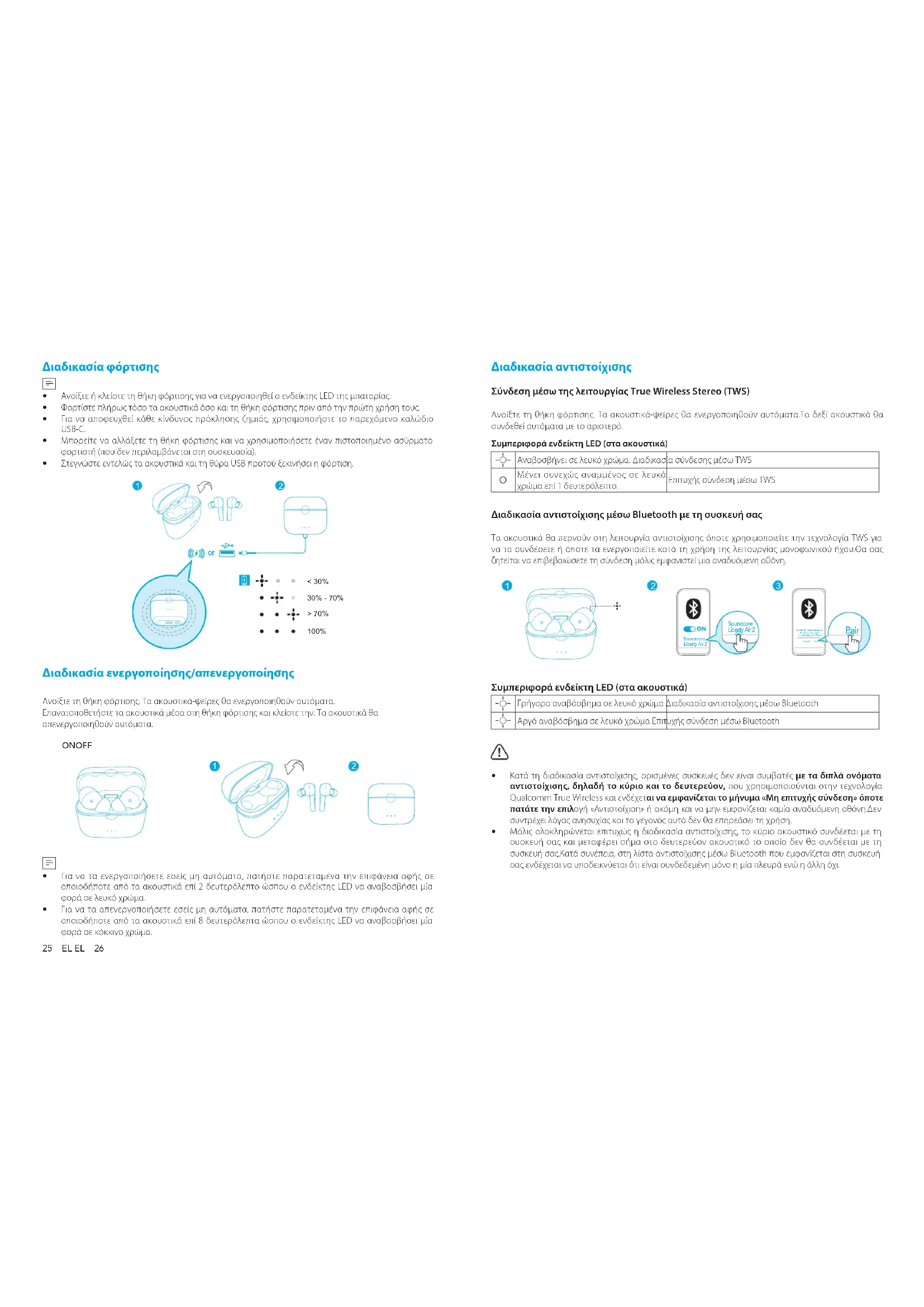 Μόλις ολοκληρώνεται επιτυχώς η διαδικασία αντιστοίχισης, το κύριο ακουστικό συνδέεται με τη συσκευή σας και μεταφέρει σήμα στο δευτερεύον ακουστικό το οποίο δεν θα συνδέεται με τη συσκευή σας.Κατά συνέπεια, στη λίστα αντιστοίχισης μέσω Bluetooth που εμφανίζεται στη συσκευή σας ενδέχεται να υποδεικνύεται ότι είναι συνδεδεμένη μόνο η μία πλευρά ενώ η άλλη όχι.27 EL EL 28 Για να αντιστοιχίσετε τα ακουστικά με κάποια άλλη συσκευή Bluetooth, επανατοποθετήστε τα μέσα στη θήκη φόρτισης και βεβαιωθείτε ότι φορτίζονται. Αφήστε το κάλυμμα ανοιχτό και ύστερα πιέστε παρατεταμένα το κουμπί στο κάτω μέρος της θήκης φόρτισης επί 3 δευτερόλεπτα ώσπου οι ενδείκτες LED στα ακουστικά να αρχίσουν να αναβοσβήνουν γρήγορα σε λευκό χρώμα.