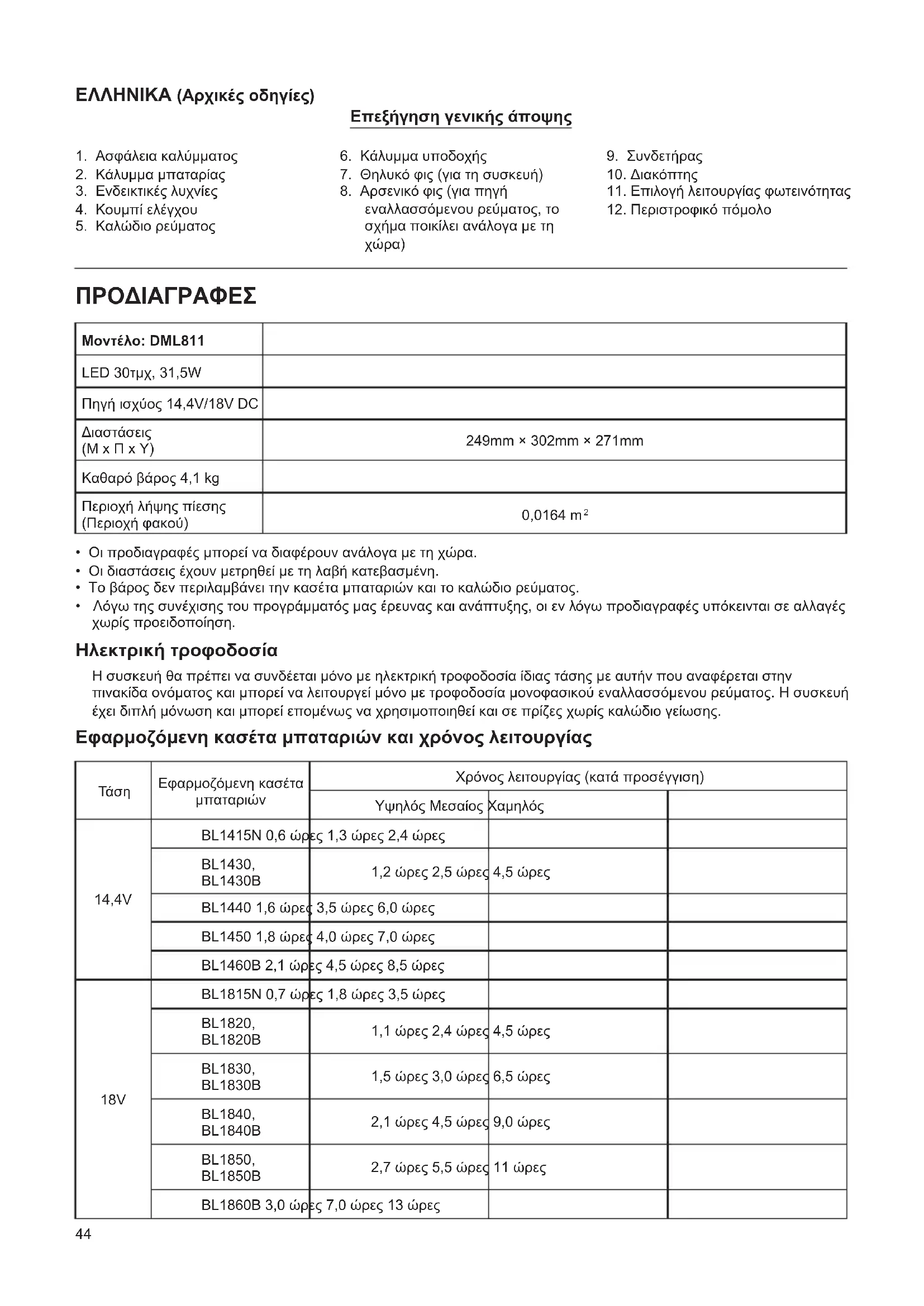 Χρόνος λειτουργίας (κατά προσέγγιση) Υψηλός Μεσαίος Χαμηλός 14,4V BL1415N 0,6 ώρες 1,3 ώρες 2,4 ώρες BL1430, BL1430B 1,2 ώρες 2,5 ώρες 4,5 ώρες BL1440 1,6 ώρες 3,5 ώρες 6,0 ώρες BL1450 1,8 ώρες 4,0 ώρες 7,0 ώρες BL1460B 2,1 ώρες 4,5 ώρες 8,5 ώρες 18V BL1815N 0,7 ώρες 1,8 ώρες 3,5 ώρες BL1820, BL1820B 1,1 ώρες 2,4 ώρες 4,5 ώρες BL1830, BL1830B 1,5 ώρες 3,0 ώρες 6,5 ώρες BL1840, BL1840B 2,1 ώρες 4,5 ώρες 9,0 ώρες BL1850, BL1850B 2,7 ώρες 5,5 ώρες 11 ώρες BL1860B 3,0 ώρες 7,0 ώρες 13 ώρες45