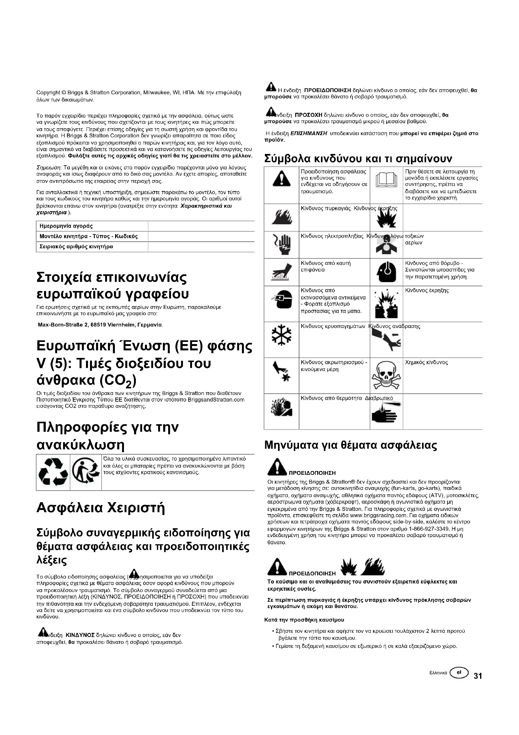 oder der Lagerung des Geräts oder unsachgemäße Motorinstallation. Garantieleistungen werden ausschließlich von Briggs & Stratton- Vertragshändlern erbracht. Den nächsten Vertragshändler finden Sie auf unserer Händlersuchkarte auf BRIGGSandSTRATTON.COM oder unter der Nummer 1-800-233-3723 (in den USA). 80004537 (Rev. F)31 Copyright © Briggs & Stratton Corporation, Milwaukee, WI, ΗΠΑ. Με την επιφύλαξη όλων των δικαιωμάτων. Το παρόν εγχειρίδιο περιέχει πληροφορίες σχετικά με την ασφάλεια, ούτως ώστε να γνωρίζετε τους κινδύνους που σχετίζονται με τους κινητήρες και πώς μπορείτε να τους αποφύγετε. Περιέχει επίσης οδηγίες για τη σωστή χρήση και φροντίδα του κινητήρα. Η Briggs & Stratton Corporation δεν γνωρίζει απαραίτητα σε ποιο είδος εξοπλισμού πρόκειται να χρησιμοποιηθεί ο παρών κινητήρας και, για τον λόγο αυτό, είναι σημαντικό να διαβάσετε προσεκτικά και να κατανοήσετε τις οδηγίες λειτουργίας του εξοπλισμού.Φυλάξτε αυτές τις αρχικές οδηγίες γιατί θα τις χρειαστείτε στο μέλλον. Σημειωση:Τα μεγέθη και οι εικόνες στο παρόν εγχειρίδιο παρέχονται μόνο για λόγους αναφοράς και ίσως διαφέρουν από το δικό σας μοντέλο. Αν έχετε απορίες, αποταθείτε στον αντιπρόσωπο της εταιρείας στην περιοχή σας. Για ανταλλακτικά ή τεχνική υποστήριξη, σημειώστε παρακάτω το μοντέλο, τον τύπο και τους κωδικούς του κινητήρα καθώς και την ημερομηνία αγοράς. Οι αριθμοί αυτοί βρίσκονται επάνω στον κινητήρα (ανατρέξτε στην ενότηταΧαρακτηριστικά και χειριστήρια). Ημερομηνία αγοράς Μοντέλο κινητήρα - Τύπος - Κωδικός Σειριακός αριθμός κινητήρα Στοιχεία επικοινωνίας ευρωπαϊκού γραφείου Για ερωτήσεις σχετικά με τις εκπομπές αερίων στην Ευρώπη, παρακαλούμε επικοινωνήστε με το ευρωπαϊκό μας γραφείο στο: Max-Born-Straße 2, 68519 Viernheim, Γερμανία. Ευρωπαϊκή Ένωση (ΕΕ) φάσης V (5): Τιμές διοξειδίου του άνθρακα (CO