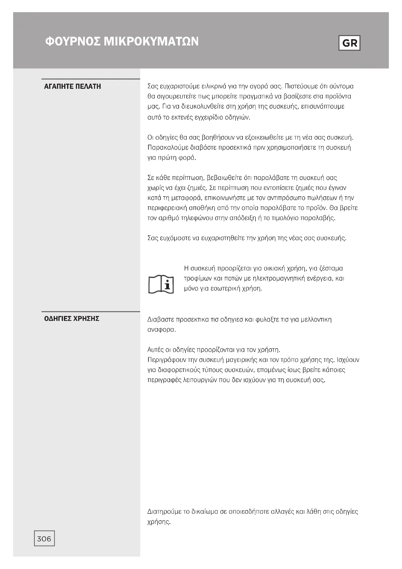Αυτές οι οδηγίες προορίζονται για τον χρήστη. Περιγράφουν την συσκευή μαγειρικής και τον τρόπο χρήσης της. Ισχύουν για διαφορετικούς τύπους συσκευών, επομένως ίσως βρείτε κάποιες περιγραφές λειτουργιών που δεν ισχύουν για τη συσκευή σας. Διατηρούμε το δικαίωμα σε οποιεσδήποτε αλλαγές και λάθη στις οδηγίες