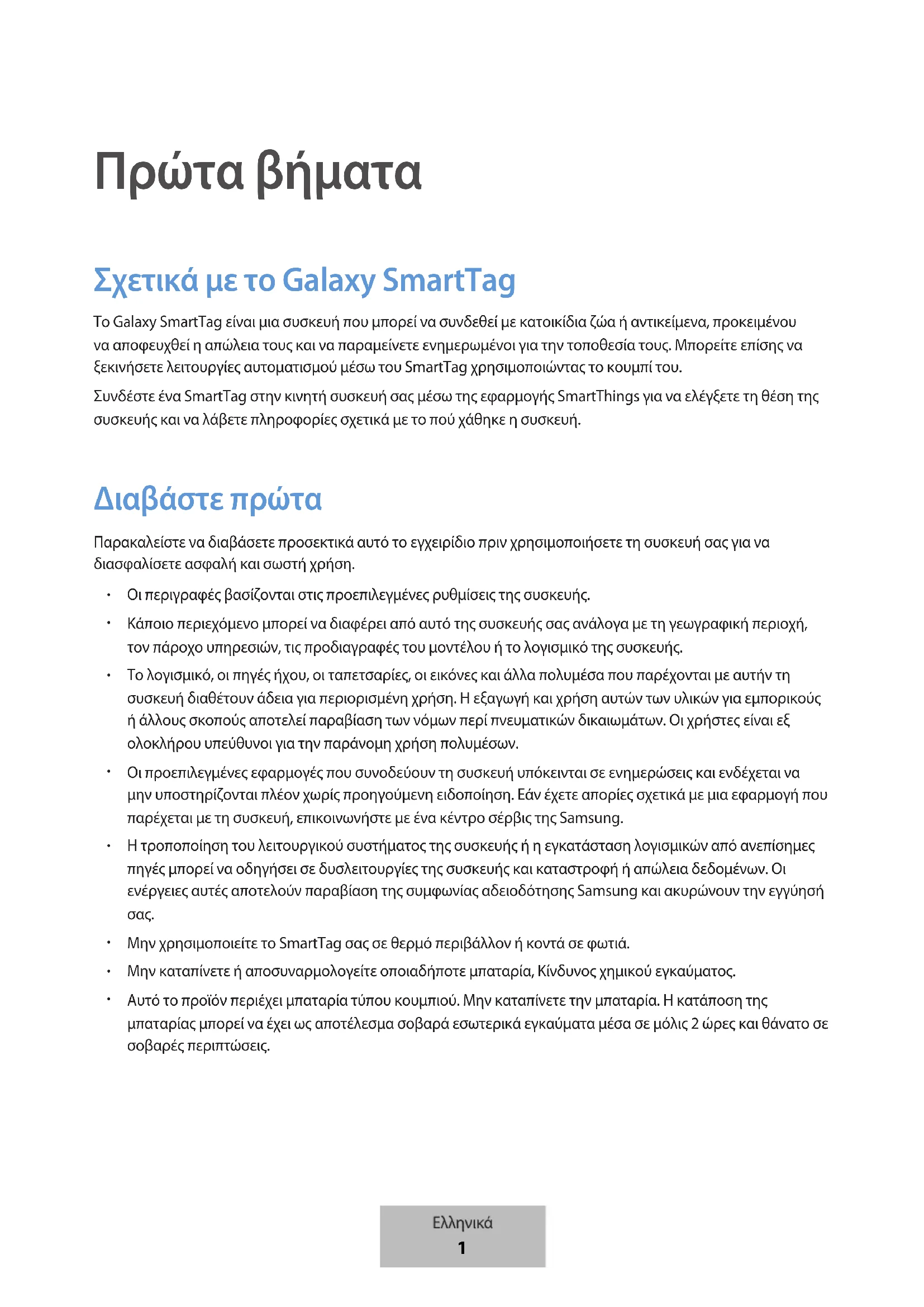 Πρώτα βήματα Σχετικά με το Galaxy SmartTag Το Galaxy SmartTag είναι μια συσκευή που μπορεί να συνδεθεί με κατοικίδια ζώα ή αντικείμενα, προκειμένου να αποφευχθεί η απώλεια τους και να παραμείνετε ενημερωμένοι για την τοποθεσία τους. Μπορείτε επίσης να ξεκινήσετε λειτουργίες αυτοματισμού μέσω του SmartTag χρησιμοποιώντας το κουμπί του.Συνδέστε ένα SmartTag στην κινητή συσκευή σας μέσω της εφαρμογής SmartThings για να ελέγξετε τη θέση της συσκευής και να λάβετε πληροφορίες σχετικά με το πού χάθηκε η συσκευή. Διαβάστε πρώτα Παρακαλείστε να διαβάσετε προσεκτικά αυτό το εγχειρίδιο πριν χρησιμοποιήσετε τη συσκευή σας για να διασφαλίσετε ασφαλή και σωστή χρήση. Οι περιγραφές βασίζονται στις προεπιλεγμένες ρυθμίσεις της συσκευής. Κάποιο περιεχόμενο μπορεί να διαφέρει από αυτό της συσκευής σας ανάλογα με τη γεωγραφική περιοχή, τον πάροχο υπηρεσιών, τις προδιαγραφές του μοντέλου ή το λογισμικό της συσκευής. Το λογισμικό, οι πηγές ήχου, οι ταπετσαρίες, οι εικόνες και άλλα πολυμέσα που παρέχονται με αυτήν τη συσκευή διαθέτουν άδεια για περιορισμένη χρήση. Η εξαγωγή και χρήση αυτών των υλικών για εμπορικούς ή άλλους σκοπούς αποτελεί παραβίαση των νόμων περί πνευματικών δικαιωμάτων. Οι χρήστες είναι εξ ολοκλήρου υπεύθυνοι για την παράνομη χρήση πολυμέσων. Οι προεπιλεγμένες εφαρμογές που συνοδεύουν τη συσκευή υπόκεινται σε ενημερώσεις και ενδέχεται να μην υποστηρίζονται πλέον χωρίς προηγούμενη ειδοποίηση. Εάν έχετε απορίες σχετικά με μια εφαρμογή που παρέχεται με τη συσκευή, επικοινωνήστε με ένα κέντρο σέρβις της Samsung. Η τροποποίηση του λειτουργικού συστήματος της συσκευής ή η εγκατάσταση λογισμικών από ανεπίσημες πηγές μπορεί να οδηγήσει σε δυσλειτουργίες της συσκευής και καταστροφή ή απώλεια δεδομένων. Οι ενέργειες αυτές αποτελούν παραβίαση της συμφωνίας αδειοδότησης Samsung και ακυρώνουν την εγγύησή