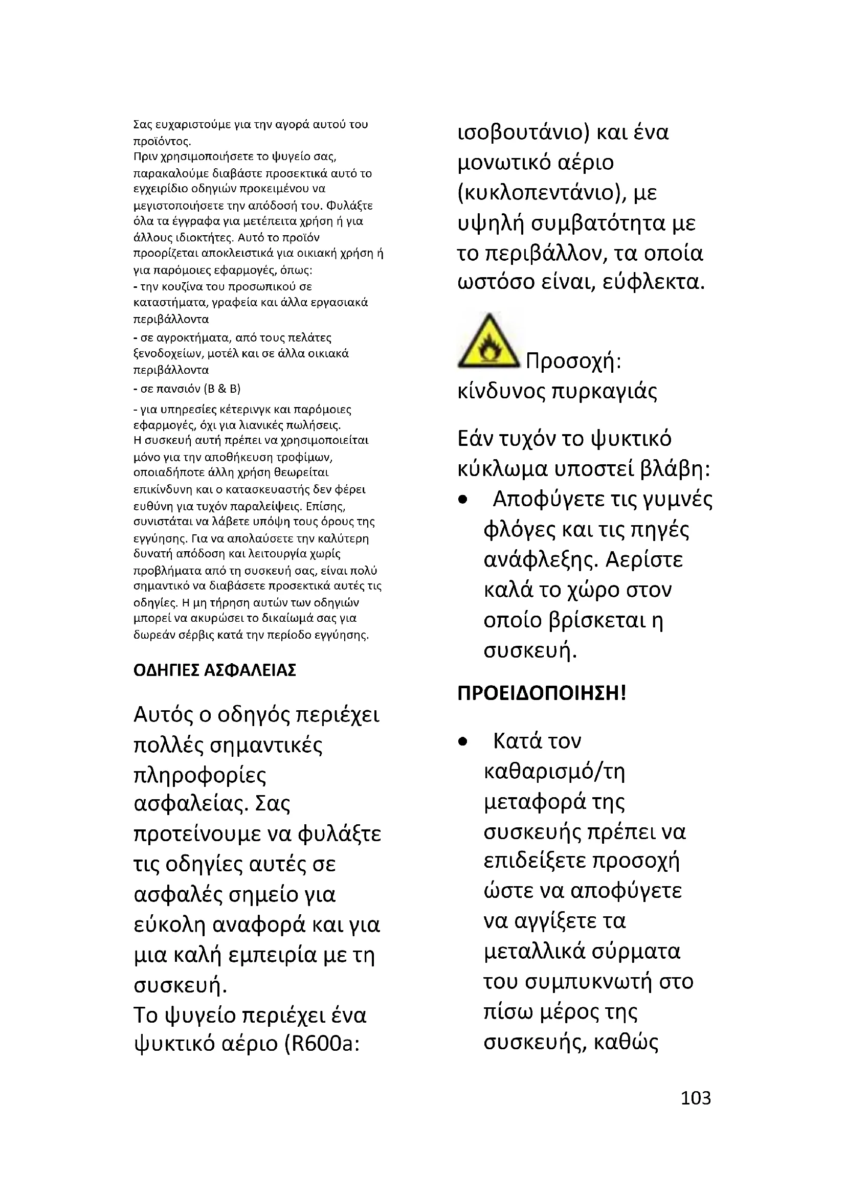 Πριν χρησιμοποιήσετε το ψυγείο σας, παρακαλούμε διαβάστε προσεκτικά αυτό το εγχειρίδιο οδηγιών προκειμένου να μεγιστοποιήσετε την απόδοσή του. Φυλάξτε όλα τα έγγραφα για μετέπειτα χρήση ή για άλλους ιδιοκτήτες. Αυτό το προϊόν προορίζεται αποκλειστικά για οικιακή χρήση ή για παρόμοιες εφαρμογές, όπως: - την κουζίνα του προσωπικού σε καταστήματα, γραφεία και άλλα εργασιακά περιβάλλοντα - σε αγροκτήματα, από τους πελάτες ξενοδοχείων, μοτέλ και σε άλλα οικιακά περιβάλλοντα - σε πανσιόν (B & B) - για υπηρεσίες κέτερινγκ και παρόμοιες εφαρμογές, όχι για λιανικές πωλήσεις. Η συσκευή αυτή πρέπει να χρησιμοποιείται μόνο για την αποθήκευση τροφίμων, οποιαδήποτε άλλη χρήση θεωρείται επικίνδυνη και ο κατασκευαστής δεν φέρει ευθύνη για τυχόν παραλείψεις. Επίσης, συνιστάται να λάβετε υπόψη τους όρους της εγγύησης. Για να απολαύσετε την καλύτερη δυνατή απόδοση και λειτουργία χωρίς προβλήματα από τη συσκευή σας, είναι πολύ σημαντικό να διαβάσετε προσεκτικά αυτές τις οδηγίες. Η μη τήρηση αυτών των οδηγιών μπορεί να ακυρώσει το δικαίωμά σας για δωρεάν σέρβις κατά την περίοδο εγγύησης. ΟΔΗΓΙΕΣ ΑΣΦΑΛΕΙΑΣ Αυτός ο οδηγός περιέχει πολλές σημαντικές πληροφορίες ασφαλείας. Σας προτείνουμε να φυλάξτε τις οδηγίες αυτές σε ασφαλές σημείο για εύκολη αναφορά και για μια καλή εμπειρία με τη