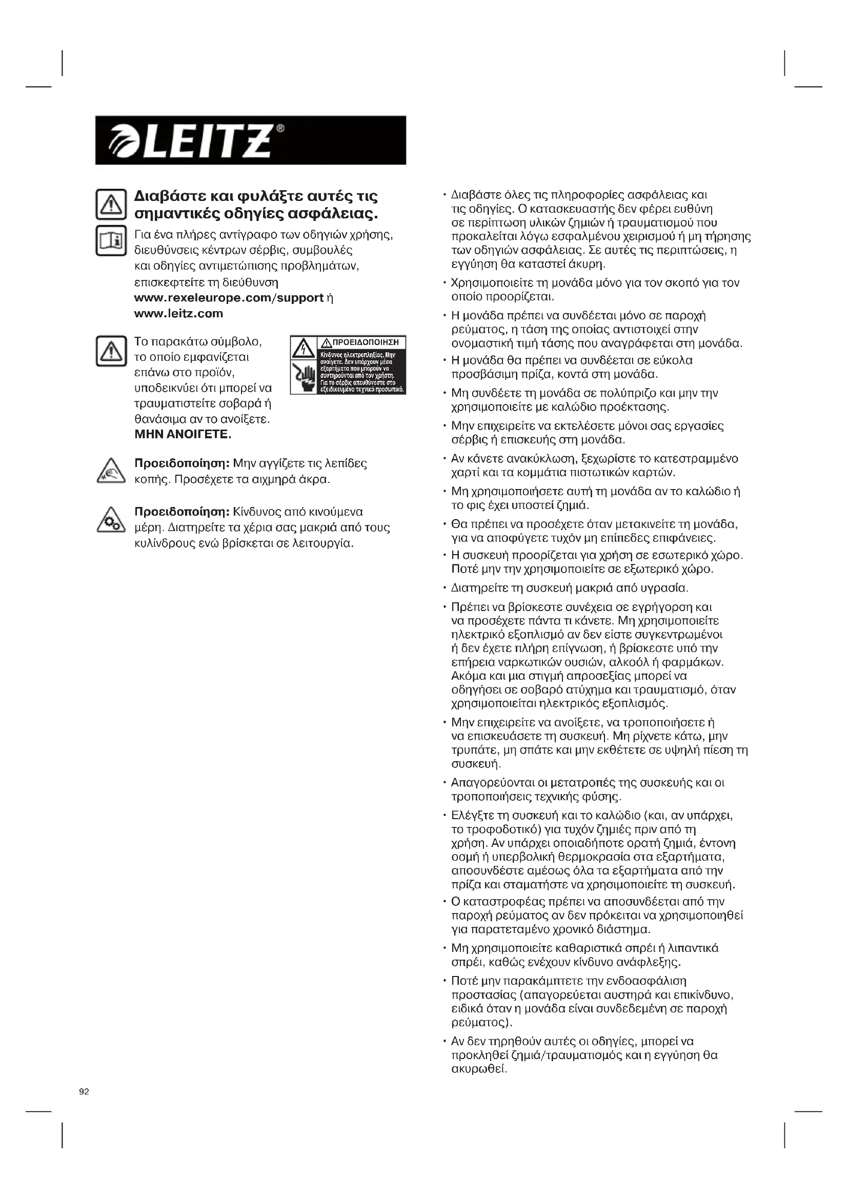 Διαβάστε και φυλάξτε αυτές τις σημαντικές οδηγίες ασφάλειας. Για ένα πλήρες αντίγραφο των οδηγιών χρήσης, διευθύνσεις κέντρων σέρβις, συμβουλές και οδηγίες αντιμετώπισης προβλημάτων, επισκεφτείτε τη διεύθυνση www.rexeleurope.com/support ή www.leitz.com Προειδοποίηση: Μην αγγίζετε τις λεπίδες κοπής. Προσέχετε τα αιχμηρά άκρα. Προειδοποίηση: Κίνδυνος από κινούμενα μέρη. Διατηρείτε τα χέρια σας μακριά από τους κυλίνδρους ενώ βρίσκεται σε λειτουργία.939393 Διατηρείτε σε απόσταση τα χαλαρά κοσμήματα Διατηρείτε σε απόσταση τις γραβάτες και τα χαλαρά ρούχα Σύμβολα προειδοποίησης Διατηρείτε σε απόσταση τα μακριά μαλλιά Μη βάζετε τα χέρια σας στο άνοιγμα τροφοδοσίας Σύμβολα προειδοποίησης Χωρητικότητα φύλλων Απαγορεύονται τα CD Απαγορεύονται τα συρραπτικά βαριάς χρήσης πάνω από 26 mm Προειδοποίηση: κινούμενα μέρη Αυτός ο εξοπλισμός δεν προορίζεται για χρήση