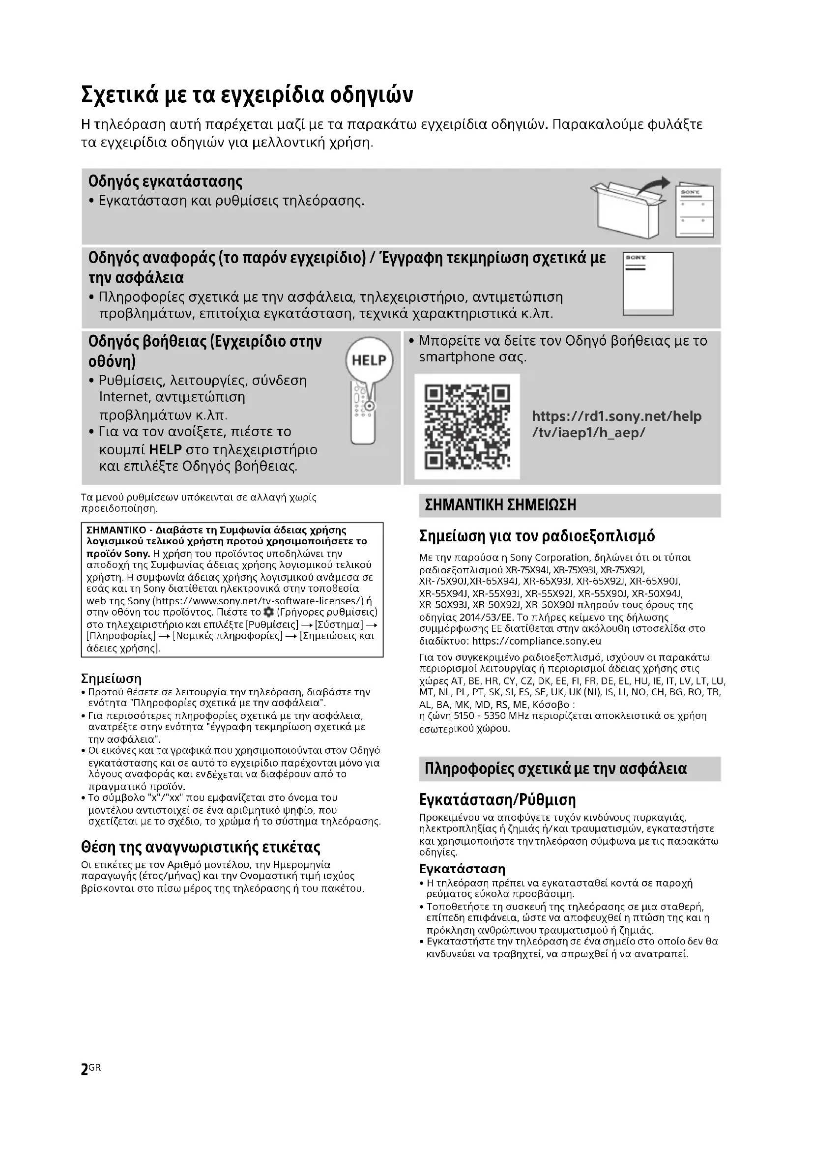 - Το σύμβολο "x"/"xx" που εμφανίζεται στο όνομα του μοντέλου αντιστοιχεί σε ένα αριθμητικό ψηφίο, που σχετίζεται με το σχέδιο, το χρώμα ή το σύστημα τηλεόρασης. Θέση της αναγνωριστικής ετικέτας Οι ετικέτες με τον Αριθμό μοντέλου, την Ημερομηνία παραγωγής (έτος/μήνας) και την Ονομαστική τιμή ισχύος βρίσκονται στο πίσω μέρος της τηλεόρασης ή του πακέτου. ΣΗΜΑΝΤΙΚΗ ΣΗΜΕΙΩΣΗ Σημείωση για τον ραδιοεξοπλισμό Με την παρούσα η Sony Corporation, δηλώνει ότι οι τύποι ραδιοεξοπλισμού XR-75X94J, XR-75X93J, XR-75X92J, XR-75X90J,XR-65X94J, XR-65X93J, XR-65X92J, XR-65X90J, XR-55X94J, XR-55X93J, XR-55X92J, XR-55X90J, XR-50X94J, XR-50X93J, XR-50X92J, XR-50X90J πληρούν τους όρους της οδηγίας 2014/53/ΕΕ. Το πλήρες κείμενο της δήλωσης συμμόρφωσης ΕΕ διατίθεται στην ακόλουθη ιστοσελίδα στο διαδίκτυο: https://compliance.sony.eu Για τον συγκεκριμένο ραδιοεξοπλισμό, ισχύουν οι παρακάτω περιορισμοί λειτουργίας ή περιορισμοί άδειας χρήσης στις χώρες AT, BE, HR, CY, CZ, DK, EE, FI, FR, DE, EL, HU, IE, IT, LV, LT, LU, MT, NL, PL, PT, SK, SI, ES, SE, UK, UK (NI), IS, LI, NO, CH, BG, RO, TR, AL, BA, MK, MD, RS, ME, Κόσοβο : η ζώνη 5150 - 5350 MHz περιορίζεται αποκλειστικά σε χρήσ η εσωτερικού χώρου. Πληροφορίες σχετικά με την ασφάλεια Εγκατάσταση/Ρύθμιση Προκειμένου να αποφύγετε τυχόν κινδύνους πυρκαγιάς, ηλεκτροπληξίας ή ζημιάς ή/και τραυματισμών, εγκαταστήστε και χρησιμοποιήστε την τηλεόραση σύμφωνα με τις παρακάτω Εγκατάσταση