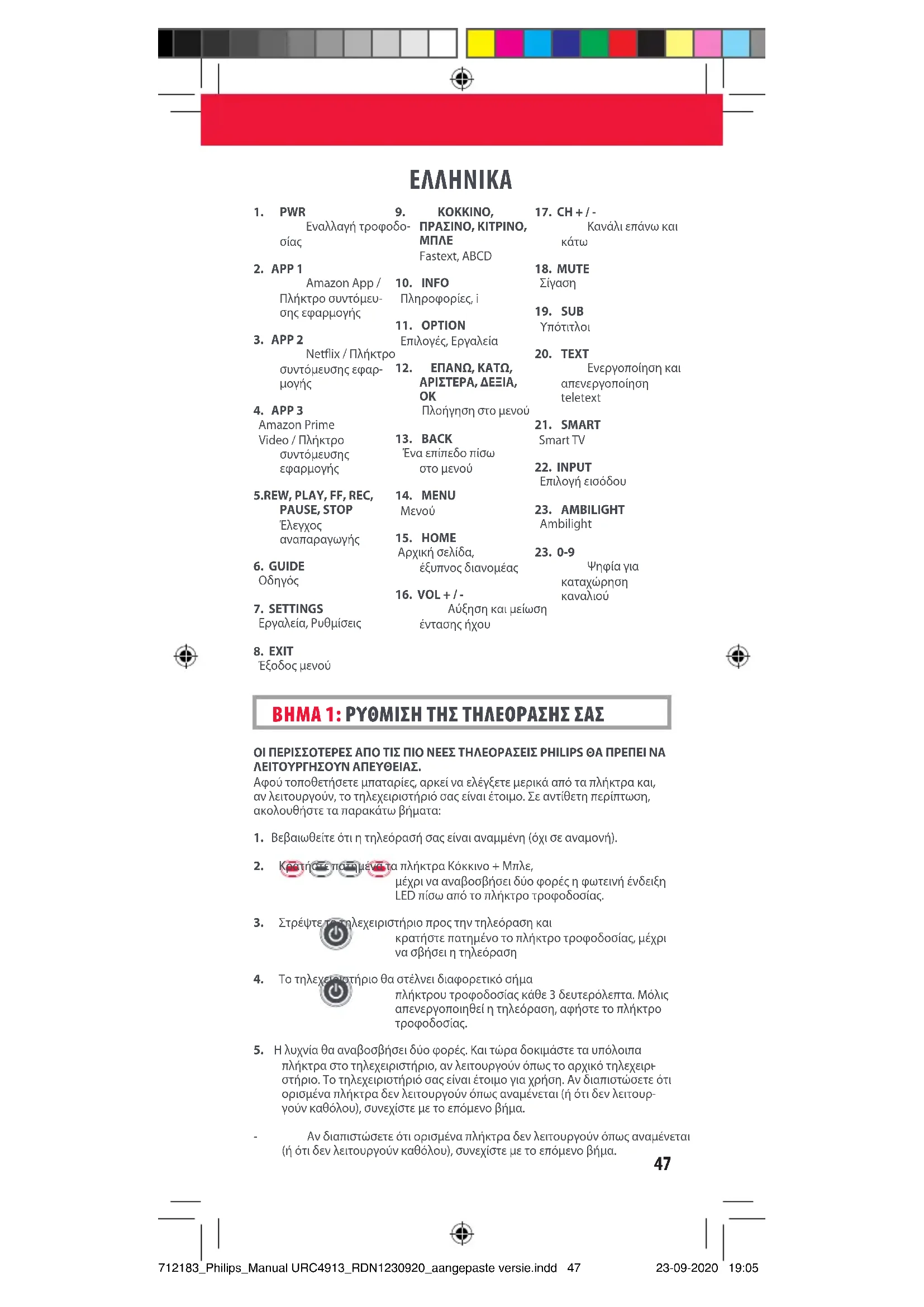 712183_Philips_Manual URC4913_RDN1230920_aangepaste versie.indd 47712183_Philips_Manual URC4913_RDN1230920_aangepaste versie.indd 47 23-09-2020 19:0523-09-2020 19:0548 ΜΑΘΕΤΕ ΜΙΑ ΝΕΑ ΛΕΙΤΟΥΡΓΙΑ ΣΤΟ ΤΗΛΕΧΕΙΡΙΣΤΗΡΙΟ ΣΑΣ Το τηλεχειριστήριό σας One For All μπορεί να μάθει μια λειτουργία από το αρχικό σας τηλεχειριστήριο (που λειτουργεί).