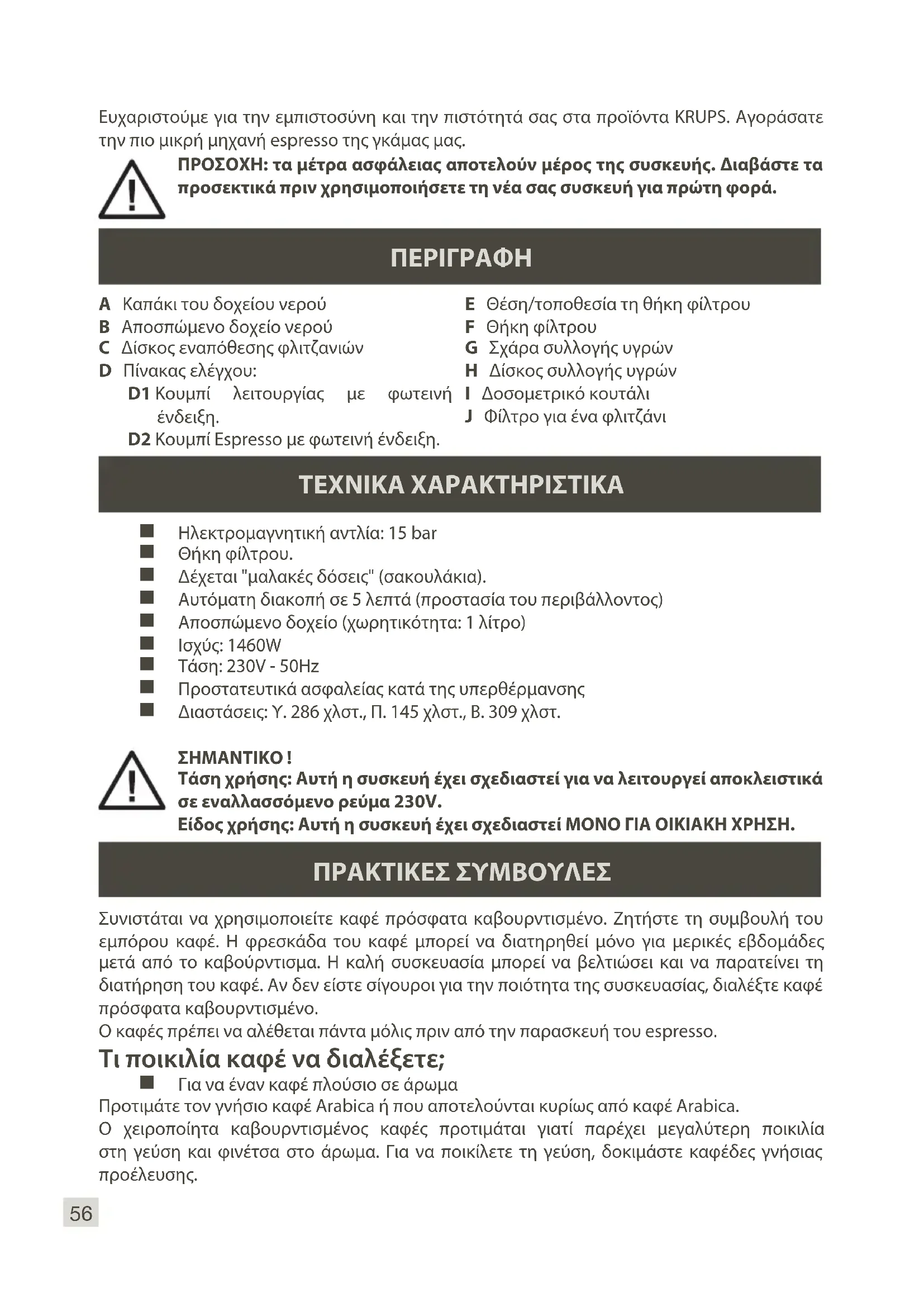 D2 Κουμπί Espresso με φωτεινή ένδειξη. E Θέση/τοποθεσία τη θήκη φίλτρου F Θήκη φίλτρου G Σχάρα συλλογής υγρών H Δίσκος συλλογής υγρών I Δοσομετρικό κουτάλι J Φίλτρο για ένα φλιτζάνι ΤΕΧΝΙΚΑ ΧΑΡΑΚΤΗΡΙΣΤΙΚΑ Ηλεκτρομαγνητική αντλία: 15 bar Θήκη φίλτρου. Δέχεται "μαλακές δόσεις" (σακουλάκια). Αυτόματη διακοπή σε 5 λεπτά (προστασία του περιβάλλοντος) Αποσπώμενο δοχείο (χωρητικότητα: 1 λίτρο) Ισχύς: 1460W Τάση: 230V - 50Hz Προστατευτικά ασφαλείας κατά της υπερθέρμανσης Διαστάσεις: Υ. 286 χλστ., Π. 145 χλστ., Β. 309 χλστ. ΣΗΜΑΝΤΙΚΟ ! Τάση χρήσης: Αυτή η συσκευή έχει σχεδιαστεί για να λειτουργεί αποκλειστικά σε εναλλασσόμενο ρεύμα 230V. Είδος χρήσης: Αυτή η συσκευή έχει σχεδιαστεί ΜΟΝΟ ΓΙΑ ΟΙΚΙΑΚΗ ΧΡΗΣΗ. Ευχαριστούμε για την εμπιστοσύνη και την πιστότητά σας στα προϊόντα KRUPS. Αγοράσατε την πιο μικρή μηχανή espresso της γκάμας μας.