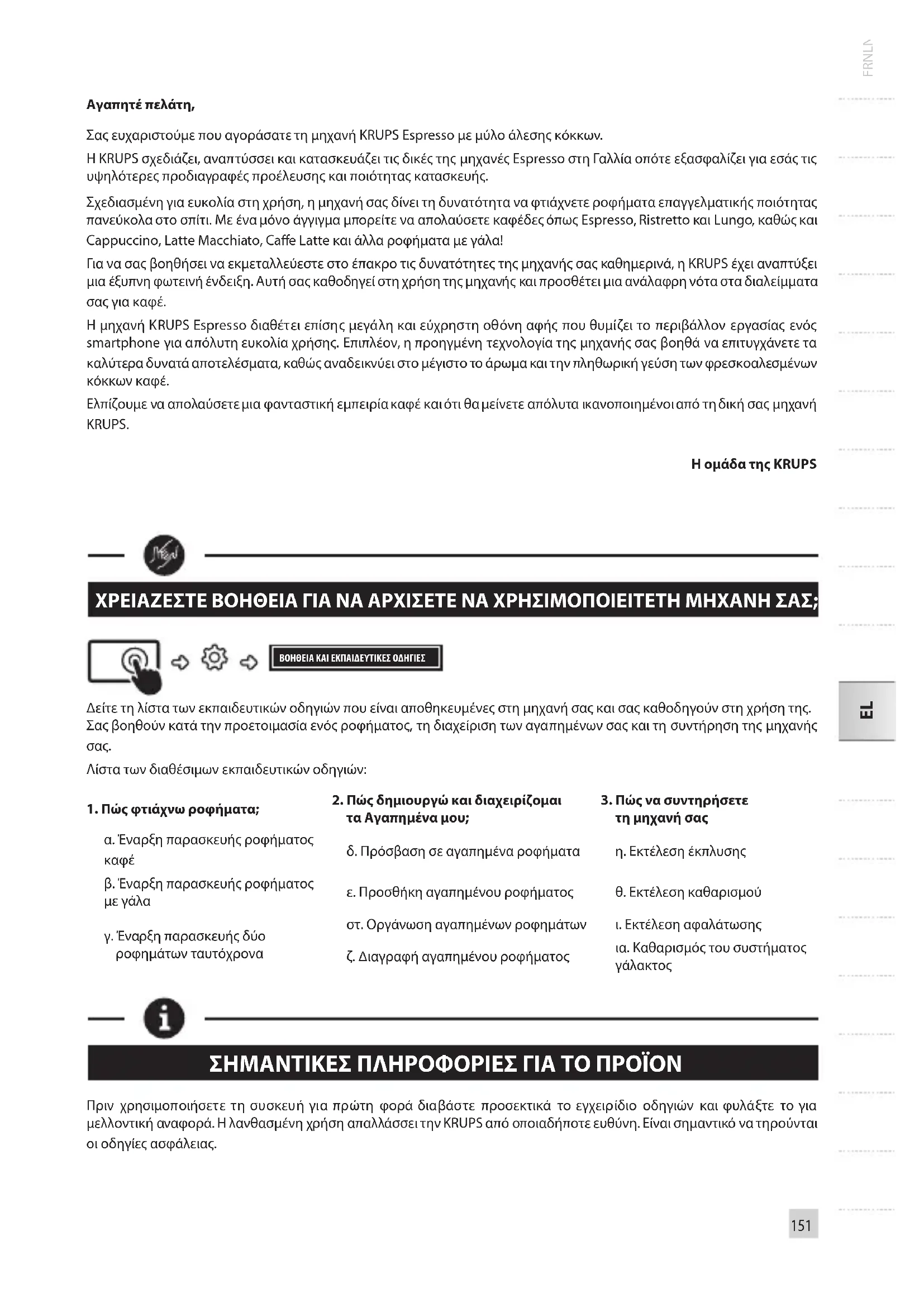 Αγαπητέ πελάτη, Σας ευχαριστούμε που αγοράσατε τη μηχανή KRUPS Espresso με μύλο άλεσης κόκκων. Η KRUPS σχεδιάζει, αναπτύσσει και κατασκευάζει τις δικές της μηχανές Espresso στη Γαλλία οπότε εξασφαλίζει για εσάς τις υψηλότερες προδιαγραφές προέλευσης και ποιότητας κατασκευής. Σχεδιασμένη για ευκολία στη χρήση, η μηχανή σας δίνει τη δυνατότητα να φτιάχνετε ροφήματα επαγγελματικής ποιότητας πανεύκολα στο σπίτι. Με ένα μόνο άγγιγμα μπορείτε να απολαύσετε καφέδες όπως Espresso, Ristretto και Lungo, καθώς και Cappuccino, Latte Macchiato, Caffe Latte και άλλα ροφήματα με γάλα! Για να σας βοηθήσει να εκμεταλλεύεστε στο έπακρο τις δυνατότητες της μηχανής σας καθημερινά, η KRUPS έχει αναπτύξει μια έξυπνη φωτεινή ένδειξη. Αυτή σας καθοδηγεί στη χρήση της μηχανής και προσθέτει μια ανάλαφρη νότα στα διαλείμματα σας για καφέ. Η μηχανή KRUPS Espresso διαθέτει επίσης μεγάλη και εύχρηστη οθόνη αφής που θυμίζει το περιβάλλον εργασίας ενός smartphone για απόλυτη ευκολία χρήσης. Επιπλέον, η προηγμένη τεχνολογία της μηχανής σας βοηθά να επιτυγχάνετε τα καλύτερα δυνατά αποτελέσματα, καθώς αναδεικνύει στο μέγιστο το άρωμα και την πληθωρική γεύση των φρεσκοαλεσμένων κόκκων καφέ. Ελπίζουμε να απολαύσετε μια φανταστική εμπειρίακαφέ και ότι θα μείνετε απόλυτα ικανοποιημένοι από τη δική σας μηχανή KRUPS. Η ομάδα της KRUPS ΧΡΕΙΑΖΕΣΤΕ ΒΟΗΘΕΙΑ ΓΙΑ ΝΑ ΑΡΧΙΣΕΤΕ ΝΑ ΧΡΗΣΙΜΟΠΟΙΕΙΤΕΤΗ ΜΗΧΑΝΗ ΣΑΣ; ΒΟΗΘΕΙΑ ΚΑΙ ΕΚΠΑΙΔΕΥΤΙΚΕΣ ΟΔΗΓΙΕΣ ∆είτε τη λίστα των εκπαιδευτικών οδηγιών που είναι αποθηκευμένες στη μηχανή σας και σας καθοδηγούν στη χρήση της. Σας βοηθούν κατά την προετοιμασία ενός ροφήματος, τη διαχείριση των αγαπημένων σας και τη συντήρηση της μηχανής
