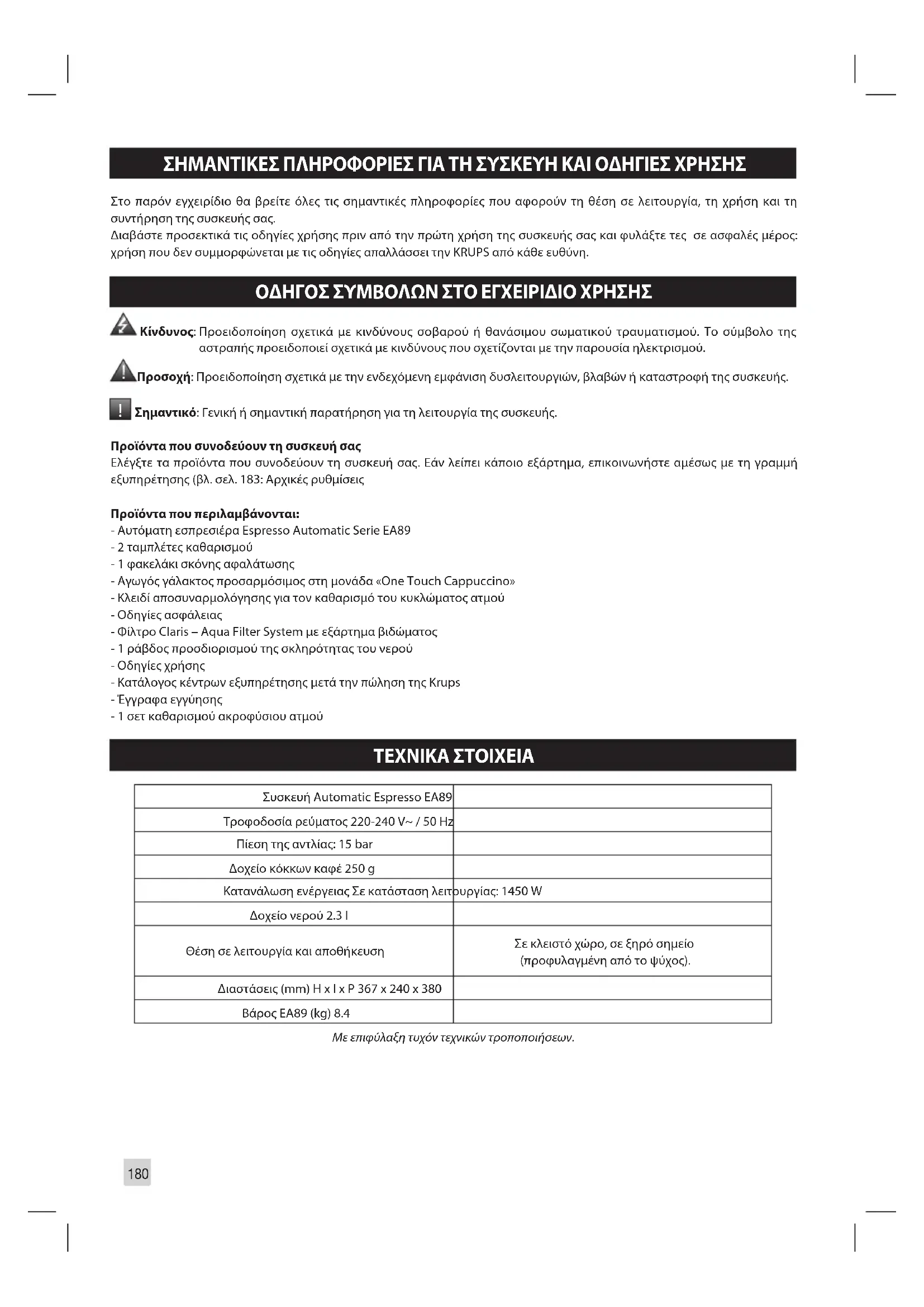 Σημαντικό: Γενική ή σημαντική παρατήρηση για τη λειτουργία της συσκευής. Προϊόντα που συνοδεύουν τη συσκευή σας Ελέγξτε τα προϊόντα που συνοδεύουν τη συσκευή σας. Εάν λείπει κάποιο εξάρτημα, επικοινωνήστε αμέσως με τη γραμμή εξυπηρέτησης (βλ. σελ. 183: Αρχικές ρυθμίσεις Προϊόντα που περιλαμβάνονται: - Αυτόματη εσπρεσιέρα Espresso Automatic Serie EA89 - 2 ταμπλέτες καθαρισμού - 1 φακελάκι σκόνης αφαλάτωσης - Αγωγός γάλακτος προσαρμόσιμος στη μονάδα «One Touch Cappuccino» - Κλειδί αποσυναρμολόγησης για τον καθαρισμό του κυκλώματος ατμού - Οδηγίες ασφάλειας - Φίλτρο Claris – Aqua Filter System με εξάρτημα βιδώματος - 1 ράβδος προσδιορισμού της σκληρότητας του νερού - Οδηγίες χρήσης - Κατάλογος κέντρων εξυπηρέτησης μετά την πώληση της Krups - Έγγραφα εγγύησης - 1 σετ καθαρισμού ακροφύσιου ατμού ΤΕΧΝΙΚΑ ΣΤΟΙΧΕΙΑ Συσκευή Automatic Espresso EA89 Τροφοδοσία ρεύματος 220-240 V~ / 50 Hz Πίεση της αντλίας: 15 bar Δοχείο κόκκων καφέ 250 g Κατανάλωση ενέργειας Σε κατάσταση λειτουργίας: 1450 W Δοχείο νερού 2.3 l Θέση σε λειτουργία και αποθήκευση Σε κλειστό χώρο, σε ξηρό σημείο (προφυλαγμένη από το ψύχος). Διαστάσεις (mm) H x l x P 367 x 240 x 380 Βάρος EA89 (kg) 8.4 Με επιφύλαξη τυχόν τεχνικών τροποποιήσεων.181