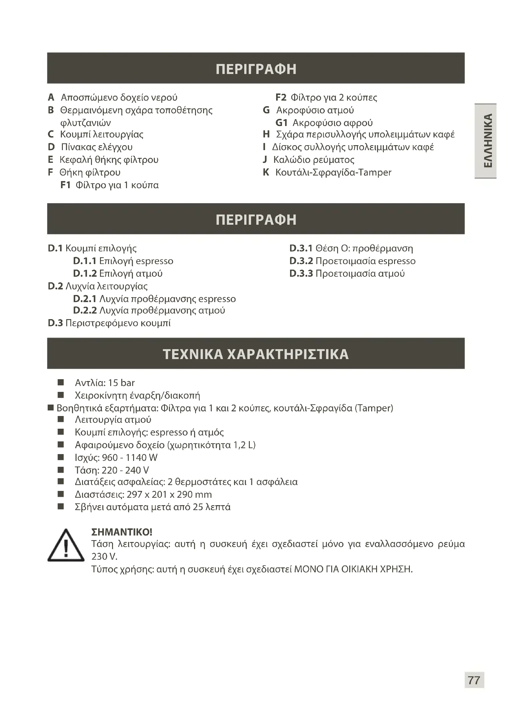 ΤΕΧΝΙΚΆ ΧΆΡΆΚΤΗΡΙΣΤΙΚΆ Αντλία: 15 bar Χειροκίνητη έναρξη/διακοπή Βοηθητικά εξαρτήματα: Φίλτρα για 1 και 2 κούπες, κουτάλι-Σφραγίδα (Tamper) Λειτουργία ατμού Κουμπί επιλογής: espresso ή ατμός Αφαιρούμενο δοχείο (χωρητικότητα 1,2L) Ισχύς: 960 - 1140 W Τάση: 220 - 240 V Διατάξεις ασφαλείας: 2 θερμοστάτες και 1 ασφάλεια Διαστάσεις: 297 x 201 x 290mm Σβήνει αυτόματα μετά από 25 λεπτά