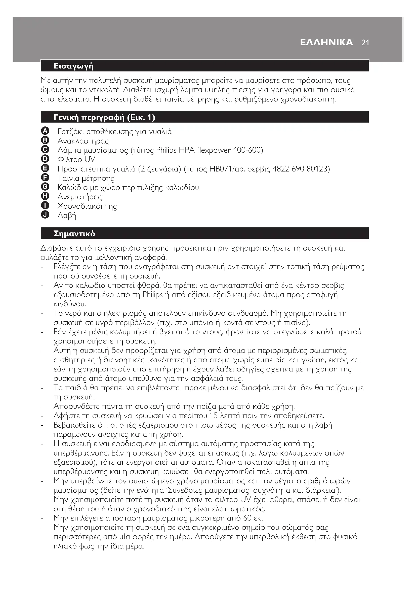 A Γατζάκιαποθήκευσηςγιαγυαλιά B Ανακλαστήρας C Λάμπαμαυρίσματος(τύποςPhilipsHPAexpower400-600) D ΦίλτροUV E Προστατευτικάγυαλιά(2ζευγάρια)(τύποςHB071/αρ.σέρβις482269080123) F Ταινίαμέτρησης G Καλώδιομεχώροπεριτύλιξηςκαλωδίου H Ανεμιστήρας I Χρονοδιακόπτης J Λαβή