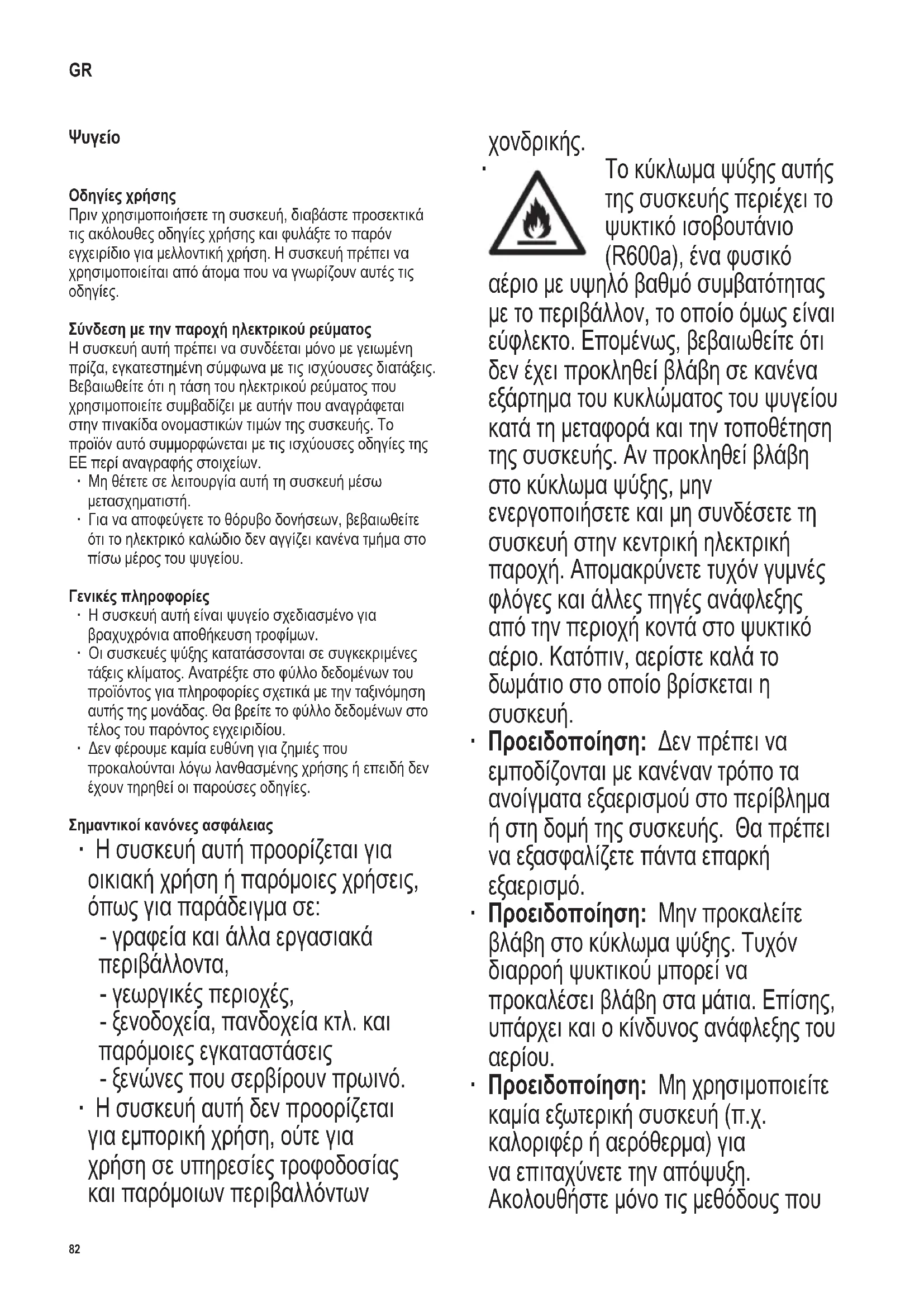 καθώς και στο ψυκτικό R600a. Για επιπρόσθετες πληροφορίες σχετικά με τη σωστή ανακύκλωση, ανατρέξτε στην παράγραφο «Απόρριψη». ∙ Για να τηρείτε τους κανόνες ασφαλείας και να αποφεύγετε πιθανούς κίνδυνους, να φροντίζετε οποιεσδήποτε επισκευές ή τροποποιήσεις αυτής της συσκευής, αλλά και η αντικατάσταση του ηλεκτρικού καλωδίου, να γίνονται από ειδικευμένους τεχνικούς. ∙ Η συσκευή αυτή μπορεί να χρησιμοποιηθεί από παιδιά (τουλάχιστον 8 ετών) και από άτομα με μειωμένες φυσικές, αισθητήριες ή διανοητικές ικανότητες ή χωρίς πείρα και γνώσεις, με την προϋπόθεση ότι επιτηρούνται ή τους έχουν δοθεί οδηγίες σχετικά με τη χρήση της συσκευής και κατανοούν πλήρως όλους τους εμπλεκόμενους κίνδυνους και προφυλάξεις για την ασφάλεια. ∙ Παιδιά από 3 έως 8 ετών επιτρέπεται να φορτώσουν και να ξεφορτώσουν το ψυγείο/καταψύκτη. ∙ Τα παιδιά δεν πρέπει να επιτρέπεται να παίζουν με τη συσκευή. ∙ Δεν πρέπει να επιτρέπεται στα παιδιά να εκτελούν οποιαδήποτε εργασία καθαρισμού ή συντήρησης στη συσκευή εκτός αν επιτηρούνται. ∙ Για συχνό καθαρισμό, συνιστούμε να χρησιμοποιείτε ζεστό νερό με λίγο ήπιο απορρυπαντικό. Πρέπει να πλένετε τυχόν εξαρτήματα ξεχωριστά, με σαπουνόνερο. Μην τα βάζετε σε πλυντήριο πιάτων. Για να αποφύγετε την μόλυνση του φαγητού ακολουθήστε τις παρακάτω84 142 x 208 mm