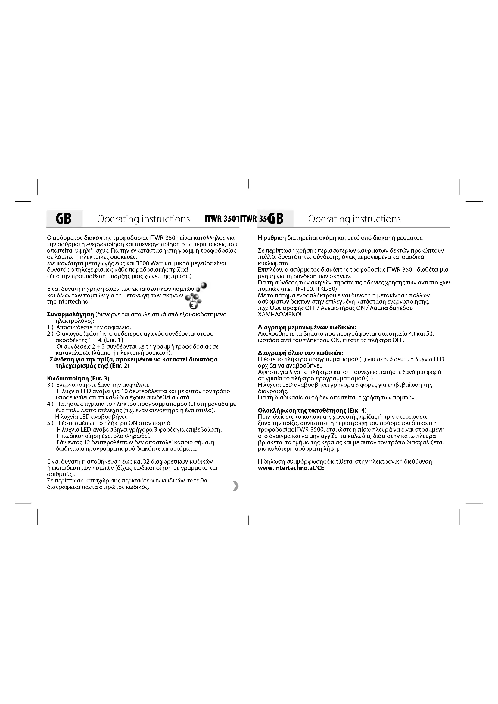 Η ρύθμιση διατηρείται ακόμη και μετά από διακοπή ρεύματος.Σε περίπτωση χρήσης περισσότερων ασύρματων δεκτών προκύπτουν πολλές δυνατότητες σύνδεσης, όπως μεμονωμένα και ομαδικά κυκλώματα.Επιπλέον, ο ασύρματος διακόπτης τροφοδοσίας ITWR-3501 διαθέτει μια μνήμη για τη σύνδεση των σκηνών.Για τη σύνδεση των σκηνών, τηρείτε τις οδηγίες χρήσης των αντίστοιχων πομπών (π.χ. ITF-100, ITKL-30)Με το πάτημα ενός πλήκτρου είναι δυνατή η μετακίνηση πολλών ασύρματων δεκτών στην επιλεγμένη κατάσταση ενεργοποίησης.π.χ.: Φως οροφής OFF / Ανεμιστήρας ON / Λάμπα δαπέδου ΧΑΜΗΛΟΜΕΝΟ!Διαγραφή μεμονωμένων κωδικών:Ακολουθήστε τα βήματα που περιγράφονται στα σημεία 4.) και 5.), ωστόσο αντί του πλήκτρου ΟΝ, πιέστε το πλήκτρο OFF.Διαγραφή όλων των κωδικών:Πιέστε το πλήκτρο προγραμματισμού (L) για περ. 6 δευτ., η λυχνία LED αρχίζει να αναβοσβήνει.Αφήστε για λίγο το πλήκτρο και στη συνέχεια πατήστε ξανά μία φορά στιγμιαία το πλήκτρο προγραμματισμού (L).Η λυχνία LED αναβοσβήνει γρήγορα 3 φορές για επιβεβαίωση της διαγραφής.Για τη διαδικασία αυτή δεν απαιτείται η χρήση των πομπών.Ολοκλήρωση της τοποθέτησης (Εικ. 4)Πριν κλείσετε το καπάκι της χωνευτής πρίζας ή πριν στερεώσετε ξανά την πρίζα, συνίσταται η περιστροφή του ασύρματου διακόπτη τροφοδοσίας ITWR-3500, έτσι ώστε η πίσω πλευρά να είναι στραμμένη στο άνοιγμα και να μην αγγίζει τα καλώδια, διότι στην κάτω πλευρά βρίσκεται το τμήμα της κεραίας και με αυτόν τον τρόπο διασφαλίζεται μια καλύτερη ασύρματη λήψη. Η δήλωση συμμόρφωσης διατίθεται στην ηλεκτρονική διεύθυνση www.intertechno.at/CE