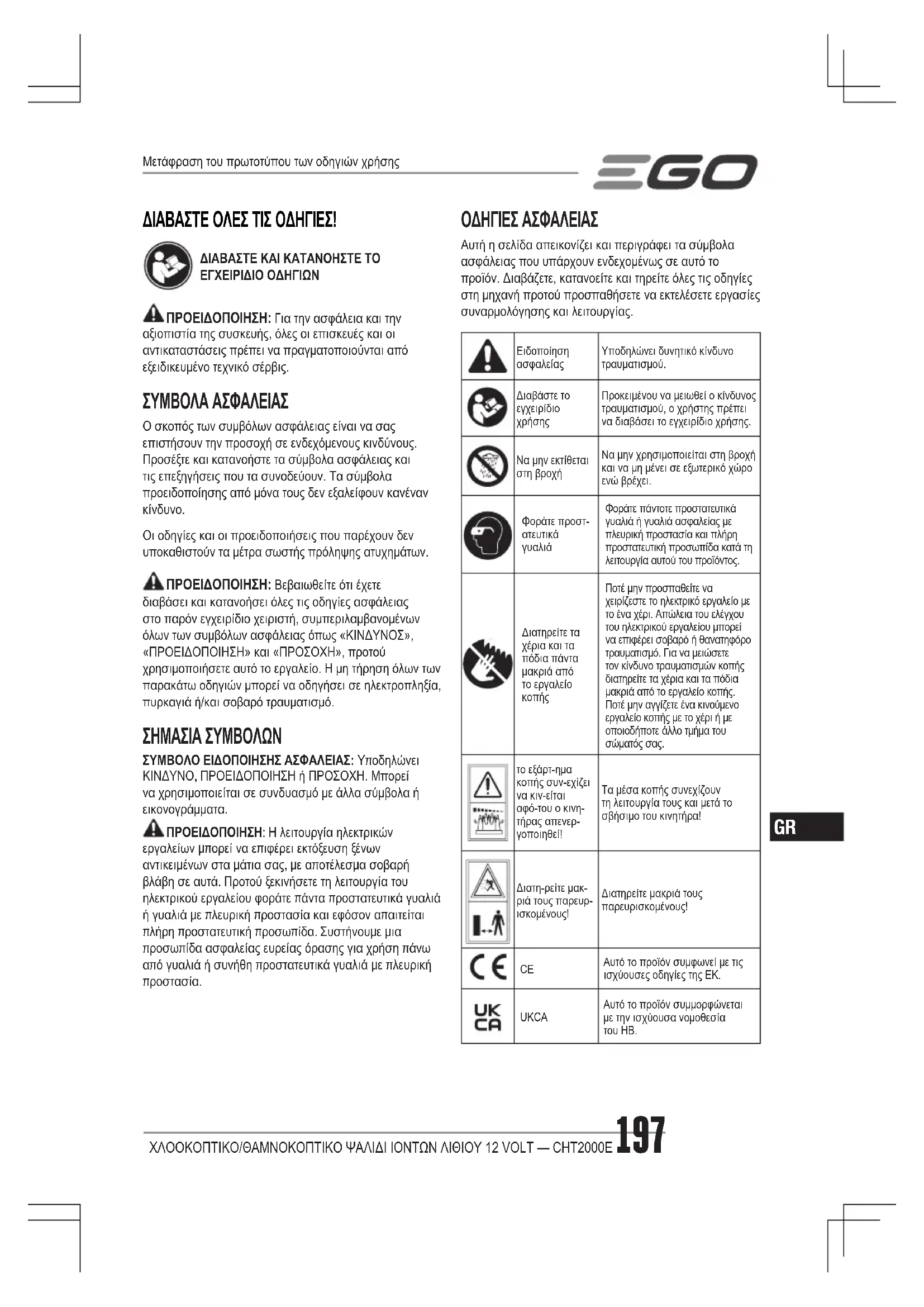 ΠΟΛΙΤΙΚΗ ΕΓΓΥΗΣΗΣ EGO Επισκεφθείτε την ιστοσελίδα egopowerplus.eu για όλους τους όρους και τις προϋποθέσεις της πολιτικής εγγύησης EGO.12 VOLT LİTYUM-İYON KABLOSUZ ÇİT BUDAMA MAKİNESİ — CHT2000E208