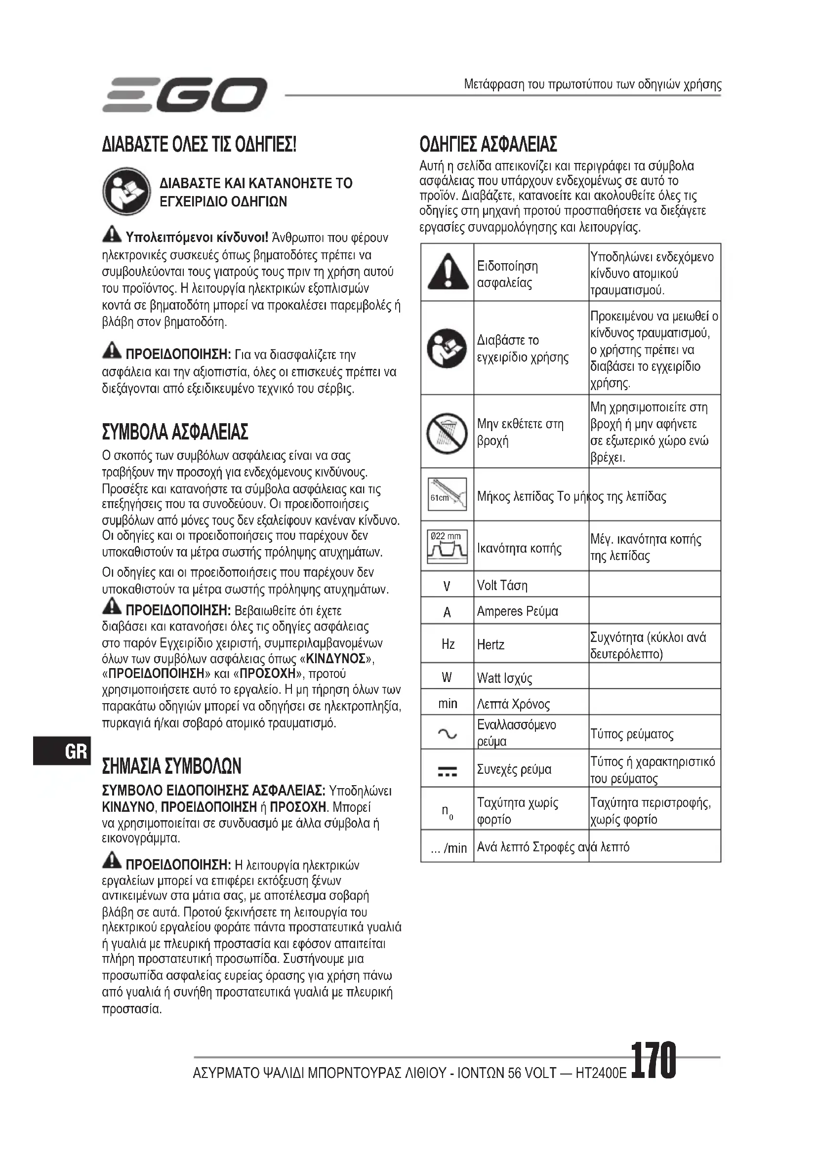 ΠΟΛΙΤΙΚΗ ΕΓΓΥΗΣΗΣ EGO Επισκεφθείτε την ιστοσελίδα egopowerplus.com για όλους τους όρους και τις προϋποθέσεις της πολιτικής εγγύησης EGO.56 VOLT LİTYUM-İYON KABLOSUZ ÇİT BUDAMA MAKİNESİ — HT2400E