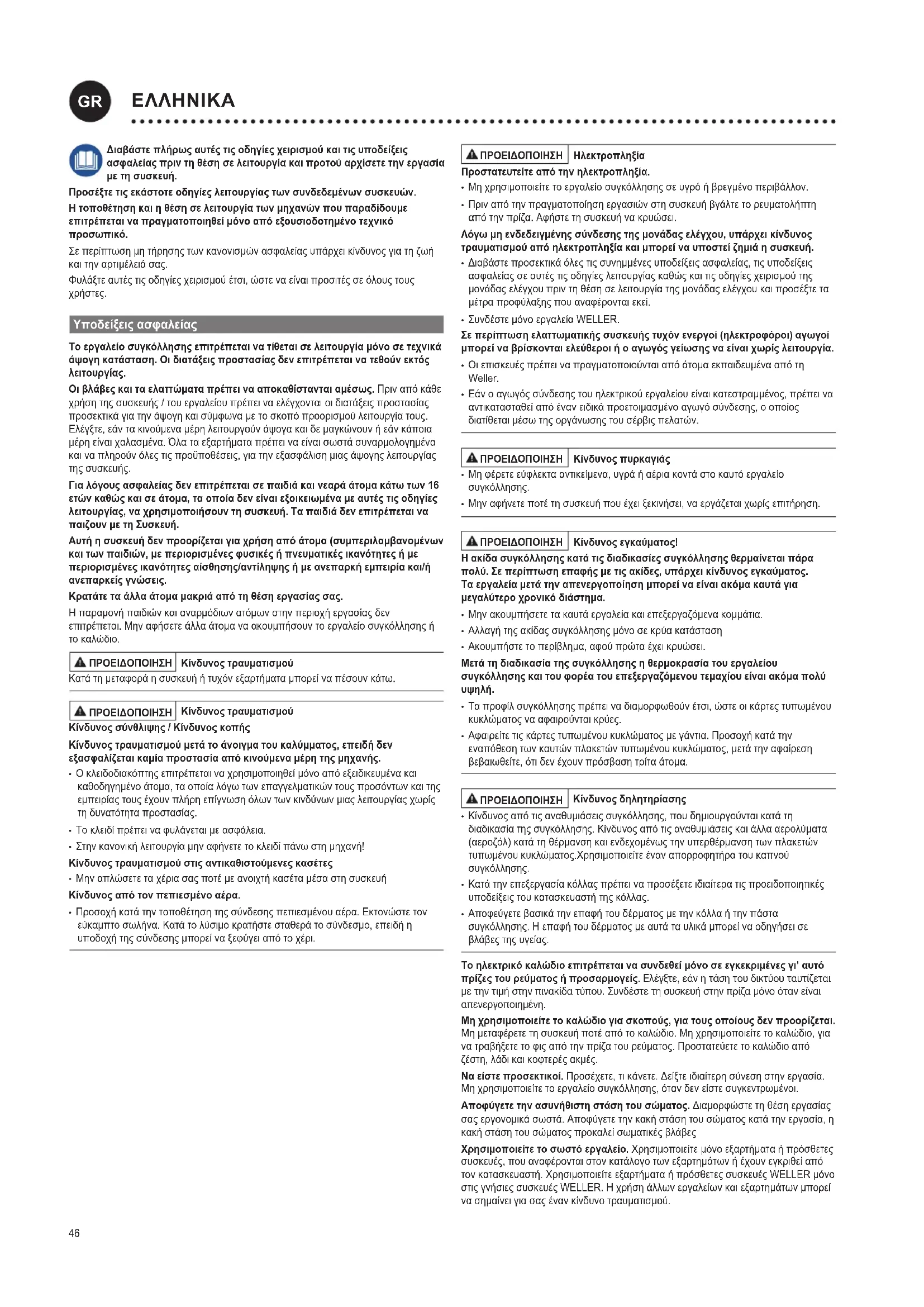 - ΣυνδέστεμόνοεργαλείαWELLER. Σε περίπτωση ελαττωματικής συσκευής τυχόν ενεργοί (ηλεκτροφόροι) αγωγοί μπορεί να βρίσκονται ελεύθεροι ή ο αγωγός γείωσης να είναι χωρίς λειτουργία.