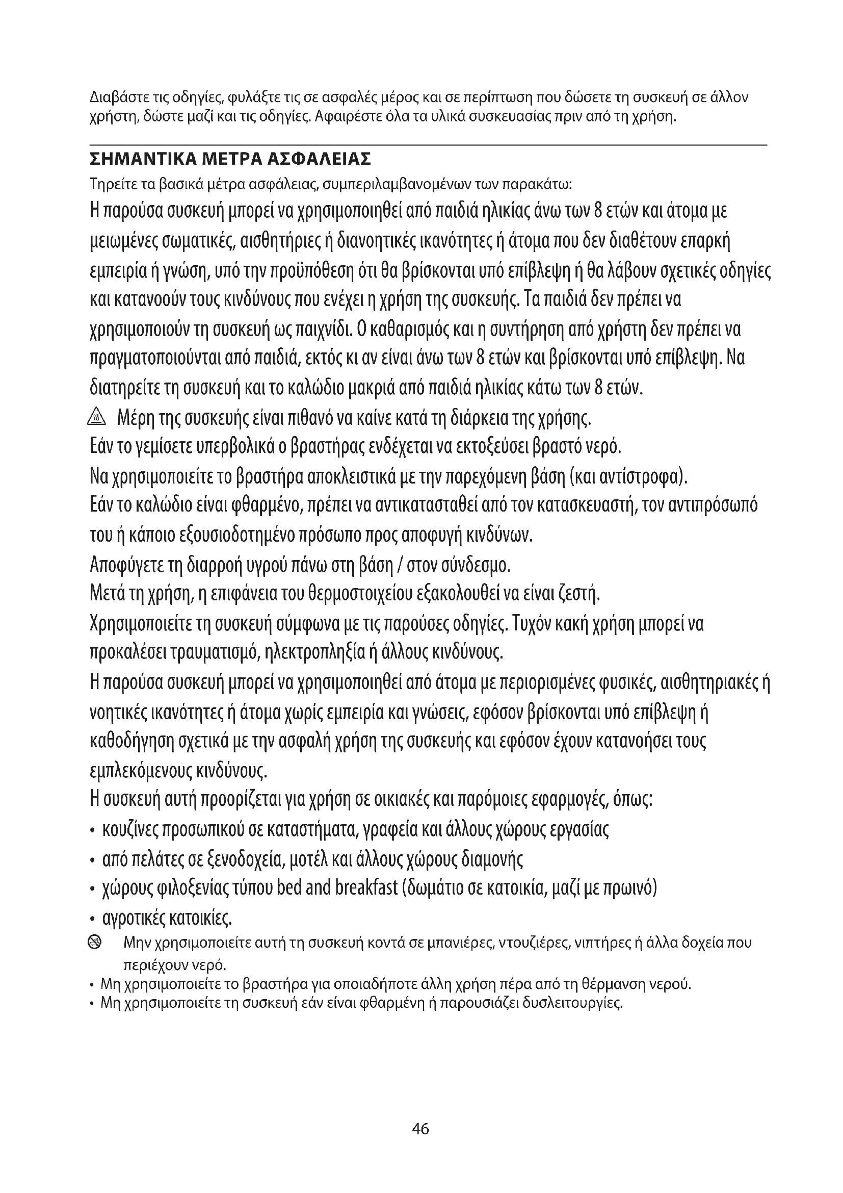 Τηρείτε τα βασικά μέτρα ασφάλειας, συμπεριλαμβανομένων των παρακάτω: Η παρούσα συσκευή μπορεί να χρησιμοποιηθεί από παιδιά ηλικίας άνω των 8 ετών και άτομα με μειωμένες σωματικές, αισθητήριες ή διανοητικές ικανότητες ή άτομα που δεν διαθέτουν επαρκή εμπειρία ή γνώση, υπό την προϋπόθεση ότι θα βρίσκονται υπό επίβλεψη ή θα λάβουν σχετικές οδηγίες και κατανοούν τους κινδύνους που ενέχει η χρήση της συσκευής. Τα παιδιά δεν πρέπει να χρησιμοποιούν τη συσκευή ως παιχνίδι. Ο καθαρισμός και η συντήρηση από χρήστη δεν πρέπει να πραγματοποιούνται από παιδιά, εκτός κι αν είναι άνω των 8 ετών και βρίσκονται υπό επίβλεψη. Να διατηρείτε τη συσκευή και το καλώδιο μακριά από παιδιά ηλικίας κάτω των 8 ετών. h Μέρη της συσκευής είναι πιθανό να καίνε κατά τη διάρκεια της χρήσης. Εάν το γεμίσετε υπερβολικά ο βραστήρας ενδέχεται να εκτοξεύσει βραστό νερό. Να χρησιμοποιείτε το βραστήρα αποκλειστικά με την παρεχόμενη βάση (και αντίστροφα). Εάν το καλώδιο είναι φθαρμένο, πρέπει να αντικατασταθεί από τον κατασκευαστή, τον αντιπρόσωπό του ή κάποιο εξουσιοδοτημένο πρόσωπο προς αποφυγή κινδύνων. Αποφύγετε τη διαρροή υγρού πάνω στη βάση / στον σύνδεσμο. Μετά τη χρήση, η επιφάνεια του θερμοστοιχείου εξακολουθεί να είναι ζεστή. Χρησιμοποιείτε τη συσκευή σύμφωνα με τις παρούσες οδηγίες. Τυχόν κακή χρήση μπορεί να προκαλέσει τραυματισμό, ηλεκτροπληξία ή άλλους κινδύνους. Η παρούσα συσκευή μπορεί να χρησιμοποιηθεί από άτομα με περιορισμένες φυσικές, αισθητηριακές ή νοητικές ικανότητες ή άτομα χωρίς εμπειρία και γνώσεις, εφόσον βρίσκονται υπό επίβλεψη ή καθοδήγηση σχετικά με την ασφαλή χρήση της συσκευής και εφόσον έχουν κατανοήσει τους εμπλεκόμενους κινδύνους. Η συσκευή αυτή προορίζεται για χρήση σε οικιακές και παρόμοιες εφαρμογές, όπως: