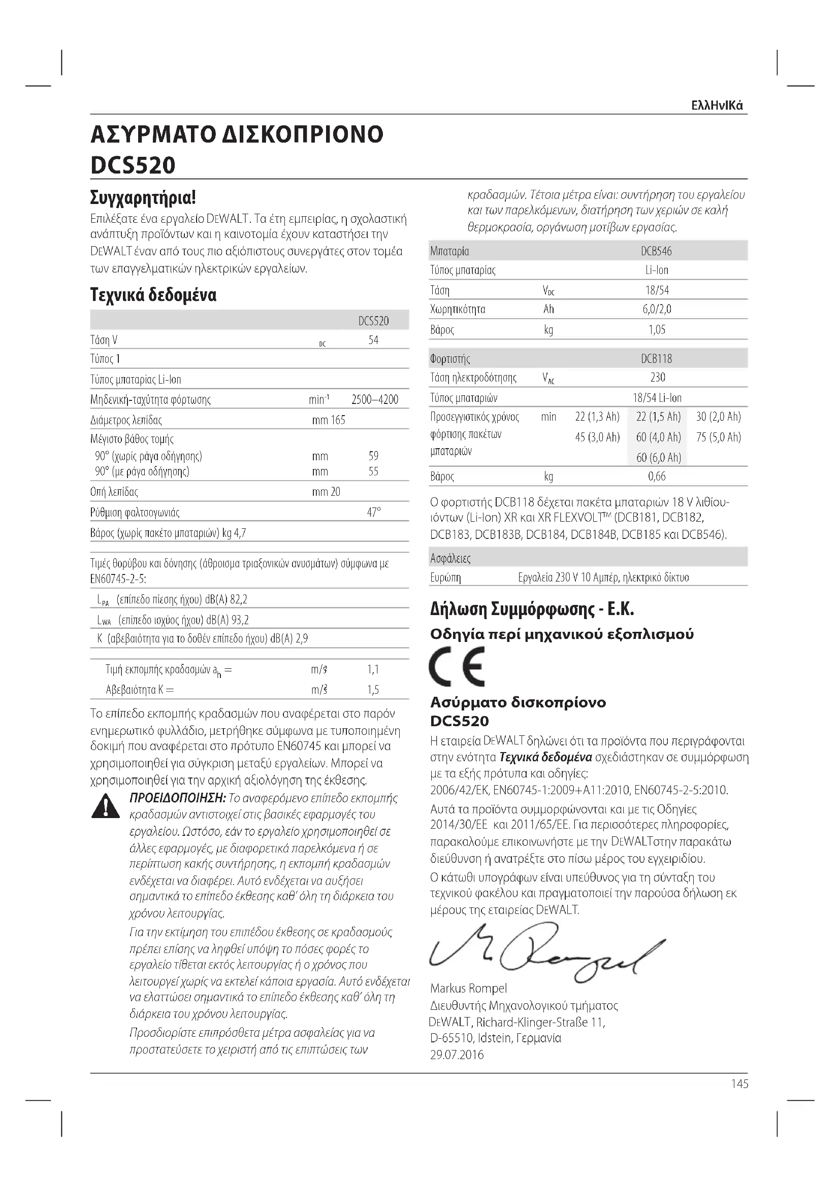 Συγχαρητήρια! Επιλέξατε ένα εργαλείο DeWALT . Τα έτη εμπειρίας, η σχολαστική ανάπτυξη προϊόντων και ηκαινοτομία έχουν καταστήσει την DeWALT έναν από τους πιο αξιόπιστους συνεργάτες στον τομέα των επαγγελματικών ηλεκτρικώνεργαλείων. Τεχνικά δεδομένα DCS520 Τάση V