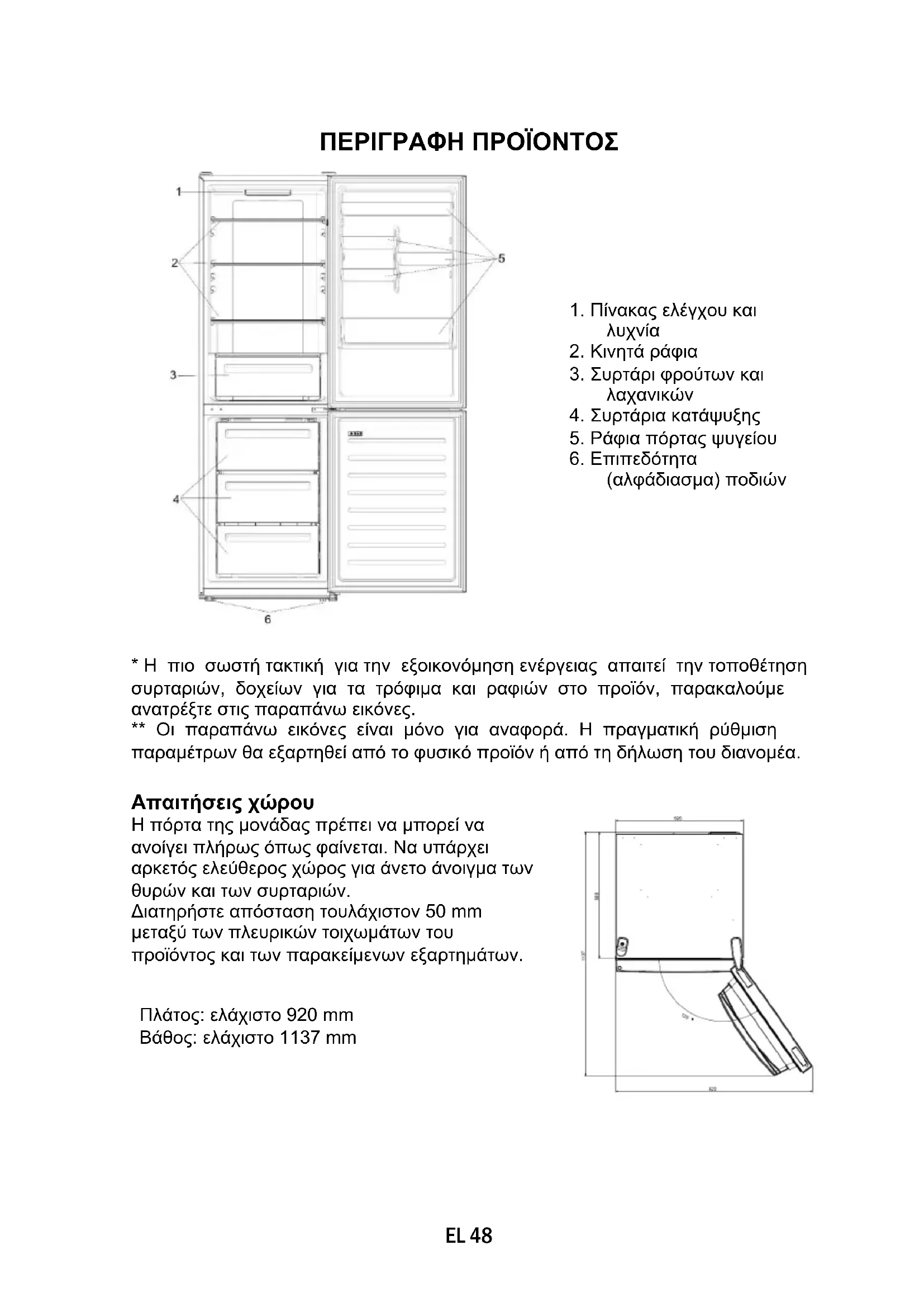 - Η πιο σωστή τακτική για την εξοικονόμηση ενέργειας απαιτεί την τοποθέτηση συρταριών, δοχείων για τα τρόφιμα και ραφιών στο προϊόν, παρακαλούμε ανατρέξτε στις παραπάνω εικόνες. ** Οι παραπάνω εικόνες είναι μόνο για αναφορά. Η πραγματική ρύθμιση παραμέτρων θα εξαρτηθεί από το φυσικό προϊόν ή από τη δήλωση του διανομέα. Απαιτήσεις χώρου Πλάτος: ελάχιστο 920 mm Βάθος: ελάχιστο 1137 mm Η πόρτα της μονάδας πρέπει να μπορεί να ανοίγει πλήρως όπως φαίνεται. Να υπάρχει αρκετός ελεύθερος χώρος για άνετο άνοιγμα των θυρών και των συρταριών. Διατηρήστε απόσταση τουλάχιστον 50 mm μεταξύ των πλευρικών τοιχωμάτων του προϊόντος και των παρακείμενων εξαρτημάτων.EL 49