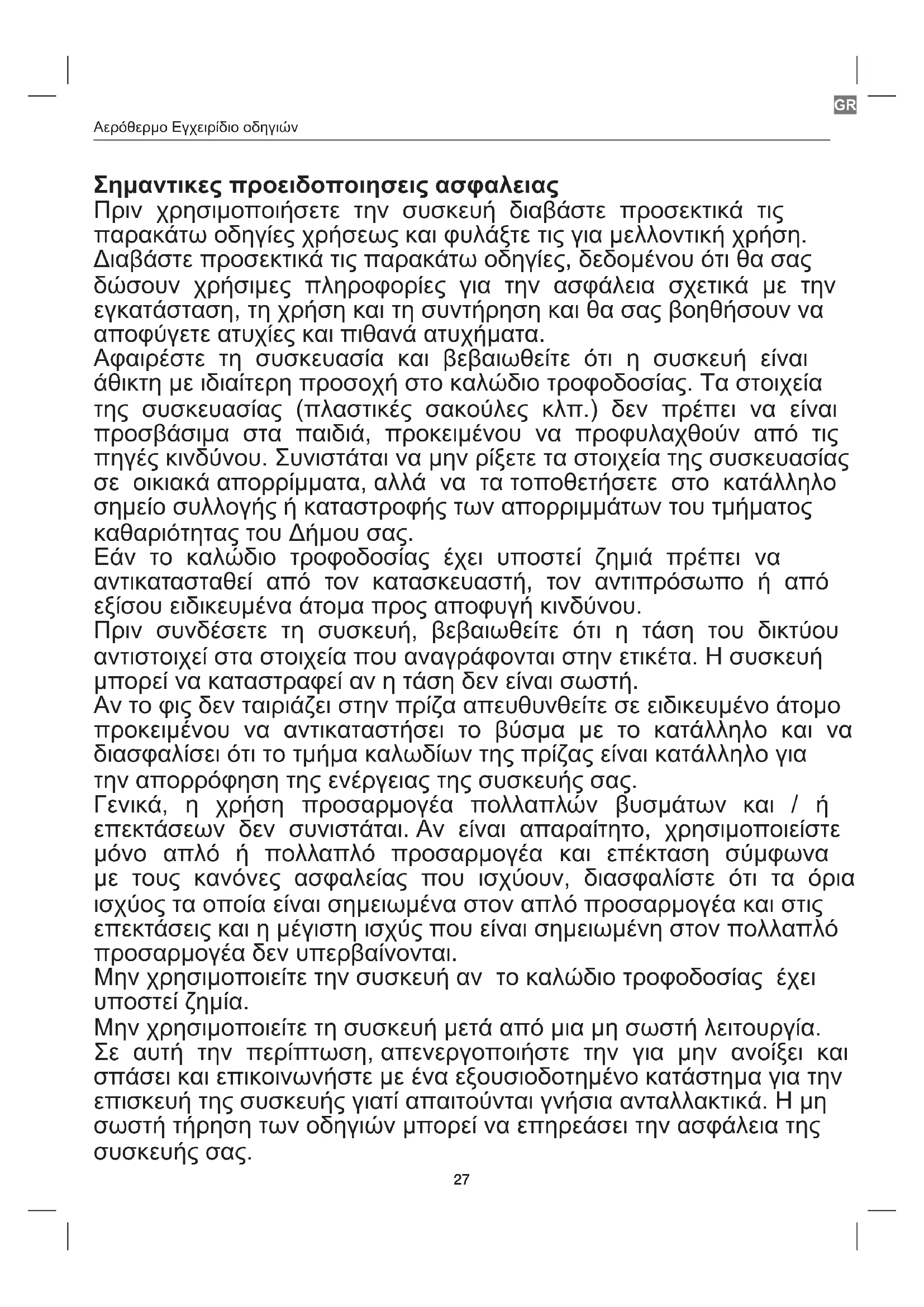 Σημαντικες προειδοποιησεις ασφαλειας Πριν χρησιμοποιήσετε την συσκευή διαβάστε προσεκτικά τις παρακάτω οδηγίες χρήσεως και φυλάξτε τις για μελλοντική χρήση. Διαβάστε προσεκτικά τις παρακάτω οδηγίες, δεδομένου ότι θα σας δώσουν χρήσιμες πληροφορίες για την ασφάλεια σχετικά με την εγκατάσταση, τη χρήση και τη συντήρηση και θα σας βοηθήσουν να αποφύγετε ατυχίες και πιθανά ατυχήματα. Αφαιρέστε τη συσκευασία και βεβαιωθείτε ότι η συσκευή είναι άθικτη με ιδιαίτερη προσοχή στο καλώδιο τροφοδοσίας. Τα στοιχεία της συσκευασίας (πλαστικές σακούλες κλπ.) δεν πρέπει να είναι προσβάσιμα στα παιδιά, προκειμένου να προφυλαχθούν από τις πηγές κινδύνου. Συνιστάται να μην ρίξετε τα στοιχεία της συσκευασίας σε οικιακά απορρίμματα, αλλά να τα τοποθετήσετε στο κατάλληλο σημείο συλλογής ή καταστροφής των απορριμμάτων του τμήματος καθαριότητας του Δήμου σας. Εάν το καλώδιο τροφοδοσίας έχει υποστεί ζημιά πρέπει να αντικατασταθεί από τον κατασκευαστή, τον αντιπρόσωπο ή από εξίσου ειδικευμένα άτομα προς αποφυγή κινδύνου. Πριν συνδέσετε τη συσκευή, βεβαιωθείτε ότι η τάση του δικτύου αντιστοιχεί στα στοιχεία που αναγράφονται στην ετικέτα. Η συσκευή μπορεί να καταστραφεί αν η τάση δεν είναι σωστή. Αν το φις δεν ταιριάζει στην πρίζα απευθυνθείτε σε ειδικευμένο άτομο προκειμένου να αντικαταστήσει το βύσμα με το κατάλληλο και να διασφαλίσει ότι το τμήμα καλωδίων της πρίζας είναι κατάλληλο για την απορρόφηση της ενέργειας της συσκευής σας. Γενικά, η χρήση προσαρμογέα πολλαπλών βυσμάτων και / ή επεκτάσεων δεν συνιστάται. Αν είναι απαραίτητο, χρησιμοποιείστε μόνο απλό ή πολλαπλό προσαρμογέα και επέκταση σύμφωνα με τους κανόνες ασφαλείας που ισχύουν, διασφαλίστε ότι τα όρια ισχύος τα οποία είναι σημειωμένα στον απλό προσαρμογέα και στις επεκτάσεις και η μέγιστη ισχύς που είναι σημειωμένη στον πολλαπλό προσαρμογέα δεν υπερβαίνονται. Μην χρησιμοποιείτε την συσκευή αν το καλώδιο τροφοδοσίας έχει υποστεί ζημία. Μην χρησιμοποιείτε τη συσκευή μετά από μια μη σωστή λειτουργία. Σε αυτή την περίπτωση, απενεργοποιήστε την για μην ανοίξει και σπάσει και επικοινωνήστε με ένα εξουσιοδοτημένο κατάστημα για την επισκευή της συσκευής γιατί απαιτούνται γνήσια ανταλλακτικά. Η μη σωστή τήρηση των οδηγιών μπορεί να επηρεάσει την ασφάλεια της συσκευής σας.Αερόθερμο Εγχειρίδιο οδηγιών