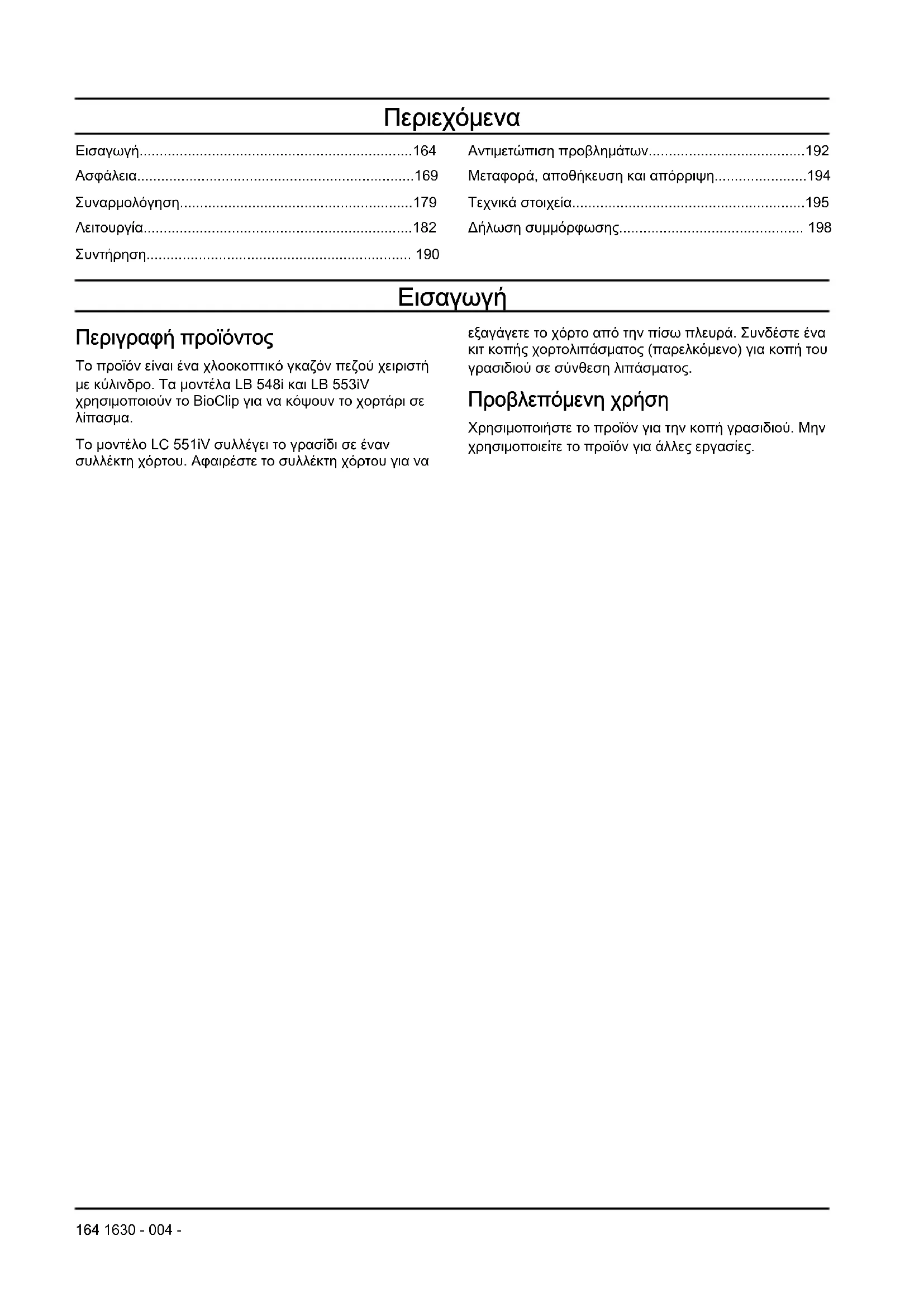 Το μοντέλο LC551iV συλλέγει το γρασίδι σε έναν συλλέκτη χόρτου. Αφαιρέστε το συλλέκτη χόρτου για να εξαγάγετε το χόρτο από την πίσω πλευρά. Συνδέστε ένα κιτ κοπής χορτολιπάσματος (παρελκόμενο) για κοπή του γρασιδιού σε σύνθεση λιπάσματος. Προβλεπόμενη χρήση Χρησιμοποιήστε το προϊόν για την κοπή γρασιδιού. Μην χρησιμοποιείτε το προϊόν για άλλες εργασίες. 164 1630 - 004 -Επισκόπηση προϊόντος (LB548i, LC551iV) LB 548i LC 551iV