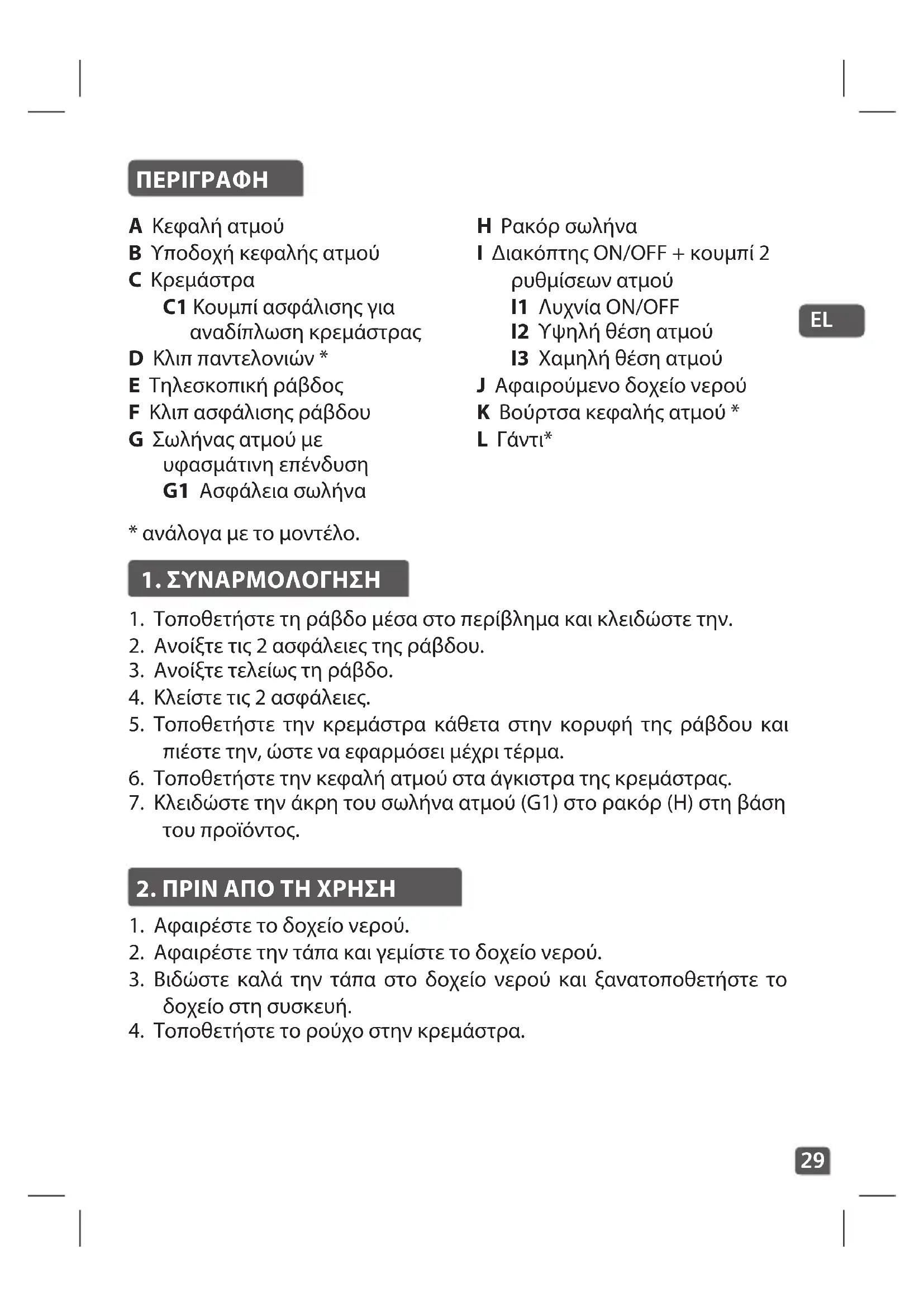 A Κεφαλή ατμού B Υποδοχή κεφαλής ατμού C Κρεμάστρα C1 Κουμπί ασφάλισης για αναδίπλωση κρεμάστρας D Κλιπ παντελονιών * E Τηλεσκοπική ράβδος F Κλιπ ασφάλισης ράβδου G Σωλήνας ατμού με υφασμάτινη επένδυση G1 Ασφάλεια σωλήνα H Ρακόρ σωλήνα I Διακόπτης ON/OFF + κουμπί 2 ρυθμίσεων ατμού I1 Λυχνία ON/OFF I2 Υψηλή θέση ατμού I3 Χαμηλή θέση ατμού J Αφαιρούμενο δοχείο νερού K Βούρτσα κεφαλής ατμού * L Γάντι*