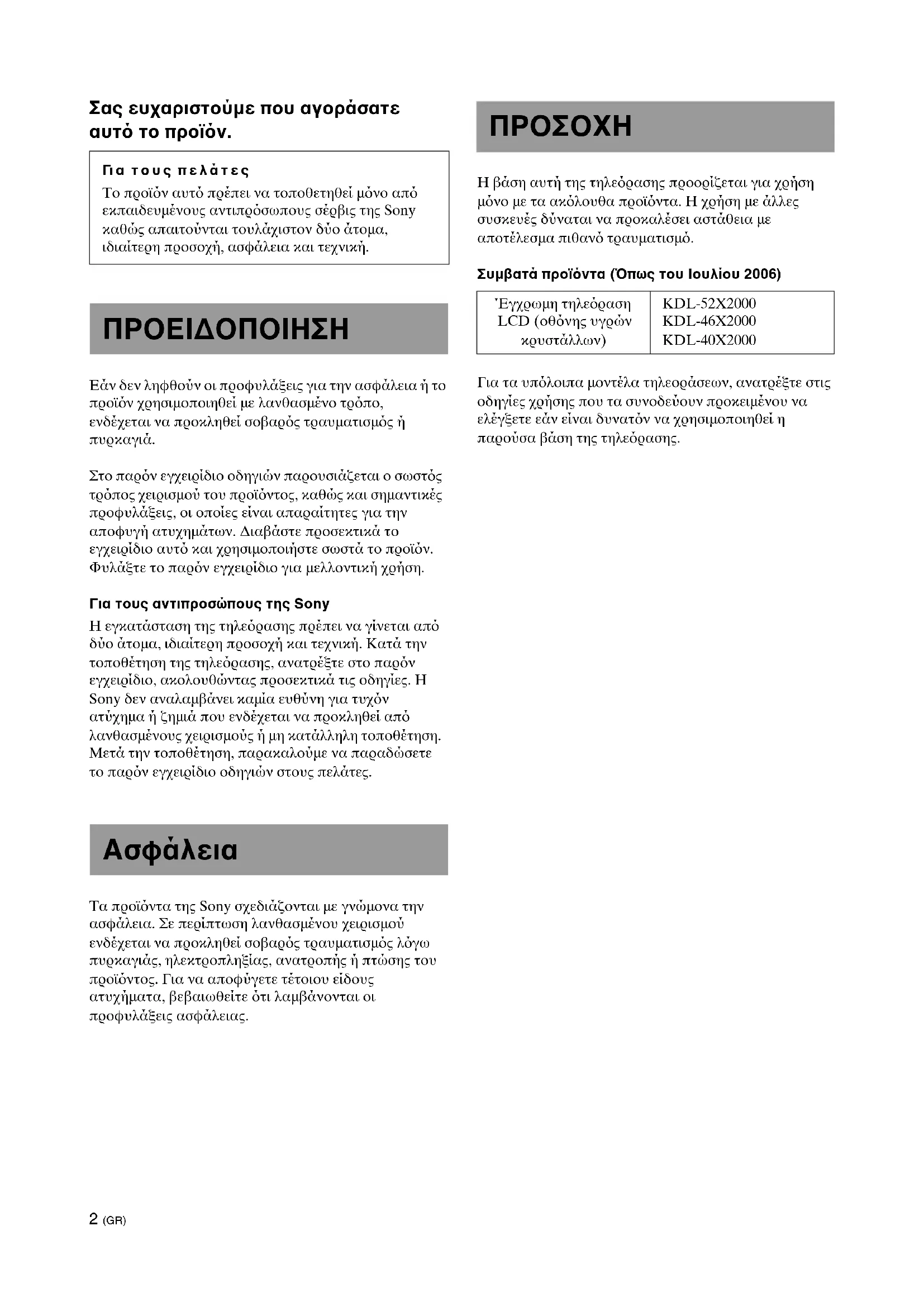 Στο παρν εγχειρίδιο οδηγιών παρουσιάζεται ο σωστς τρπος χειρισµού του προϊντος, καθώς και σηµαντικές προφυλάξεις, οι οποίες είναι απαραίτητες για την αποφυγή ατυχηµάτων. ∆ιαβάστε προσεκτικά το εγχειρίδιο αυτ και χρησιµοποιήστε σωστά το προϊν. Φυλάξτε το παρν εγχειρίδιο για µελλοντική χρήση. Για τους αντιπροσώπους της Sony Η εγκατάσταση της τηλερασης πρέπει να γίνεται απ δύο άτοµα, ιδιαίτερη προσοχή και τεχνική. Κατά την τοποθέτηση της τηλερασης, ανατρέξτε στο παρν εγχειρίδιο, ακολουθώντας προσεκτικά τις οδηγίες. Η Sony δεν αναλαµβάνει καµία ευθύνη για τυχν ατύχηµα ή ζηµιά που ενδέχεται να προκληθεί απ λανθασµένους χειρισµούς ή µη κατάλληλη τοποθέτηση. Μετά την τοποθέτηση, παρακαλούµε να παραδώσετε το παρν εγχειρίδιο οδηγιών στους πελάτες. Τα προϊντα της Sony σχεδιάζονται µε γνώµονα την ασφάλεια. Σε περίπτωση λανθασµένου χειρισµού ενδέχεται να προκληθεί σοβαρς τραυµατισµς λγω πυρκαγιάς, ηλεκτροπληξίας, ανατροπής ή πτώσης του προϊντος. Για να αποφύγετε τέτοιου είδους ατυχήµατα, βεβαιωθείτε τι λαµβάνονται οι προφυλάξεις ασφάλειας. Η βάση αυτή της τηλερασης προορίζεται για χρήση µνο µε τα ακλουθα προϊντα. Η χρήση µε άλλες συσκευές δύναται να προκαλέσει αστάθεια µε αποτέλεσµα πιθαν τραυµατισµ. Συµβατά προϊντα (πως του Ιουλίου 2006) Για τα υπλοιπα µοντέλα τηλεοράσεων, ανατρέξτε στις οδηγίες χρήσης που τα συνοδεύουν προκειµένου να ελέγξετε εάν είναι δυνατν να χρησιµοποιηθεί η παρούσα βάση της τηλερασης. Γι α τ ο υ ς π ε λ ά τ ε ς Το προϊν αυτ πρέπει να τοποθετηθεί µνο απ εκπαιδευµένους αντιπρσωπους σέρβις της Sony καθώς απαιτούνται τουλάχιστον δύο άτοµα, ιδιαίτερη προσοχή, ασφάλεια και τεχνική. ΠΡΟΕΙ∆ΟΠΟΙΗΣΗ