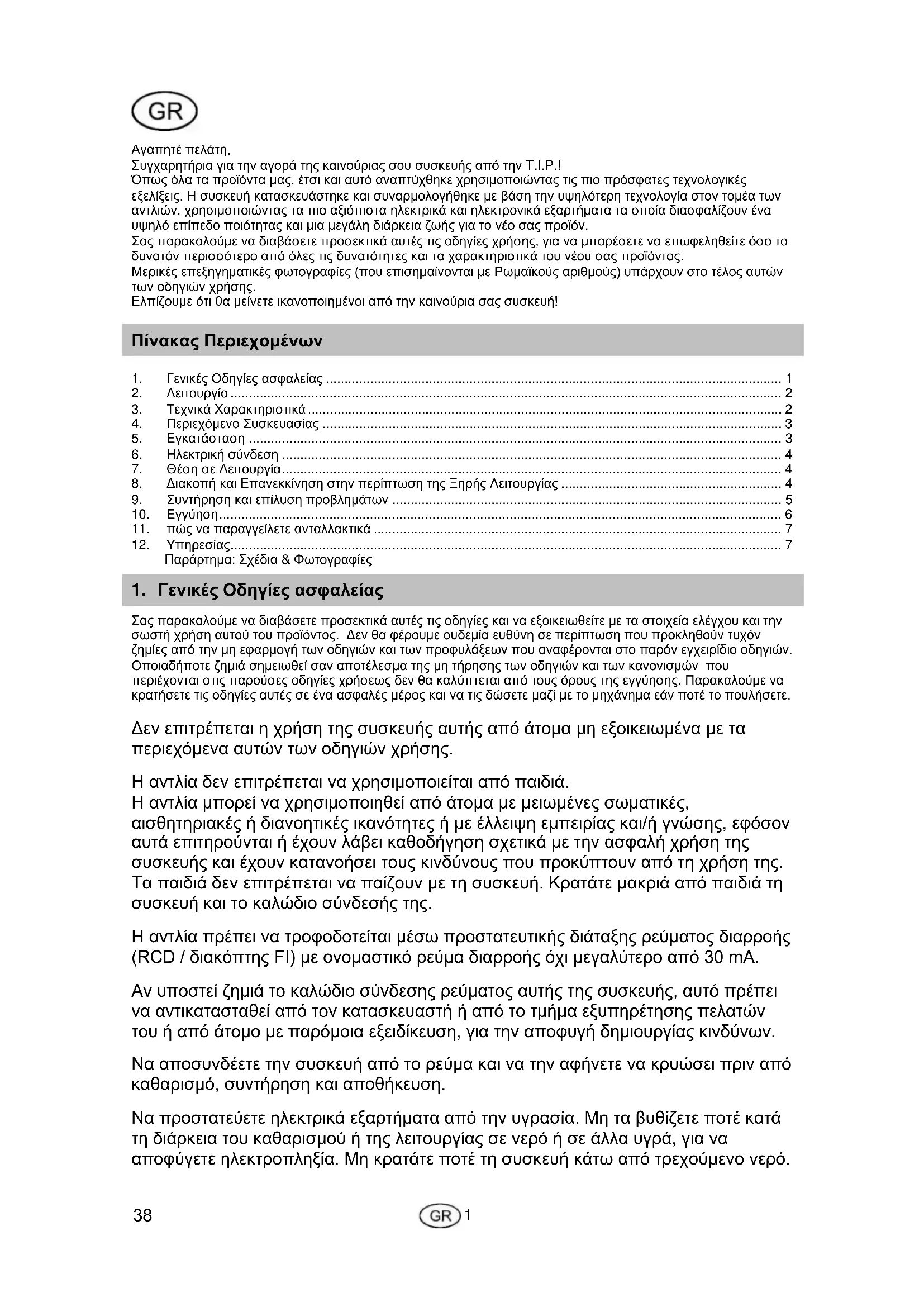 - Αγαπητέ πελάτη, Συγχαρητήρια για την αγορά της καινούριας σου συσκευής από την T.I.P.! Όπως όλα τα προϊόντα μας, έτσι και αυτό αναπτύχθηκε χρησιμοποιώντας τις πιο πρόσφατες τεχνολογικές εξελίξεις. Η συσκευή κατασκευάστηκε και συναρμολογήθηκε με βάση την υψηλότερη τεχνολογία στον τομέα των αντλιών, χρησιμοποιώντας τα πιο αξιόπιστα ηλεκτρικά και ηλεκτρονικά εξαρτήματα τα οποία διασφαλίζουν ένα υψηλό επίπεδο ποιότητας και μια μεγάλη διάρκεια ζωής για το νέο σας προϊόν. Σας παρακαλούμε να διαβάσετε προσεκτικά αυτές τις οδηγίες χρήσης, για να μπορέσετε να επωφεληθείτε όσο το δυνατόν περισσότερο από όλες τις δυνατότητες και τα χαρακτηριστικά του νέου σας προϊόντος. Μερικές επεξηγηματικές φωτογραφίες (που επισημαίνονται με Ρωμαϊκούς αριθμούς) υπάρχουν στο τέλος αυτών των οδηγιών χρήσης. Ελπίζουμε ότι θα μείνετε ικανοποιημένοι από την καινούρια σας συσκευή! Πίνακας Περιεχομένων 1. Γενικές Οδηγίες ασφαλείας p. 1