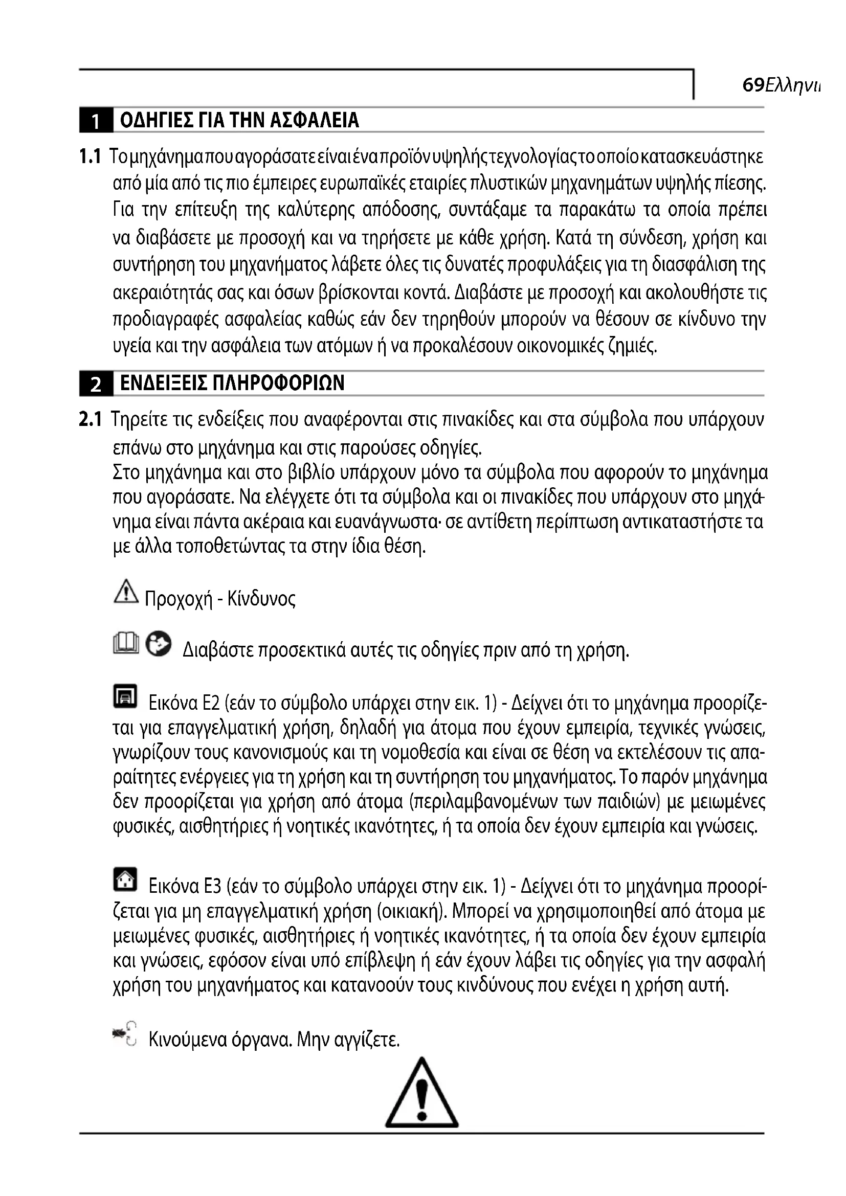 από μία από τις πιο έμπειρες ευρωπαϊκές εταιρίες πλυστικών μηχανημάτων υψηλής πίεσης. Για την επίτευξη της καλύτερης απόδοσης, συντάξαμε τα παρακάτω τα οποία πρέπει να διαβάσετε με προσοχή και να τηρήσετε με κάθε χρήση. Κατά τη σύνδεση, χρήση και συντήρηση του μηχανήματος λάβετε όλες τις δυνατές προφυλάξεις για τη διασφάλιση της ακεραιότητάς σας και όσων βρίσκονται κοντά. Διαβάστε με προσοχή και ακολουθήστε τις προδιαγραφές ασφαλείας καθώς εάν δεν τηρηθούν μπορούν να θέσουν σε κίνδυνο την υγεία και την ασφάλεια των ατόμων ή να προκαλέσουν οικονομικές ζημιές.