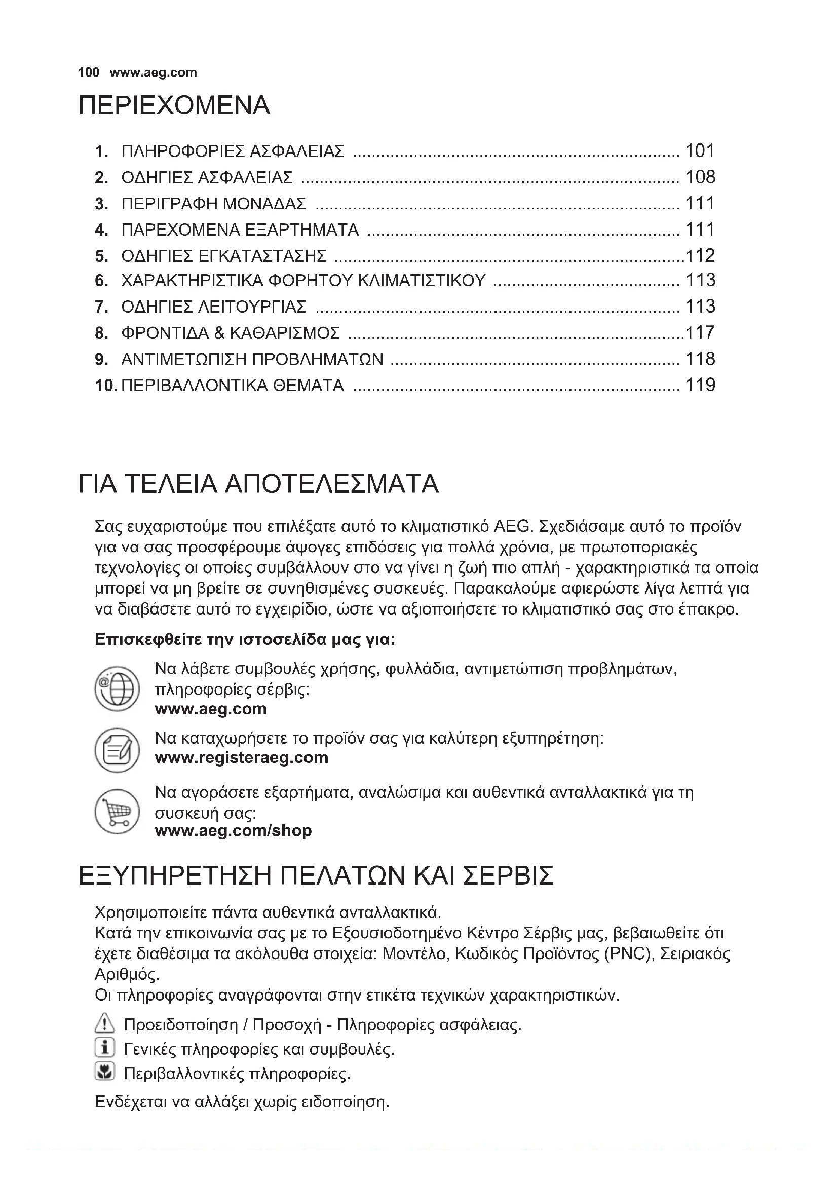 ΠΕΡΙΕΧΟΜΕΝΑ Προειδοποίηση / Προσοχή - Πληροφορίες ασφάλειας. Γενικές πληροφορίες και συμβουλές. Περιβαλλοντικές πληροφορίες.101