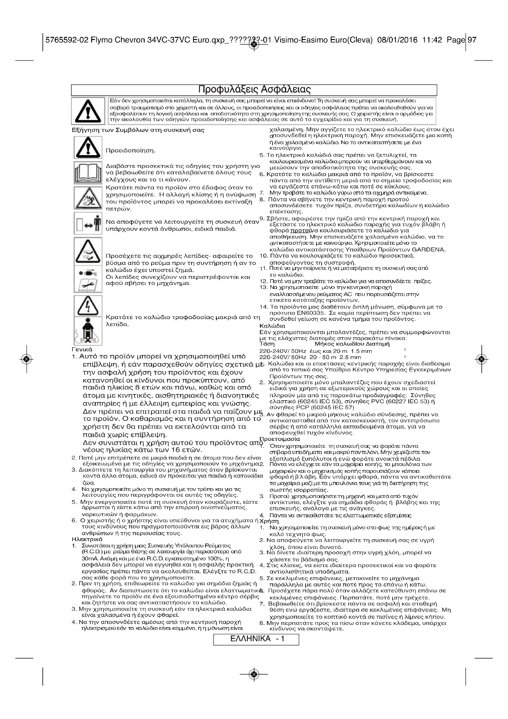 5765592-02 Flymo Chevron 34VC-37VC Euro.qxp_???????-01 Visimo-Easimo Euro(Cleva) 08/01/2016 11:42 Page 96Προφυλάξεις Ασφάλειας Εάν δεν χρησιµοποιείται κατάλληλα, τη συσκευή σας µπορεί να είναι επικίνδυνο! Τη συσκευή σας µπορεί να προκαλέσει σοβαρό τραυµατισµό στο χειριστή και σε άλλους, οι προειδοποιήσεις και οι οδηγίες ασφάλειας πρέπει να ακολουθηθούν για να εξασφαλίσουν τη λογική ασφάλεια και αποδοτικότητα στη χρησιµοποίηση της συσκευής σας. Ο χειριστής είναι ο αρµόδιος για την ακολουθία των οδηγιών προειδοποίησης και ασφάλειας σε αυτό το εγχειρίδιο και για τη συσκευή. Εξήγηση των Συµβόλων στη συσκευή σας Προειδοποίηση. ∆ιαβάστε προσεκτικά τις οδηγίες του χρήστη για να βεβαιωθείτε ότι καταλαβαίνετε όλους τους ελέγχους και το τι κάνουν. Κρατάτε πάντα το προϊόν στο έδαφος όταν το χρησιμοποιείτε. Η αλλαγή κλίσης ή η ανύψωση του προϊόντος μπορεί να προκαλέσει εκτίναξη