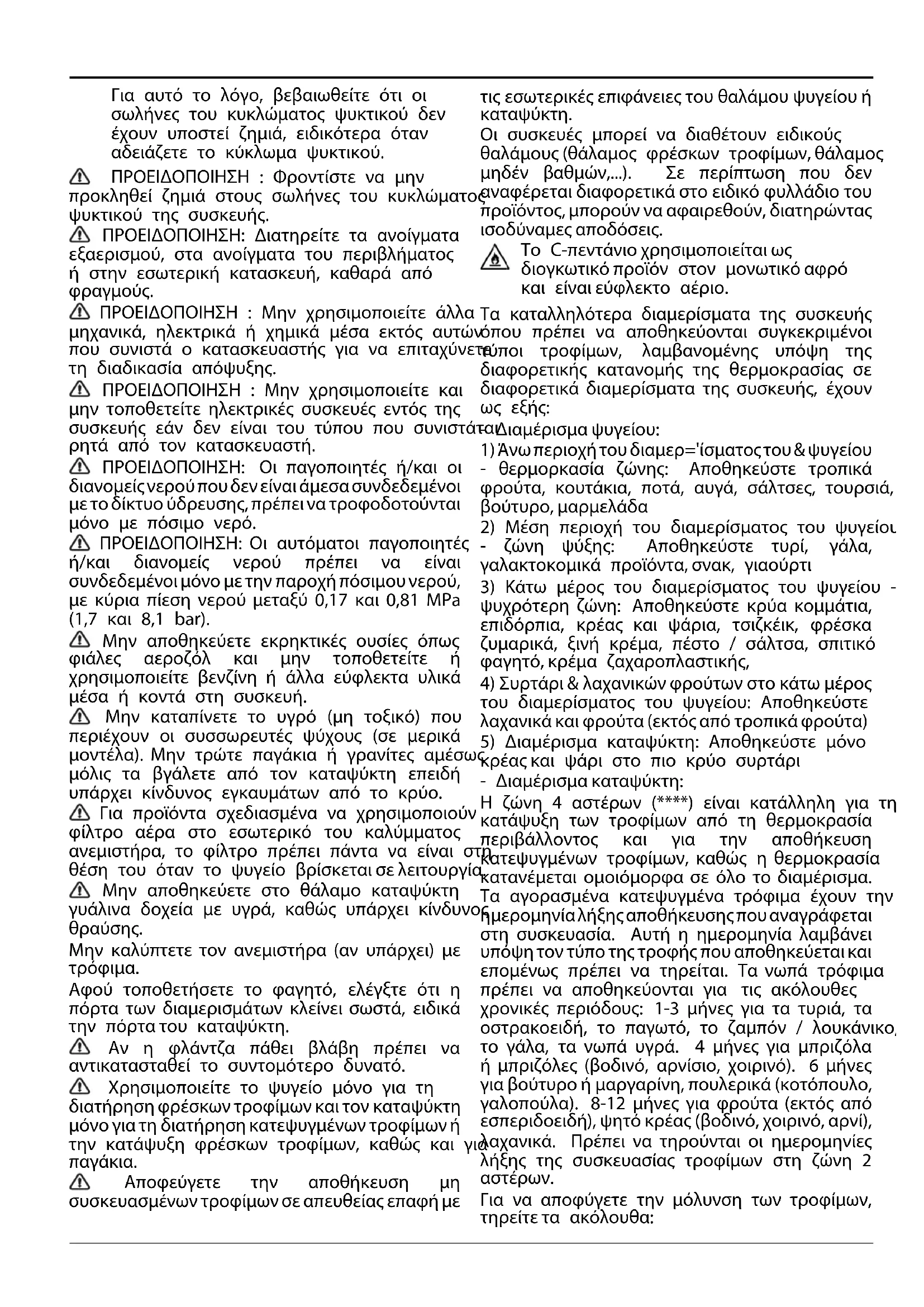 ΠΡΟΕΙΔΟΠΟΙΗΣΗ : Μην χρησιμοποιείτε άλλα μηχανικά, ηλεκτρικά ή χημικά μέσα εκτός αυτών που συνιστά ο κατασκευαστής για να επιταχύνετε τη διαδικασία απόψυξης. ΠΡΟΕΙΔΟΠΟΙΗΣΗ : Μην χρησιμοποιείτε και μην τοποθετείτε ηλεκτρικές συσκευές εντός της συσκευής εάν δεν είναι του τύπου που συνιστάται ρητά από τον κατασκευαστή. ΠΡΟΕΙΔΟΠΟΙΗΣΗ: Οι παγοποιητές ή/και οι διανομείςνερούπουδενείναιάμεσασυνδεδεμένοι με το δίκτυο ύδρευσης, πρέπει να τροφοδοτούνται μόνο με πόσιμο νερό. ΠΡΟΕΙΔΟΠΟΙΗΣΗ: Οι αυτόματοι παγοποιητές ή/και διανομείς νερού πρέπει να είναι συνδεδεμένοι μόνο με την παροχή πόσιμου νερού, με κύρια πίεση νερού μεταξύ 0,17 και 0,81 MPa (1,7 και 8,1 bar). Μην αποθηκεύετε εκρηκτικές ουσίες όπως φιάλες αεροζόλ και μην τοποθετείτε ή χρησιμοποιείτε βενζίνη ή άλλα εύφλεκτα υλικά μέσα ή κοντά στη συσκευή. Μην καταπίνετε το υγρό (μη τοξικό) που περιέχουν οι συσσωρευτές ψύχους (σε μερικά μοντέλα). Μην τρώτε παγάκια ή γρανίτες αμέσως μόλις τα βγάλετε από τον καταψύκτη επειδή υπάρχει κίνδυνος εγκαυμάτων από το κρύο. Για προϊόντα σχεδιασμένα να χρησιμοποιούν φίλτρο αέρα στο εσωτερικό του καλύμματος ανεμιστήρα, το φίλτρο πρέπει πάντα να είναι στη θέση του όταν το ψυγείο βρίσκεται σε λειτουργία. Μην αποθηκεύετε στο θάλαμο καταψύκτη γυάλινα δοχεία με υγρά, καθώς υπάρχει κίνδυνος