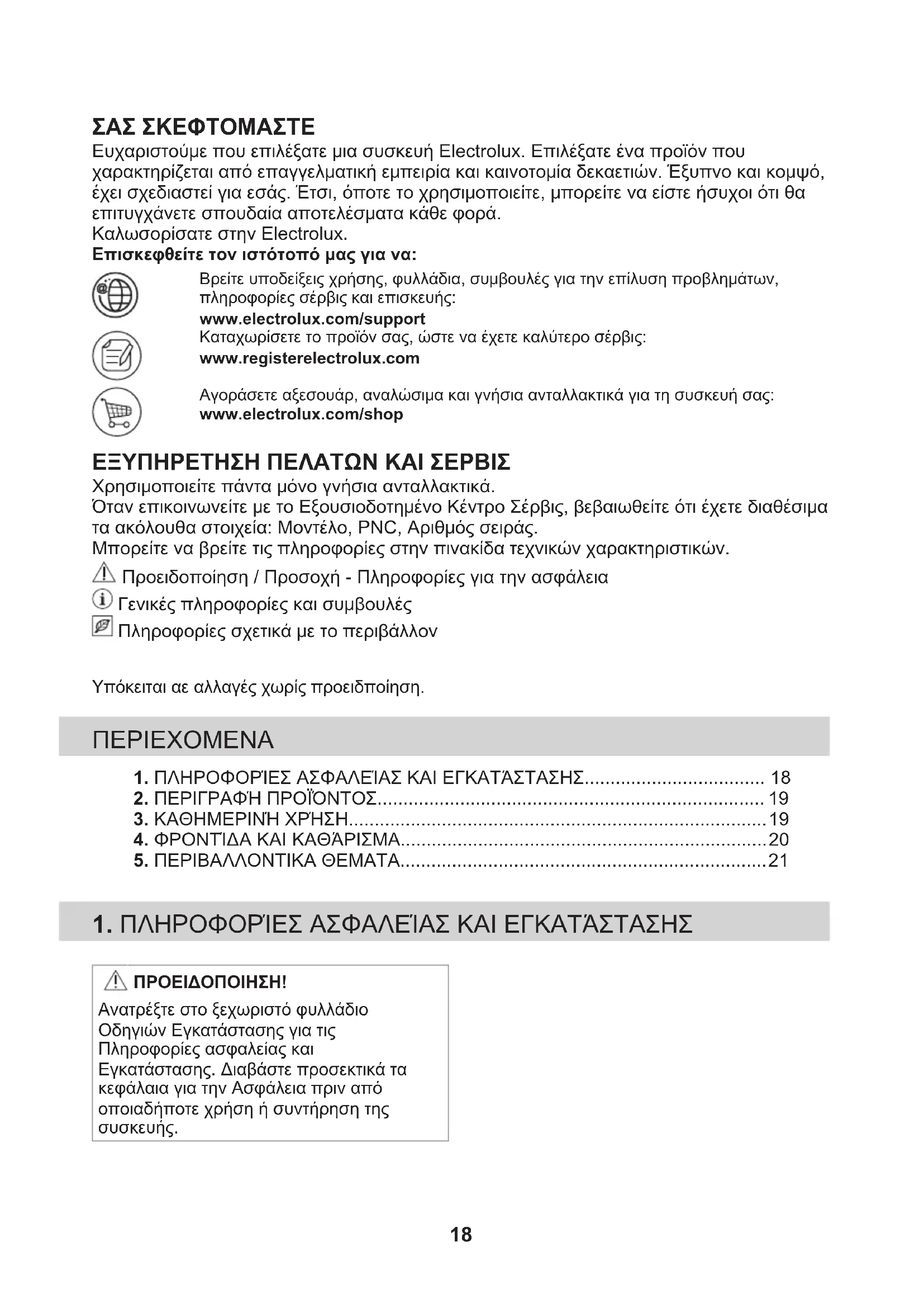 Recyceln Sie Materialien mit dem Symbol . Entsorgen Sie die Verpackung in den entsprechenden Recyclingbehältern. Recyceln Sie zum Umwelt- und Gesundheitsschutz elektrische und elektronische Geräte. Entsorgen Sie Geräte mit diesem Symbol nicht mit dem Hausmüll. Bringen Sie das Gerät zu Ihrer örtlichen Sammelstelle oder wenden Sie sich an Ihr Gemeindeamt. 17ΣΑΣ ΣΚΕΦΤΟΜΑΣΤΕ Ευχαριστούμε που επιλέξατε μια συσκευή Electrolux. Επιλέξατε ένα προϊόν που χαρακτηρίζεται από επαγγελματική εμπειρία και καινοτομία δεκαετιών. Έξυπνο και κομψό, έχει σχεδιαστεί για εσάς. Έτσι, όποτε το χρησιμοποιείτε, μπορείτε να είστε ήσυχοι ότι θα επιτυγχάνετε σπουδαία αποτελέσματα κάθε φορά. Καλωσορίσατε στην Electrolux. Επισκεφθείτε τον ιστότοπό μας για να: Βρείτε υποδείξεις χρήσης, φυλλάδια, συμβουλές για την επίλυση προβλημάτων,πληροφορίες σέρβις και επισκευής:www.electrolux.com/supportΚαταχωρίσετε το προϊόν σας, ώστε να έχετε καλύτερο σέρβις:www.registerelectrolux.comΑγοράσετε αξεσουάρ, αναλώσιμα και γνήσια ανταλλακτικά για τη συσκευή σας:www.electrolux.com/shop ΕΞΥΠΗΡΕΤΗΣΗ ΠΕΛΑΤΩΝ ΚΑΙ ΣΕΡΒΙΣ Χρησιμοποιείτε πάντα μόνο γνήσια ανταλλακτικά. Όταν επικοινωνείτε με το Εξουσιοδοτημένο Κέντρο Σέρβις, βεβαιωθείτε ότι έχετε διαθέσιμα τα ακόλουθα στοιχεία: Μοντέλο, PNC, Αριθμός σειράς. Μπορείτε να βρείτε τις πληροφορίες στην πινακίδα τεχνικών χαρακτηριστικών. Προειδοποίηση / Προσοχή - Πληροφορίες για την ασφάλεια Γενικές πληροφορίες και συμβουλές Πληροφορίες σχετικά με το περιβάλλον Υπόκειται αε αλλαγές χωρίς προειδποίηση. ΠΕΡΙΕΧΟΜΕΝΑ