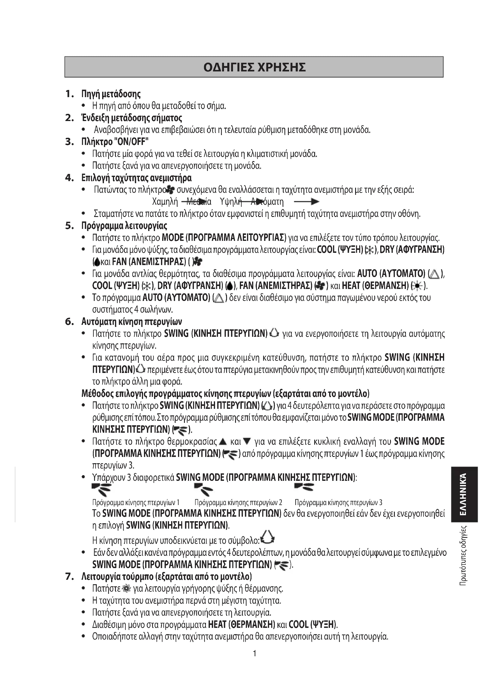 ΟΔΗΓΙΕΣ ΧΡΗΣΗΣ Πηγή μετάδοσης Η πηγή από όπου θα μεταδοθεί το σήμα. Ένδειξη μετάδοσης σήματος Αναβοσβήνει για να επιβεβαιώσει ότι η τελευταία ρύθμιση μεταδόθηκε στη μονάδα. Πλήκτρο "ON/OFF" Πατήστε μία φορά για να τεθεί σε λειτουργία η κλιματιστική μονάδα. Πατήστε ξανά για να απενεργοποιήσετε τη μονάδα. Επιλογή ταχύτητας ανεμιστήρα Πατώντας το πλήκτρο συνεχόμενα θα εναλλάσσεται η ταχύτητα ανεμιστήρα με την εξής σειρά: Χαμηλή Μεσαία Υψηλή Αυτόματη Σταματήστε να πατάτε το πλήκτρο όταν εμφανιστεί η επιθυμητή ταχύτητα ανεμιστήρα στην οθόνη. Πρόγραμμα λειτουργίας Πατήστε το πλήκτρο MODE (ΠΡΟΓΡΑΜΜΑ ΛΕΙΤΟΥΡΓΙΑΣ) για να επιλέξετε τον τύπο τρόπου λειτουργίας. Για μονάδα μόνο ψύξης, τα διαθέσιμα προγράμματα λειτουργίας είναι: COOL (ΨΥΞΗ) ( ), DRY (ΑΦΥΓΡΑΝΣΗ) ( ) και FAN (ΑΝΕΜΙΣΤΗΡΑΣ) ( ). Για μονάδα αντλίας θερμότητας, τα διαθέσιμα προγράμματα λειτουργίας είναι: AUTO (ΑΥΤΟΜΑΤΟ) ( ), COOL (ΨΥΞΗ) ( ), DRY (ΑΦΥΓΡΑΝΣΗ) ( ), FAN (ΑΝΕΜΙΣΤΗΡΑΣ) ( ) και HEAT (ΘΕΡΜΑΝΣΗ) ( ). Το πρόγραμμα AUTO (ΑΥΤΟΜΑΤΟ) ( ) δεν είναι διαθέσιμο για σύστημα παγωμένου νερού εκτός του συστήματος 4 σωλήνων. Αυτόματη κίνηση πτερυγίων Πατήστε το πλήκτρο SWING (ΚΙΝΗΣΗ ΠΤΕΡΥΓΙΩΝ) για να ενεργοποιήσετε τη λειτουργία αυτόματης κίνησης πτερυγίων. Για κατανομή του αέρα προς μια συγκεκριμένη κατεύθυνση, πατήστε το πλήκτρο SWING (ΚΙΝΗΣΗ ΠΤΕΡΥΓΙΩΝ) περιμένετε έως ότου τα πτερύγια μετακινηθούν προς την επιθυμητή κατεύθυνση και πατήστε το πλήκτρο άλλη μια φορά. Μέθοδος επιλογής προγράμματος κίνησης πτερυγίων (εξαρτάται από το μοντέλο) Πατήστε το πλήκτρο SWING (ΚΙΝΗΣΗ ΠΤΕΡΥΓΙΩΝ) ( ) για 4 δευτερόλεπτα για να περάσετε στο πρόγραμμα ρύθμισης επί τόπου. Στο πρόγραμμα ρύθμισης επί τόπου θα εμφανίζεται μόνο το SWING MODE (ΠΡΟΓΡΑΜΜΑ ΚΙΝΗΣΗΣ ΠΤΕΡΥΓΙΩΝ) ( ). Πατήστε το πλήκτρο θερμοκρασίας και για να επιλέξετε κυκλική εναλλαγή του SWING MODE (ΠΡΟΓΡΑΜΜΑ ΚΙΝΗΣΗΣ ΠΤΕΡΥΓΙΩΝ) ( ) από πρόγραμμα κίνησης πτερυγίων 1 έως πρόγραμμα κίνησης πτερυγίων 3. Υπάρχουν 3 διαφορετικά SWING MODE (ΠΡΟΓΡΑΜΜΑ ΚΙΝΗΣΗΣ ΠΤΕΡΥΓΙΩΝ): Πρόγραμμα κίνησης πτερυγίων 1 Πρόγραμμα κίνησης πτερυγίων 2 Πρόγραμμα κίνησης πτερυγίων 3 Το SWING MODE (ΠΡΟΓΡΑΜΜΑ ΚΙΝΗΣΗΣ ΠΤΕΡΥΓΙΩΝ) δεν θα ενεργοποιηθεί εάν δεν έχει ενεργοποιηθεί η επιλογή SWING (ΚΙΝΗΣΗ ΠΤΕΡΥΓΙΩΝ). Η κίνηση πτερυγίων υποδεικνύεται με το σύμβολο: Εάν δεν αλλάξει κανένα πρόγραμμα εντός 4 δευτερολέπτων, η μονάδα θα λειτουργεί σύμφωνα με το επιλεγμένο SWING MODE (ΠΡΟΓΡΑΜΜΑ ΚΙΝΗΣΗΣ ΠΤΕΡΥΓΙΩΝ) (