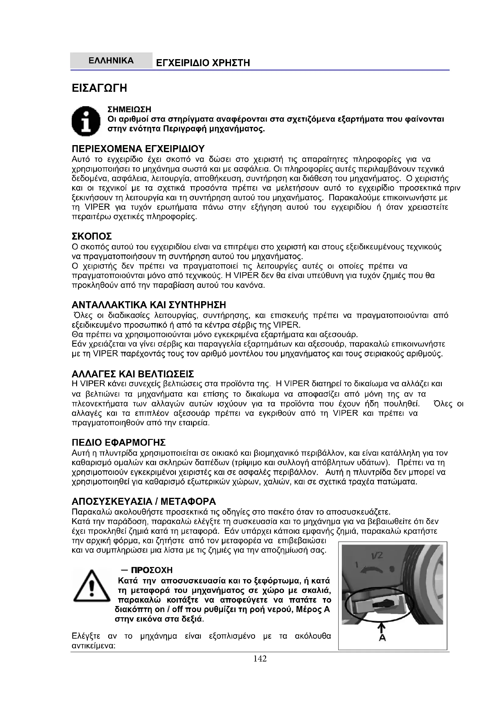 Ο σκοπός αυτού του εγχειριδίου είναι να επιτρέψει στο χειριστή και στους εξειδικευµένους τεχνικούς να πραγµατοποιήσουν τη συντήρηση αυτού του µηχανήµατος. Ο χειριστής δεν πρέπει να πραγµατοποιεί τις λειτουργίες αυτές οι οποίες πρέπει να πραγµατοποιούνται µόνο από τεχνικούς. Η VIPER δεν θα είναι υπεύθυνη για τυχόν ζηµιές που θα προκληθούν από την παραβίαση αυτού του κανόνα. ΑΝΤΑΛΛΑΚΤΙΚΑ ΚΑΙ ΣΥΝΤΗΡΗΣΗ Όλες οι διαδικασίες λειτουργίας, συντήρησης, και επισκευής πρέπει να πραγµατοποιούνται από εξειδικευµένο προσωπικό ή από τα κέντρα σέρβις της VIPER. Θα πρέπει να χρησιµοποιούνται µόνο εγκεκριµένα εξαρτήµατα και αξεσουάρ. Εάν χρειάζεται να γίνει σέρβις και παραγγελία εξαρτηµάτων και αξεσουάρ, παρακαλώ επικοινωνήστε µε τη VIPER παρέχοντάς τους τον αριθµό µοντέλου του µηχανήµατος και τους σειριακούς αριθµούς. ΑΛΛΑΓΕΣ ΚΑΙ ΒΕΛΤΙΩΣΕΙΣ H VIPER κάνει συνεχείς βελτιώσεις στα προϊόντα της. Η VIPER διατηρεί το δικαίωµα να αλλάζει και να βελτιώνει τα µηχανήµατα και επίσης το δικαίωµα να αποφασίζει από µόνη της αν τα πλεονεκτήµατα των αλλαγών αυτών ισχύουν για τα προϊόντα που έχουν ήδη πουληθεί. Όλες οι αλλαγές και τα επιπλέον αξεσουάρ πρέπει να εγκριθούν από τη VIPER και πρέπει να πραγµατοποιηθούν από την εταιρεία. ΠΕ∆ΙΟ ΕΦΑΡΜΟΓΗΣ Αυτή η πλυντρίδα χρησιµοποιείται σε οικιακό και βιοµηχανικό περιβάλλον, και είναι κατάλληλη για τον καθαρισµό οµαλών και σκληρών δαπέδων (τρίψιµο και συλλογή απόβλητων υδάτων). Πρέπει να τη χρησιµοποιούν εγκεκριµένοι χειριστές και σε ασφαλές περιβάλλον. Αυτή η πλυντρίδα δεν µπορεί να χρησιµοποιηθεί για καθαρισµό εξωτερικών χώρων, χαλιών, και σε σχετικά τραχέα πατώµατα. ΑΠΟΣΥΣΚΕΥΑΣΙΑ / ΜΕΤΑΦΟΡΑ Παρακαλώ ακολουθήστε προσεκτικά τις οδηγίες στο πακέτο όταν το αποσυσκευάζετε. Κατά την παράδοση, παρακαλώ ελέγξτε τη συσκευασία και το µηχάνηµα για να βεβαιωθείτε ότι δεν έχει προκληθεί ζηµιά κατά τη µεταφορά. Εάν υπάρχει κάποια εµφανής ζηµιά, παρακαλώ κρατήστε την αρχική φόρµα, και ζητήστε από τον µεταφορέα να επιβεβαιώσει και να συµπληρώσει µια λίστα µε τις ζηµιές για την αποζηµίωσή σας.