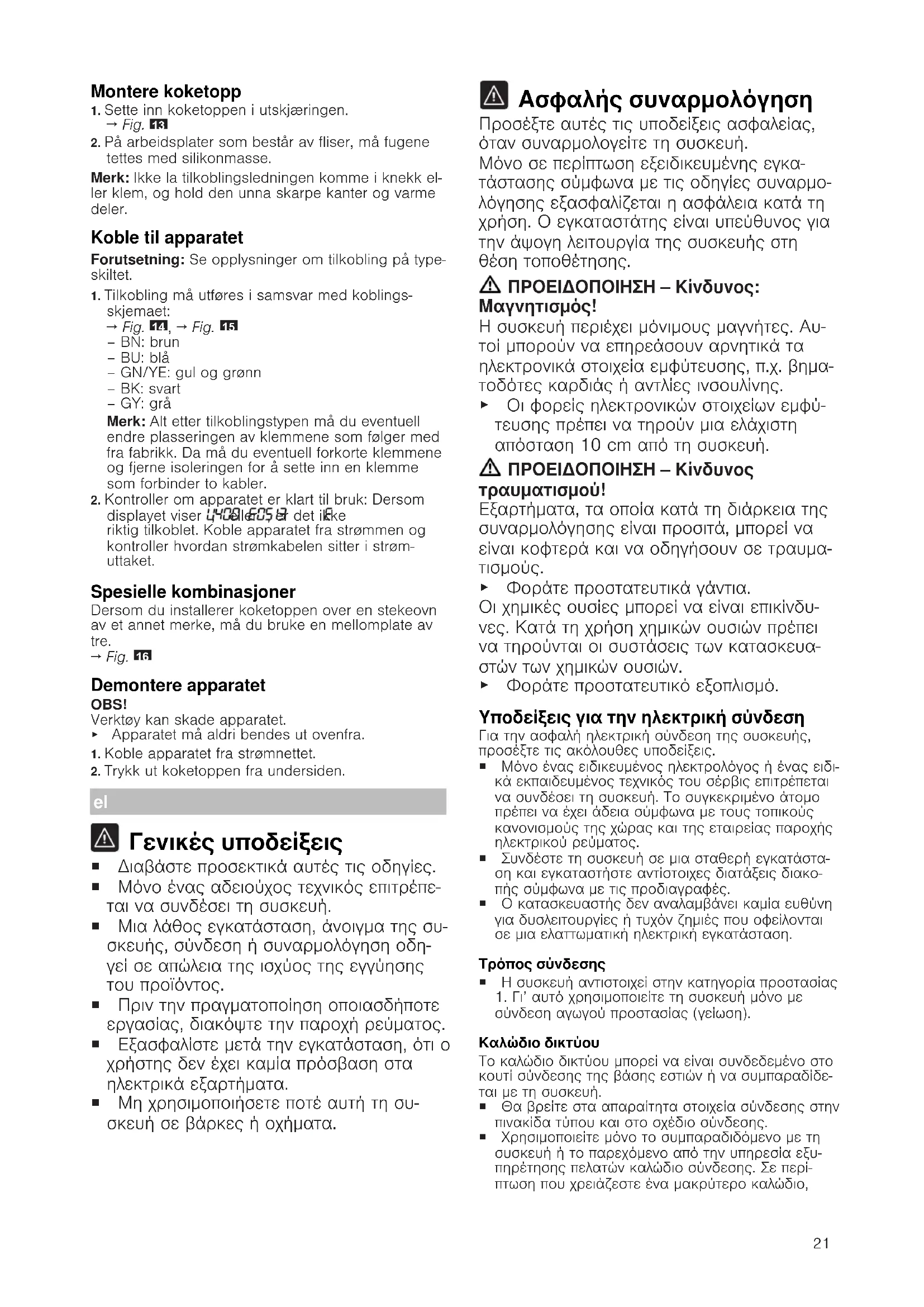 Γενικές υποδείξεις ¡ Διαβάστε προσεκτικά αυτές τις οδηγίες. ¡ Μόνο ένας αδειούχος τεχνικός επιτρέπε- ται να συνδέσει τη συσκευή. ¡ Μια λάθος εγκατάσταση, άνοιγμα της συ- σκευής, σύνδεση ή συναρμολόγηση οδη- γεί σε απώλεια της ισχύος της εγγύησης του προϊόντος. ¡ Πριν την πραγματοποίηση οποιασδήποτε εργασίας, διακόψτε την παροχή ρεύματος. ¡ Εξασφαλίστε μετά την εγκατάσταση, ότι ο χρήστης δεν έχει καμία πρόσβαση στα ηλεκτρικά εξαρτήματα. ¡ Μη χρησιμοποιήσετε ποτέ αυτή τη συ- σκευή σε βάρκες ή οχήματα. Ασφαλής συναρμολόγηση Προσέξτε αυτές τις υποδείξεις ασφαλείας, όταν συναρμολογείτε τη συσκευή. Μόνο σε περίπτωση εξειδικευμένης εγκα- τάστασης σύμφωνα με τις οδηγίες συναρμο- λόγησης εξασφαλίζεται η ασφάλεια κατά τη χρήση. Ο εγκαταστάτης είναι υπεύθυνος για την άψογη λειτουργία της συσκευής στη θέση τοποθέτησης. ΠΡΟΕΙΔΟΠΟΙΗΣΗ‒Κίνδυνος: Μαγνητισμός! Η συσκευή περιέχει μόνιμους μαγνήτες. Αυ- τοί μπορούν να επηρεάσουν αρνητικά τα ηλεκτρονικά στοιχεία εμφύτευσης, π.χ. βημα- τοδότες καρδιάς ή αντλίες ινσουλίνης. ▶ Οι φορείς ηλεκτρονικών στοιχείων εμφύ- τευσης πρέπει να τηρούν μια ελάχιστη απόσταση 10 cm από τη συσκευή. ΠΡΟΕΙΔΟΠΟΙΗΣΗ‒Κίνδυνος τραυματισμού! Εξαρτήματα, τα οποία κατά τη διάρκεια της συναρμολόγησης είναι προσιτά, μπορεί να είναι κοφτερά και να οδηγήσουν σε τραυμα-