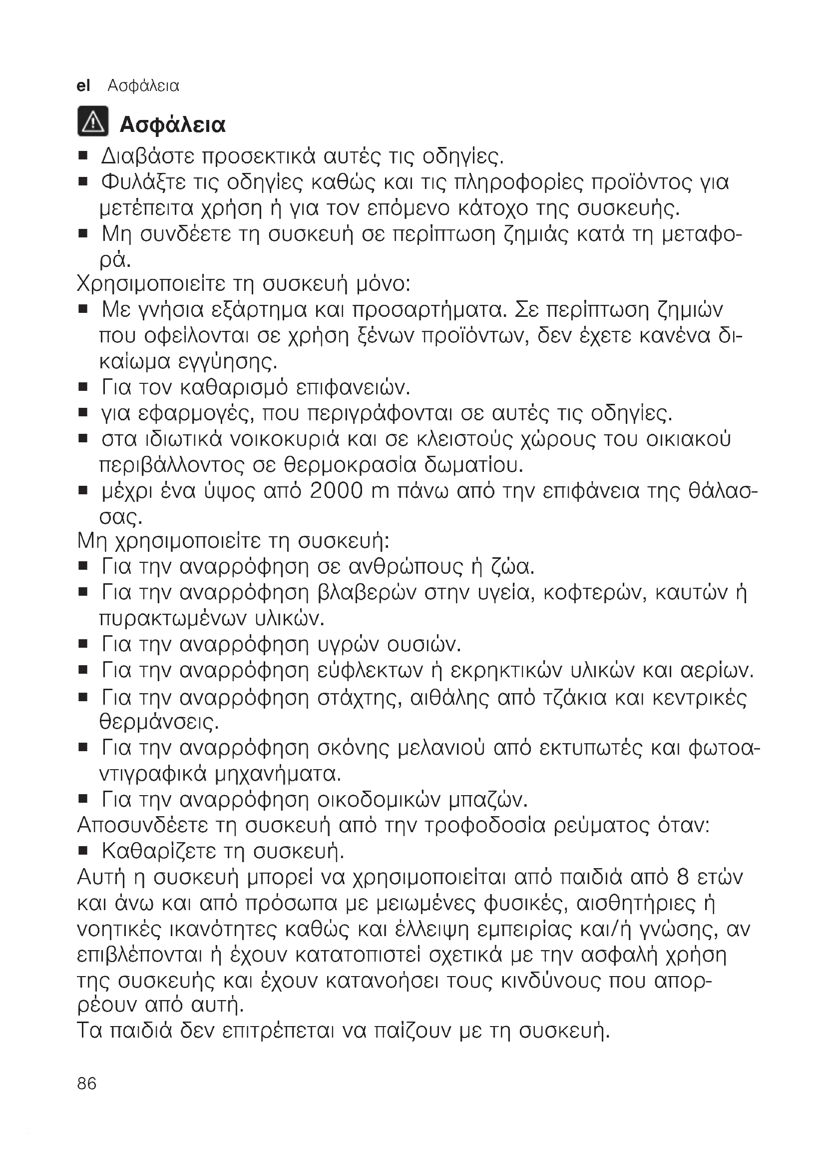 Μη χρησιμοποιείτε τη συσκευή: ¡ Για την αναρρόφηση σε ανθρώπους ή ζώα. ¡ Για την αναρρόφηση βλαβερών στην υγεία, κοφτερών, καυτών ή πυρακτωμένων υλικών. ¡ Για την αναρρόφηση υγρών ουσιών. ¡ Για την αναρρόφηση εύφλεκτων ή εκρηκτικών υλικών και αερίων. ¡ Για την αναρρόφηση στάχτης, αιθάλης από τζάκια και κεντρικές θερμάνσεις. ¡ Για την αναρρόφηση σκόνης μελανιού από εκτυπωτές και φωτοα- ντιγραφικά μηχανήματα. ¡ Για την αναρρόφηση οικοδομικών μπαζών. Αποσυνδέετε τη συσκευή από την τροφοδοσία ρεύματος όταν: ¡ Καθαρίζετε τη συσκευή. Αυτή η συσκευή μπορεί να χρησιμοποιείται από παιδιά από 8 ετών και άνω και από πρόσωπα με μειωμένες φυσικές, αισθητήριες ή νοητικές ικανότητες καθώς και έλλειψη εμπειρίας και/ή γνώσης, αν επιβλέπονται ή έχουν κατατοπιστεί σχετικά με την ασφαλή χρήση της συσκευής και έχουν κατανοήσει τους κινδύνους που απορ- ρέουν από αυτή. Τα παιδιά δεν επιτρέπεται να παίζουν με τη συσκευή.Ασφάλεια el