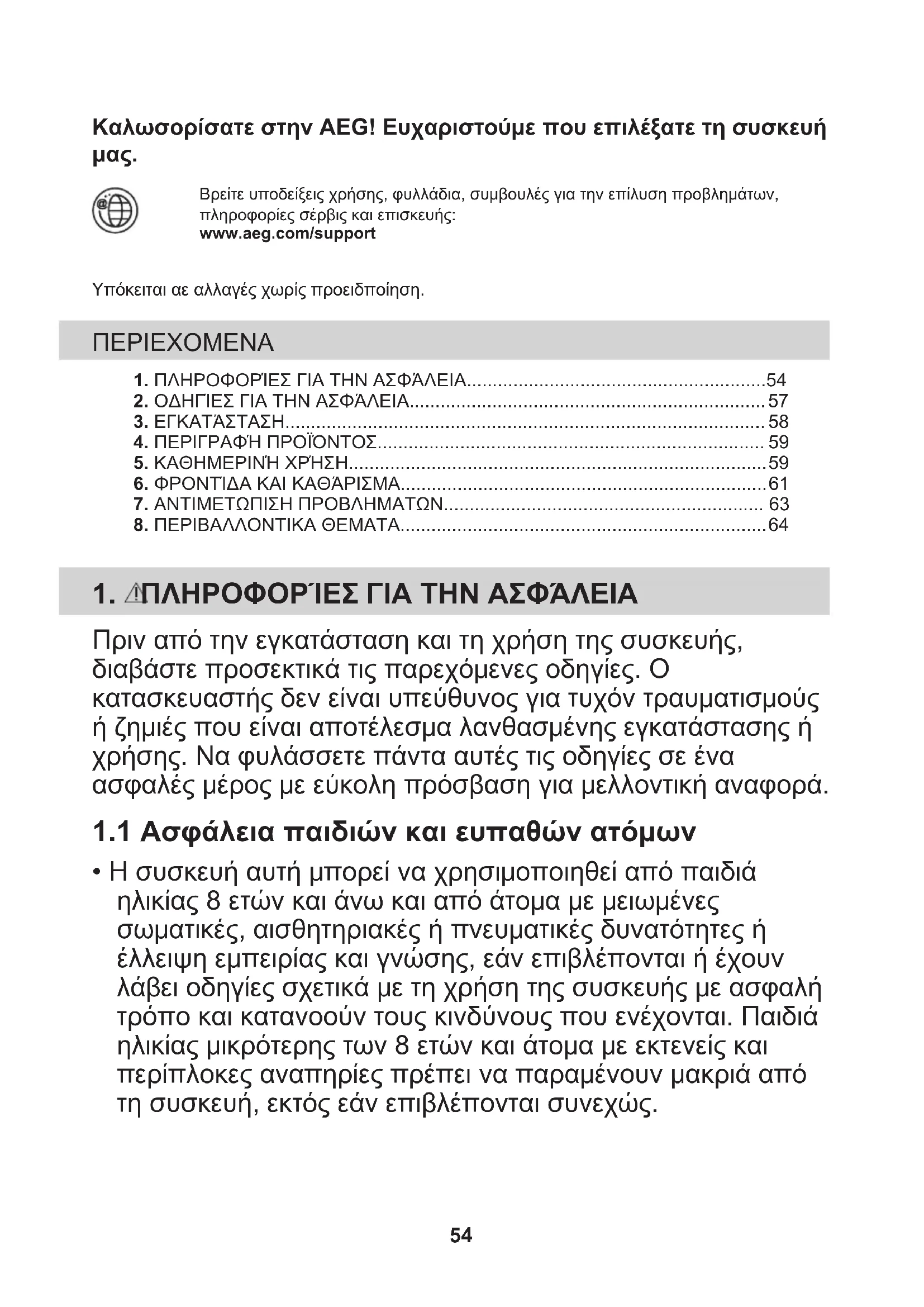 Βρείτε υποδείξεις χρήσης, φυλλάδια, συμβουλές για την επίλυση προβλημάτων,πληροφορίες σέρβις και επισκευής:www.aeg.com/supportΥπόκειται αε αλλαγές χωρίς προειδποίηση. ΠΕΡΙΕΧΟΜΕΝΑ